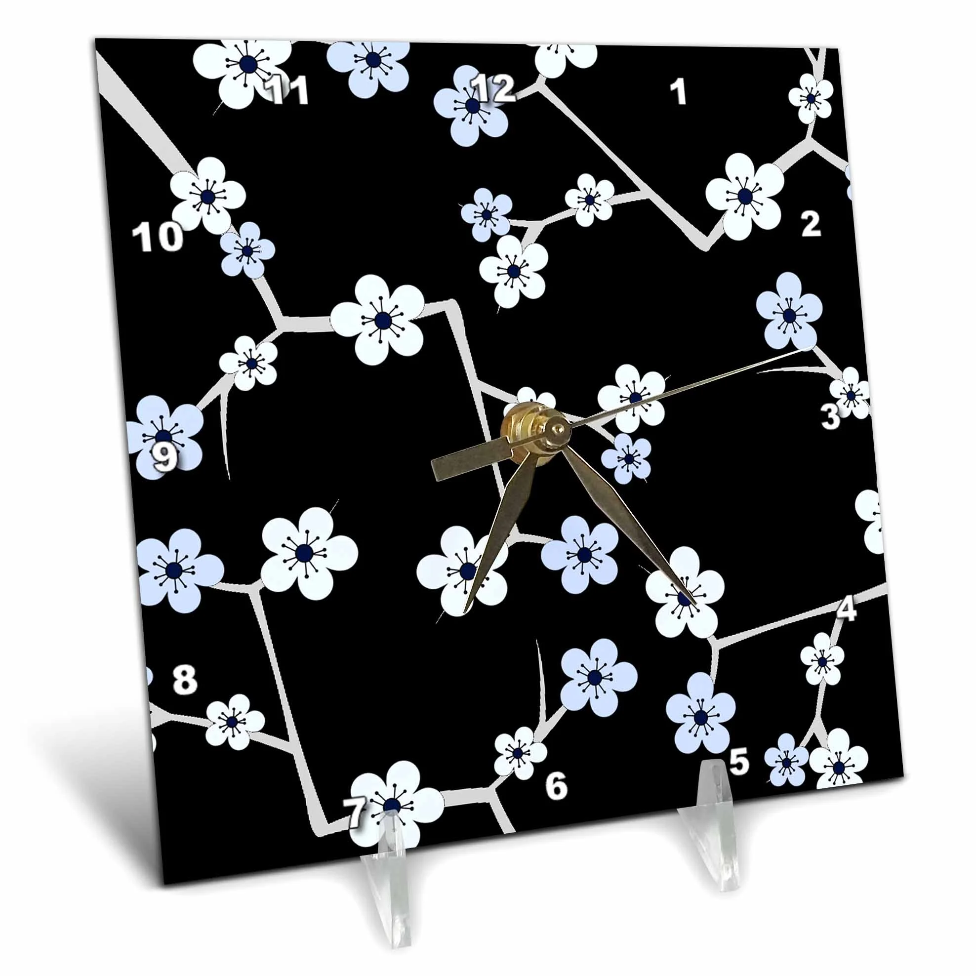 3dRose Delicate Cherry Blossoms Print - Blue on Black - Desk Clock, 6 by 6-inch
