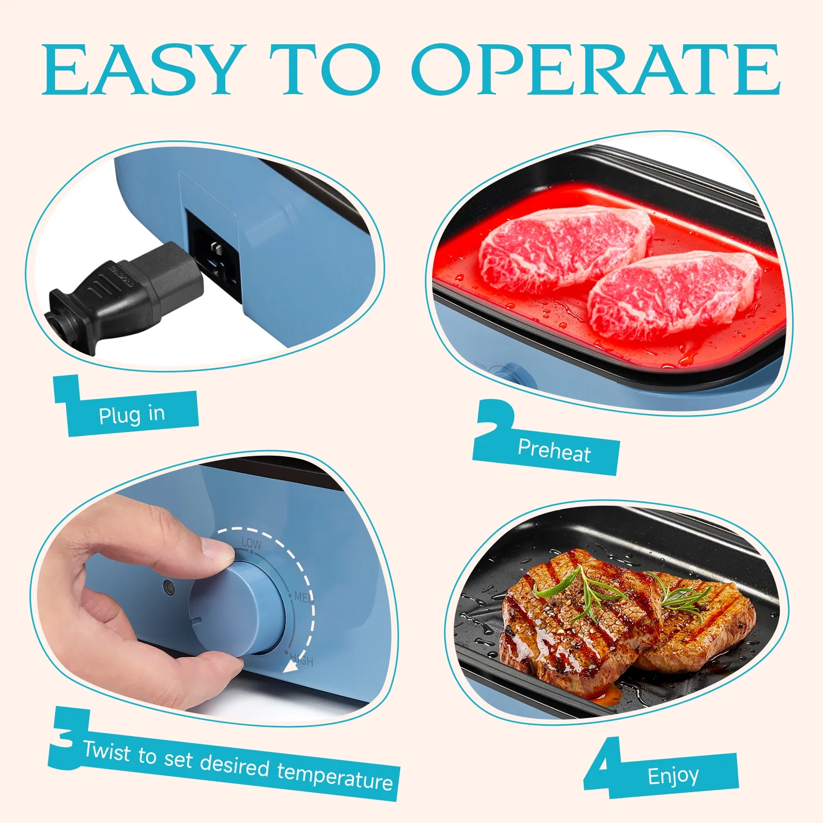 DENEST Electric Grill BBQ Hot Pot Pan Non-stick 2 Gear Power Stainless Steel Pink