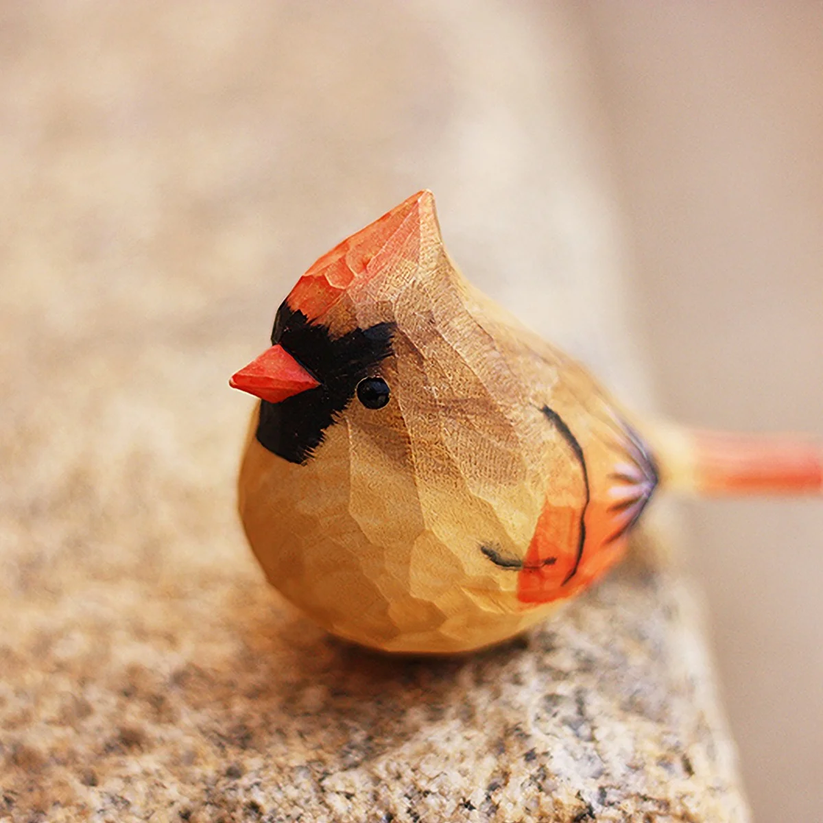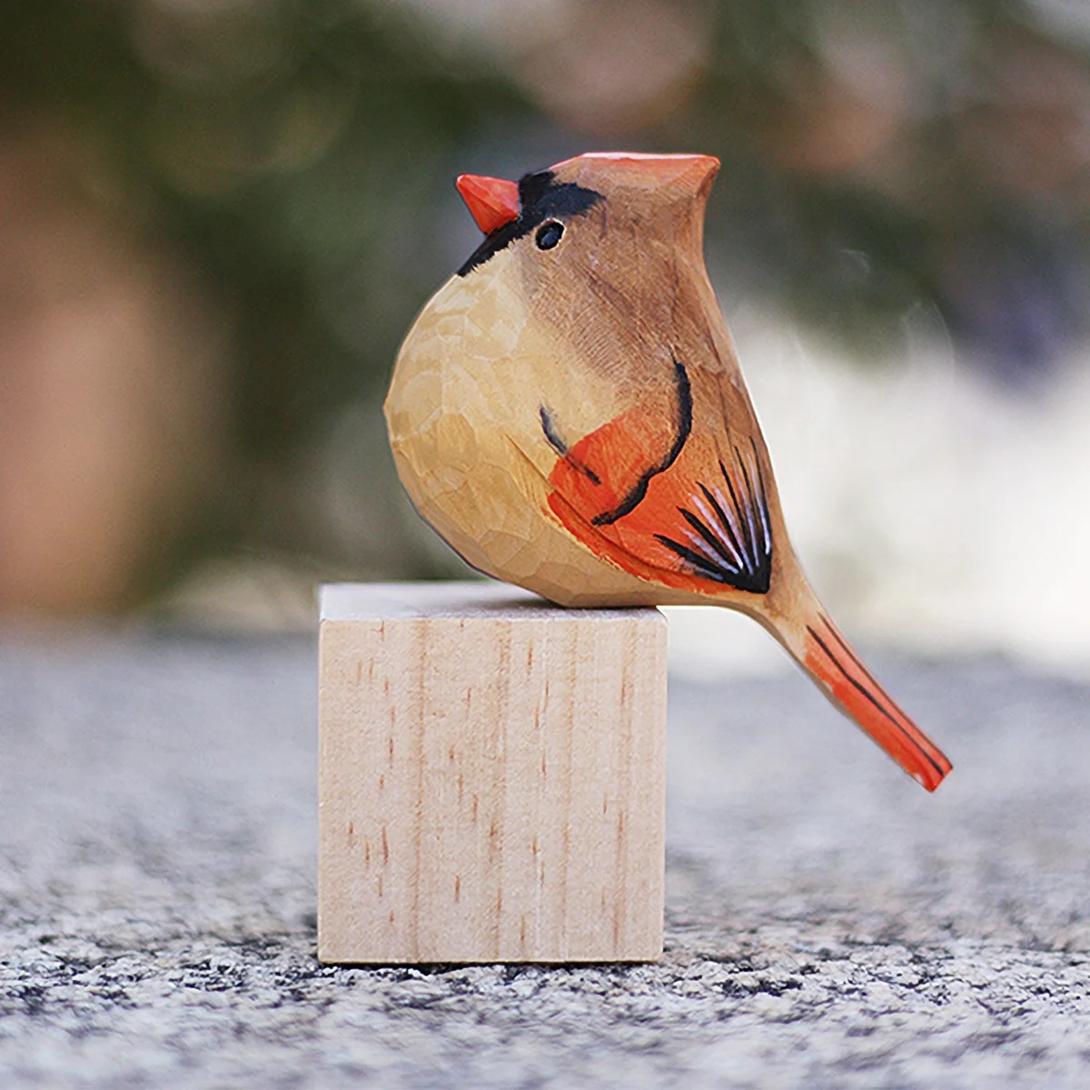 Female Cardinal Bird Wood Figurine - Holzlrgus Miniature Handmade Red Art Carved Small Animals Collectible Memorial Gift Bird Garden Ornaments