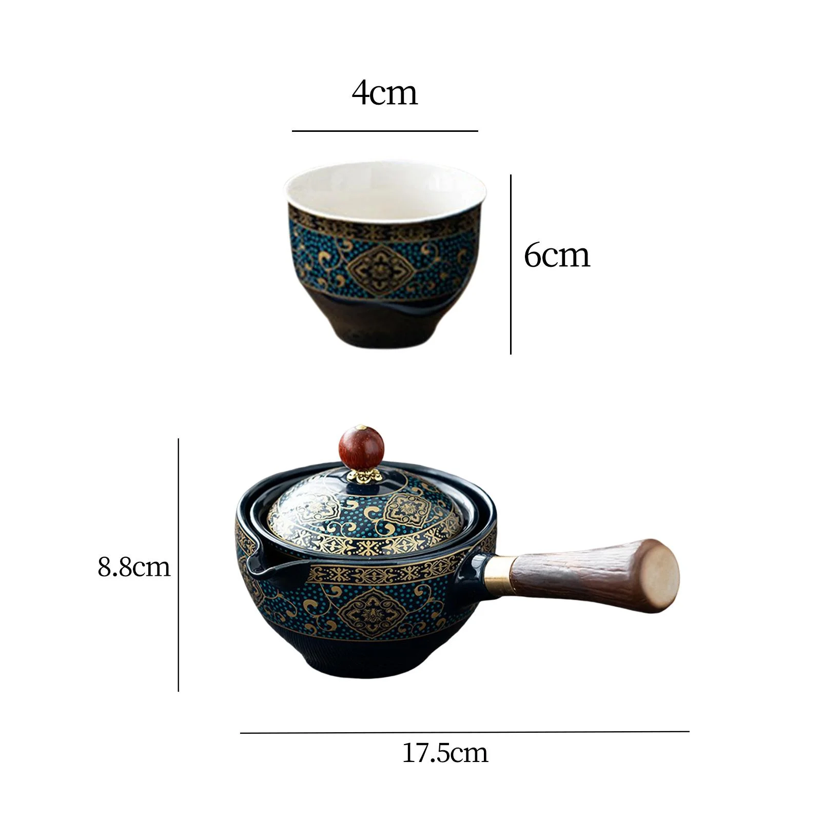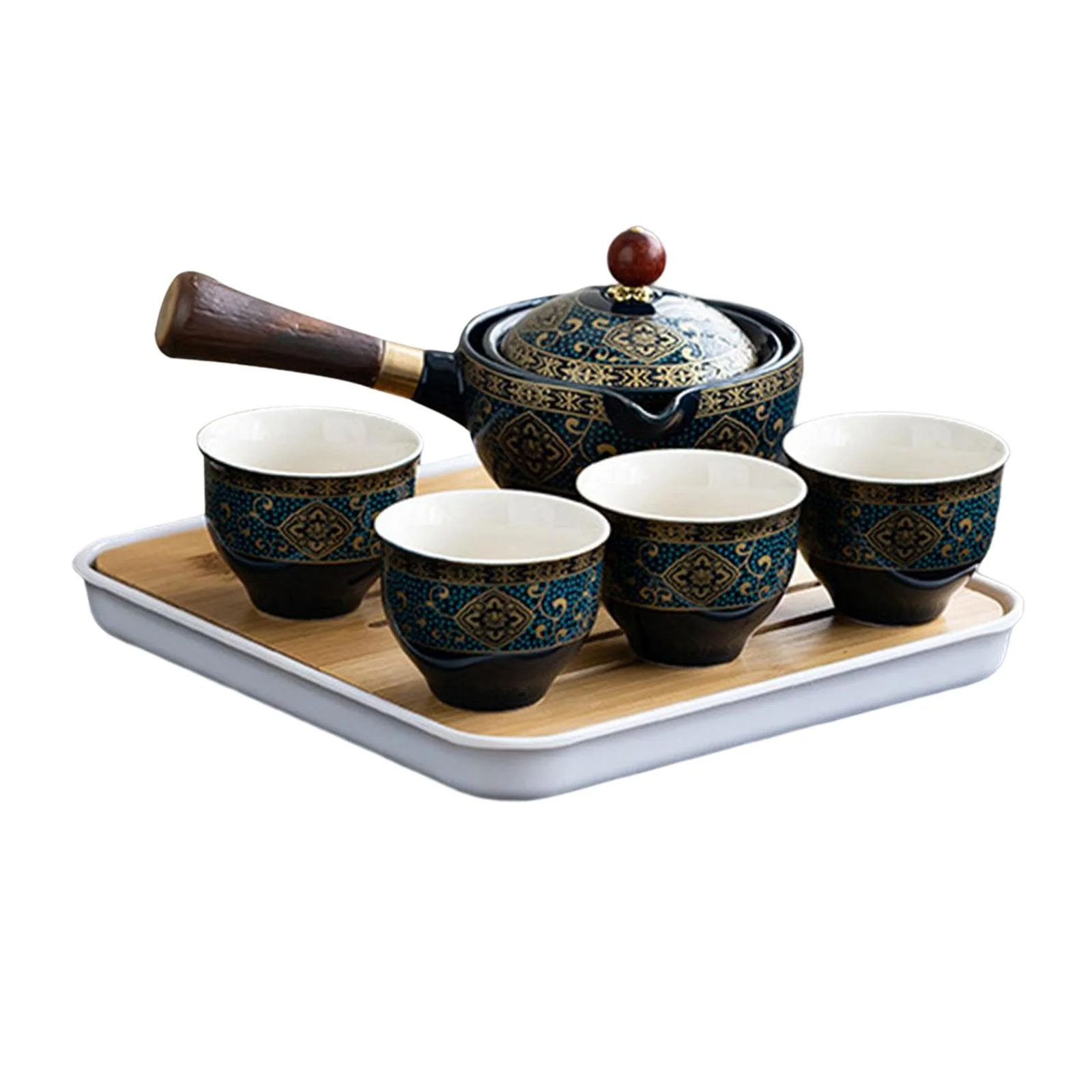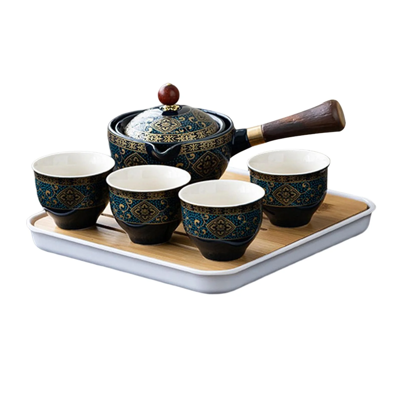 Ceramic Tea Kettle ,Removable Tea Dispenser, Handheld 360 Degree Rotation Side Handle Tea Maker ,Teapot for Travel ,Office ,Home Restaurant Party dark blue with cups