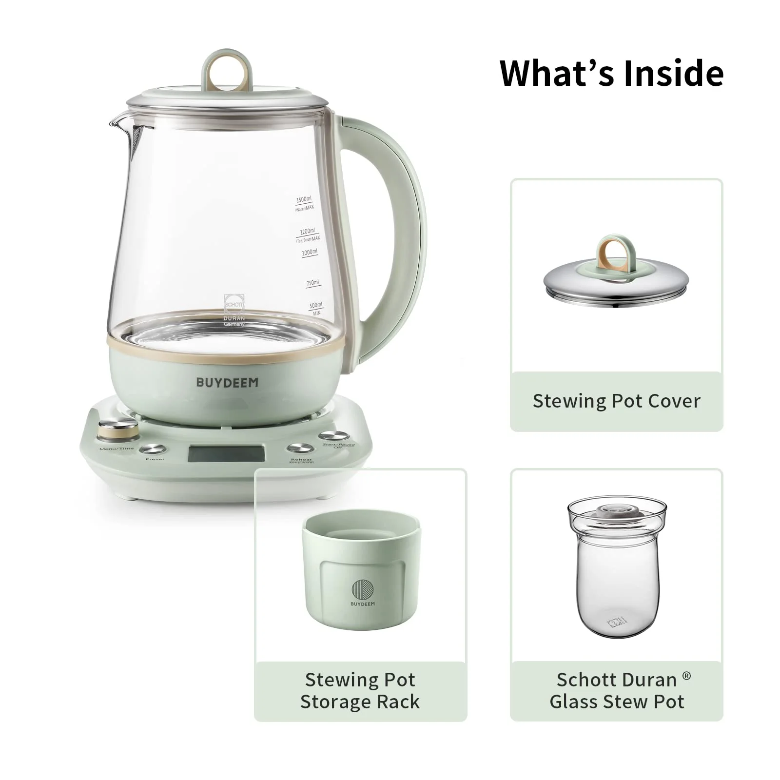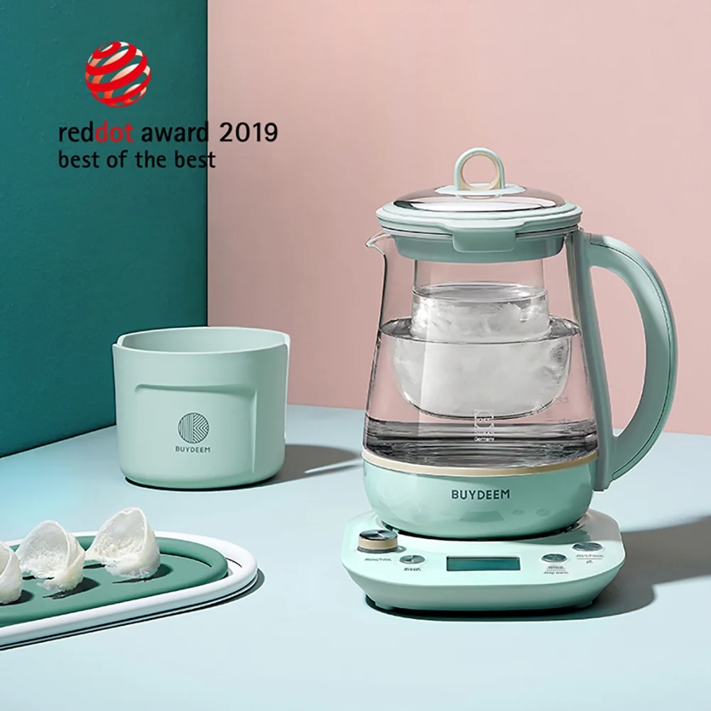 BUYDEEM Health Pot K2763 Lite, Glass Electric Kettle for Tea & Coffee, Water Boiler with Stew Pot, Temperature Control, Green, 1.5L