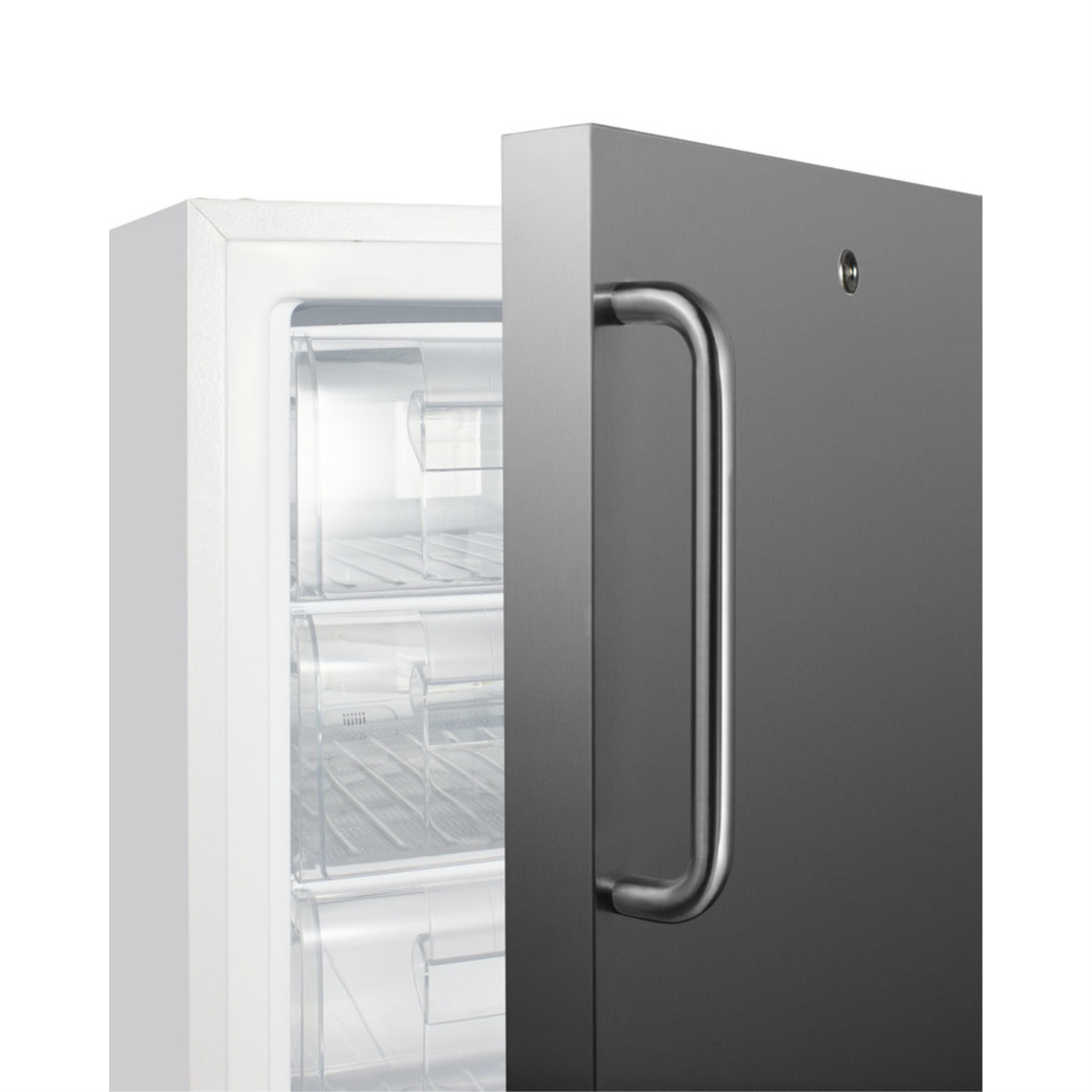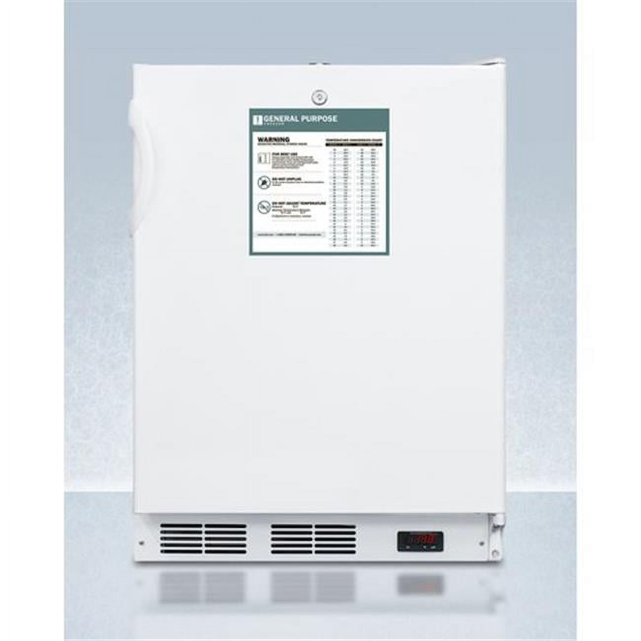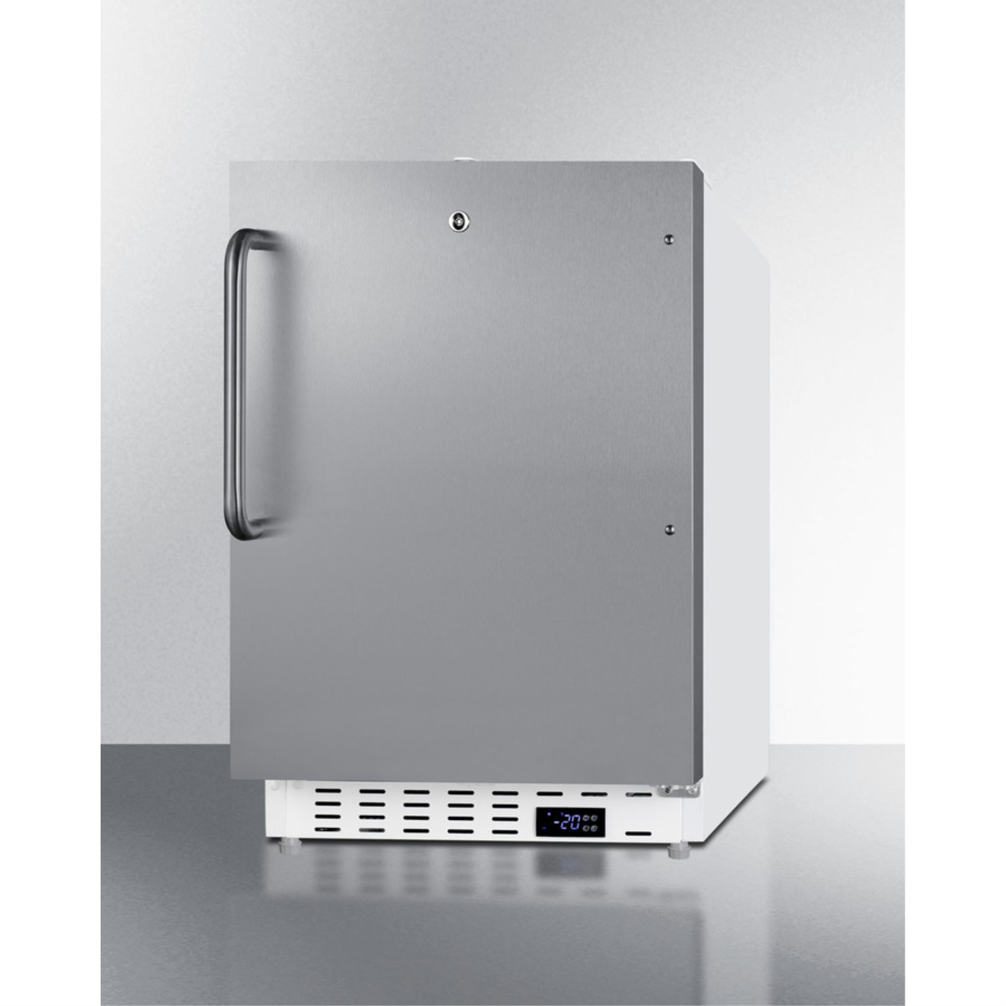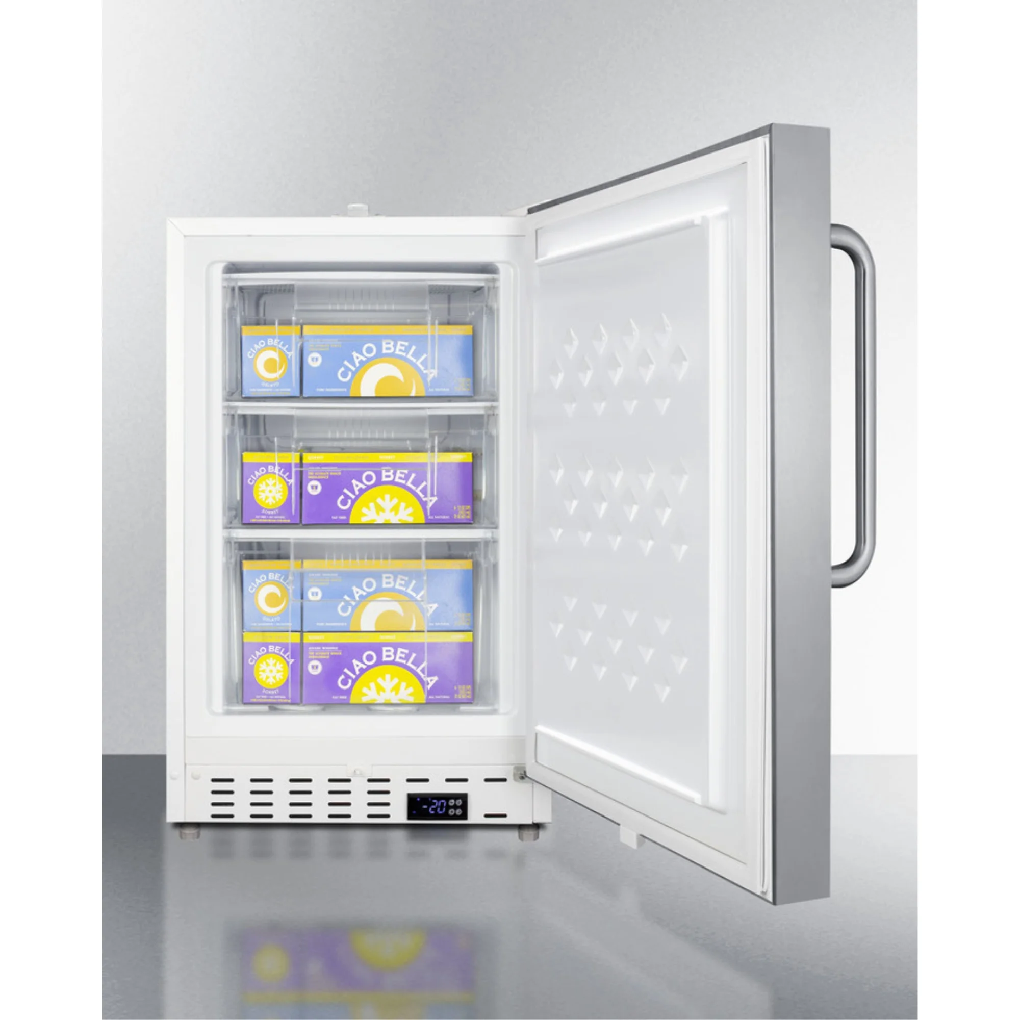 Commercially aproved undercounter ADA compliant all-freezer with white cabinet and stainless steel door