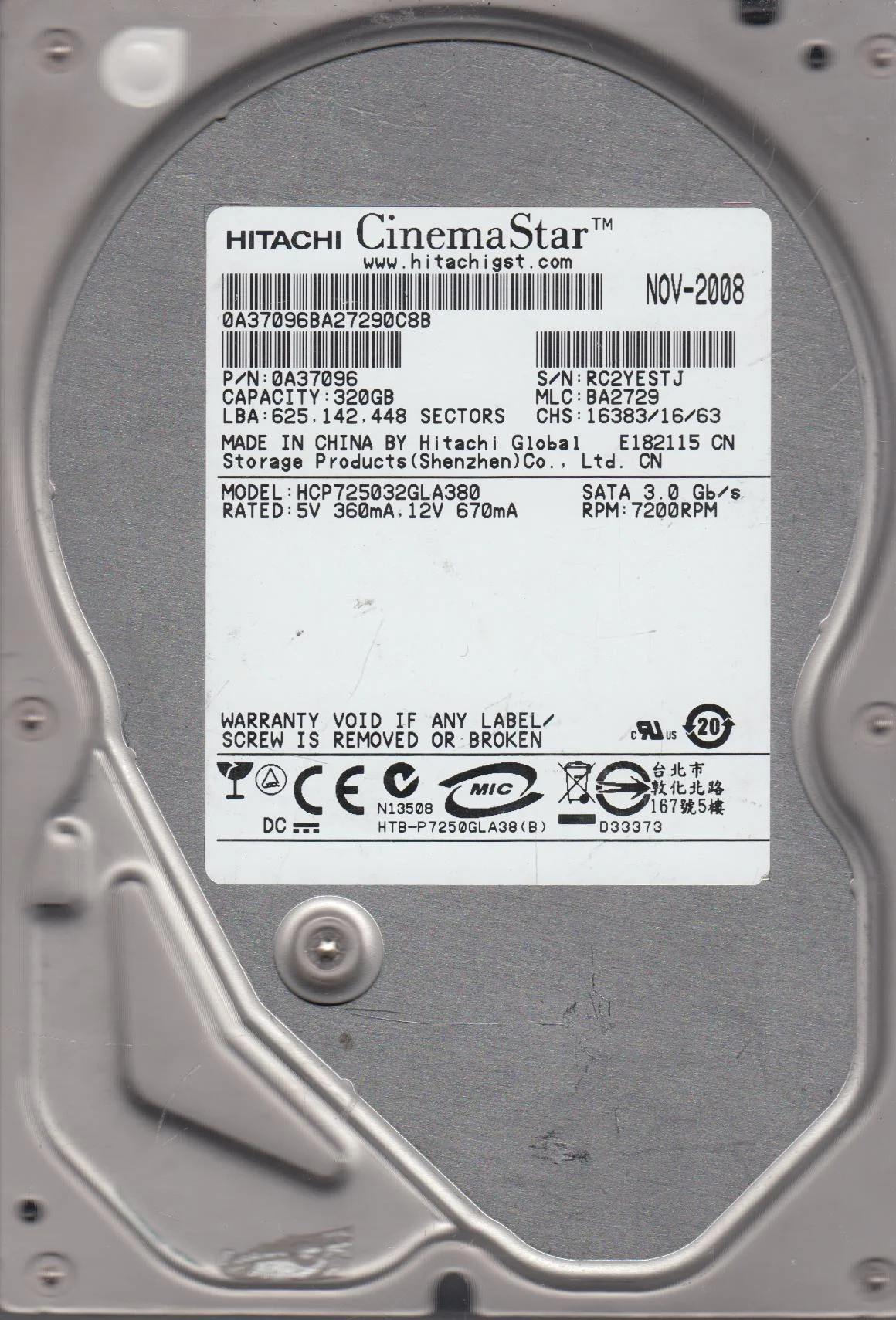 HCP725032GLA380, PN 0A37096, MLC BA2729, Hitachi 320GB SATA 3.5 Hard Drive