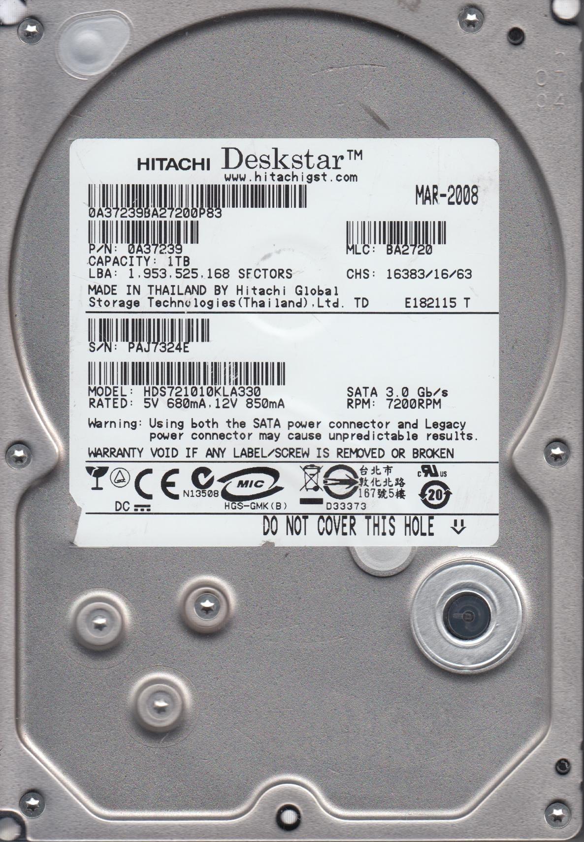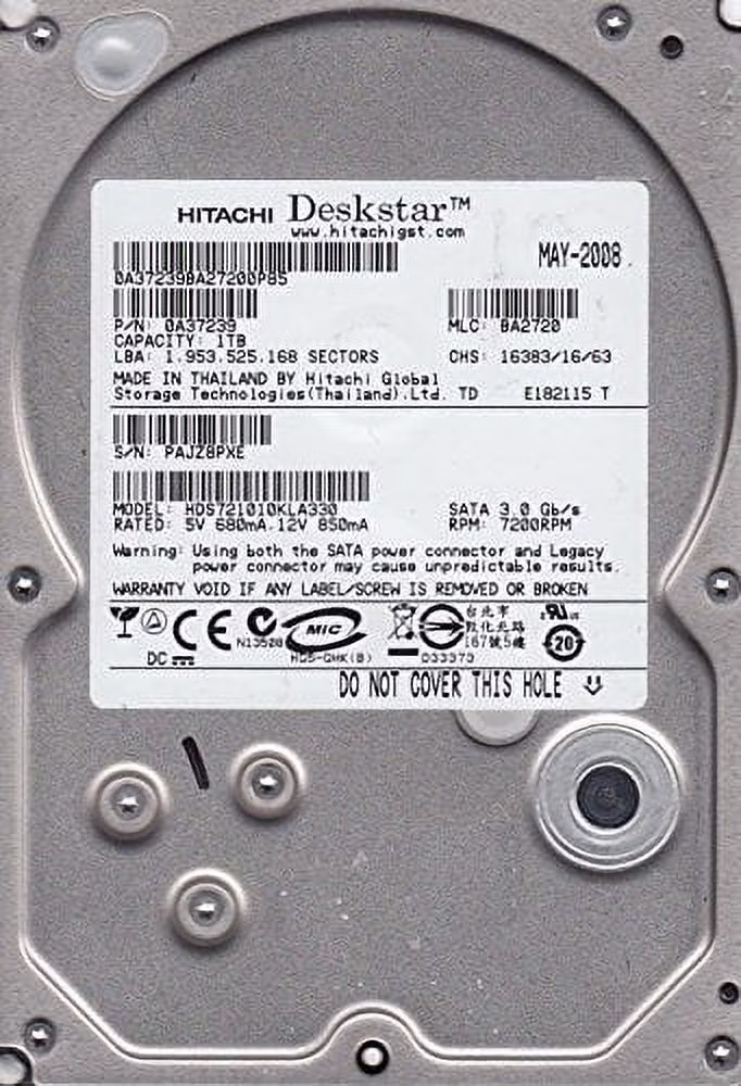 HDS721010KLA330, PN 0A37239, MLC BA2720, Hitachi 1TB SATA 3.5 Hard Drive