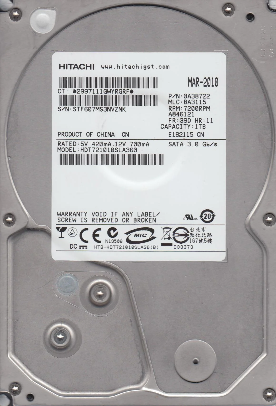 HDT721010SLA360, PN 0A38722, MLC BA3115, Hitachi 1TB SATA 3.5 Hard Drive