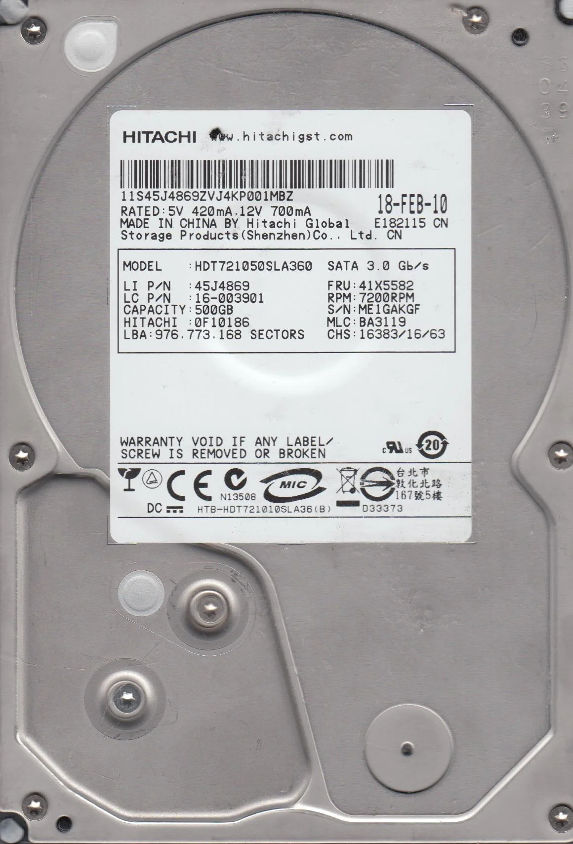 HDT721050SLA360, PN 0F10186, MLC BA3119, Hitachi 500GB SATA 3.5 Hard Drive