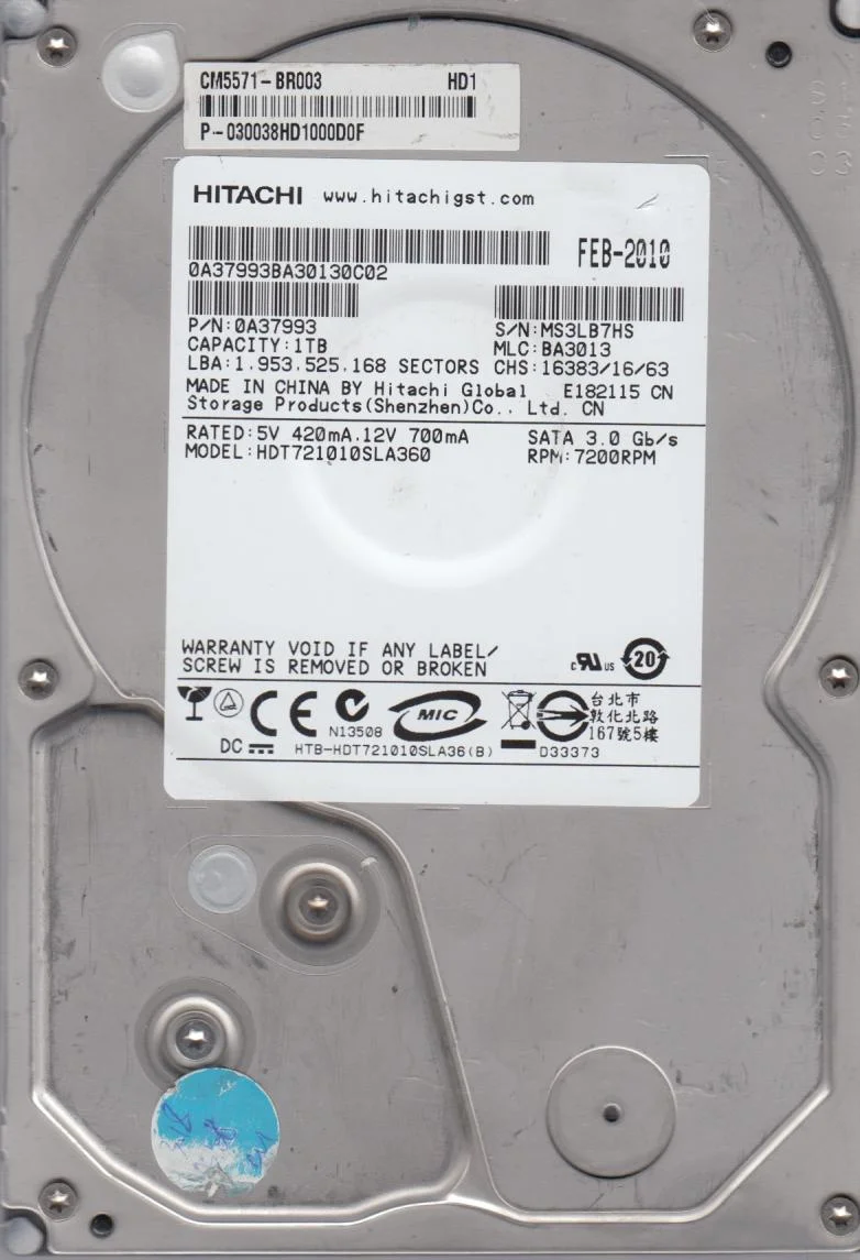 HDT721010SLA360, PN 0A37993, MLC BA3013, Hitachi 1TB SATA 3.5 Hard Drive