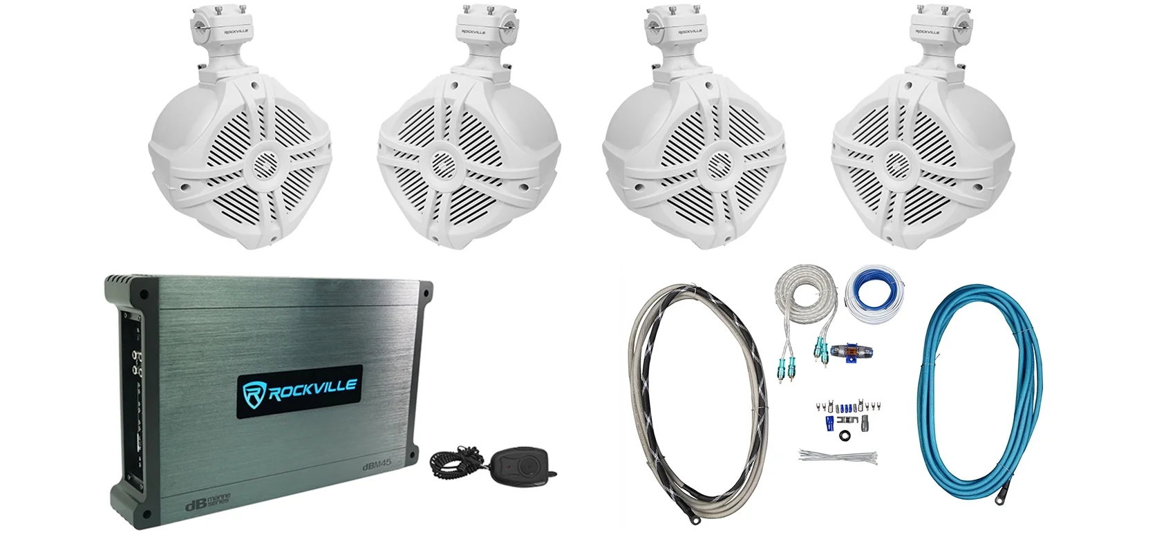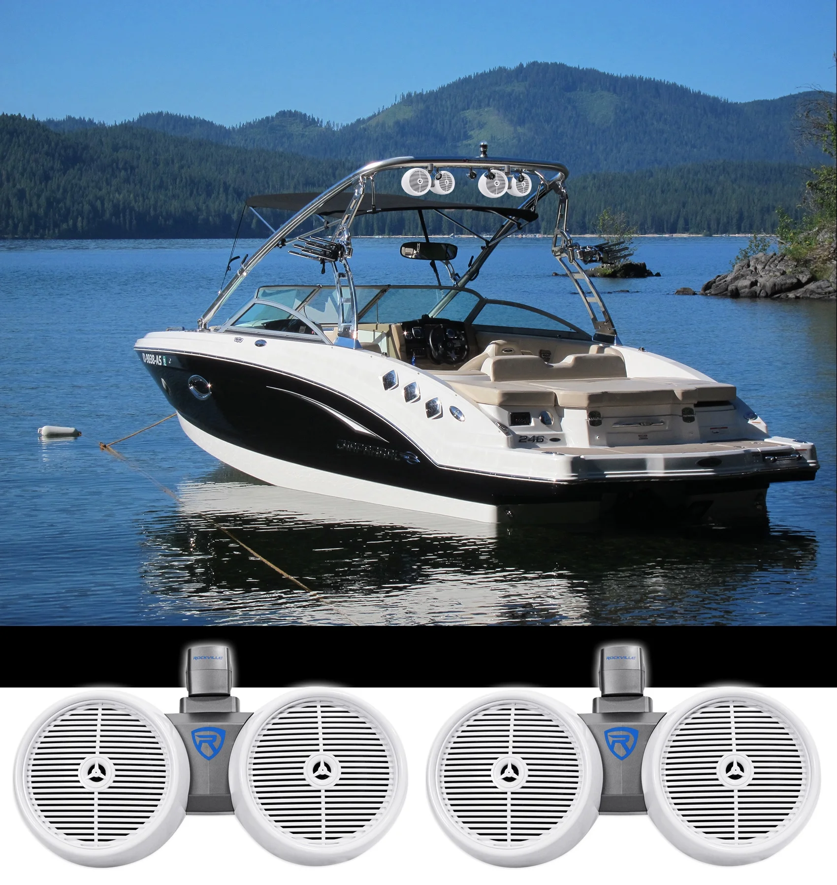 (4) Rockville RWB70W White 6.5" Marine Wakeboard Swivel Tower Speakers+Amplifier