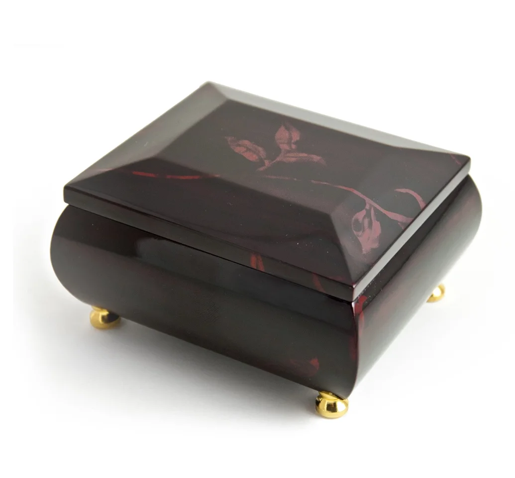 Stunning Burgundy Beveled Top Music Jewelry Box With Artistic Floral Motif - Allouette