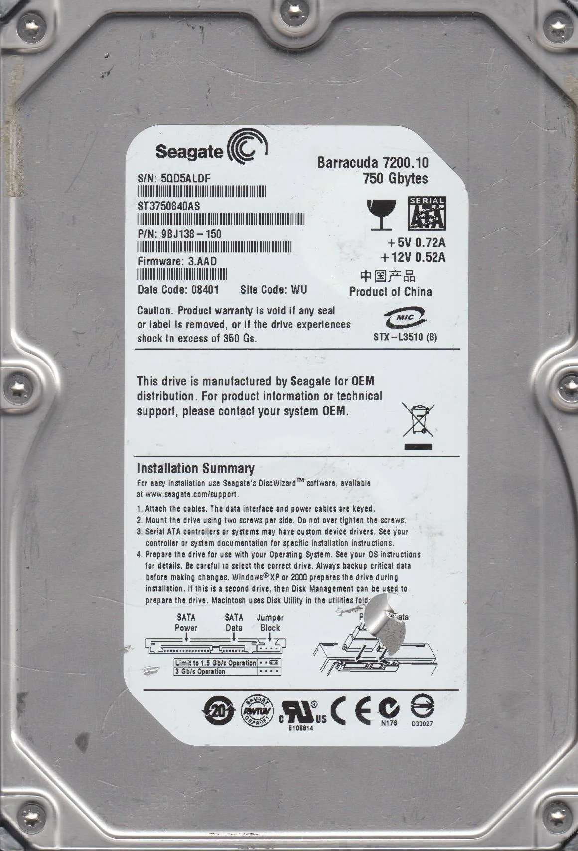 ST3750840AS, 5QD, WU, PN 9BJ138-150, FW 3.AAD, Seagate 750GB SATA 3.5 Hard Drive