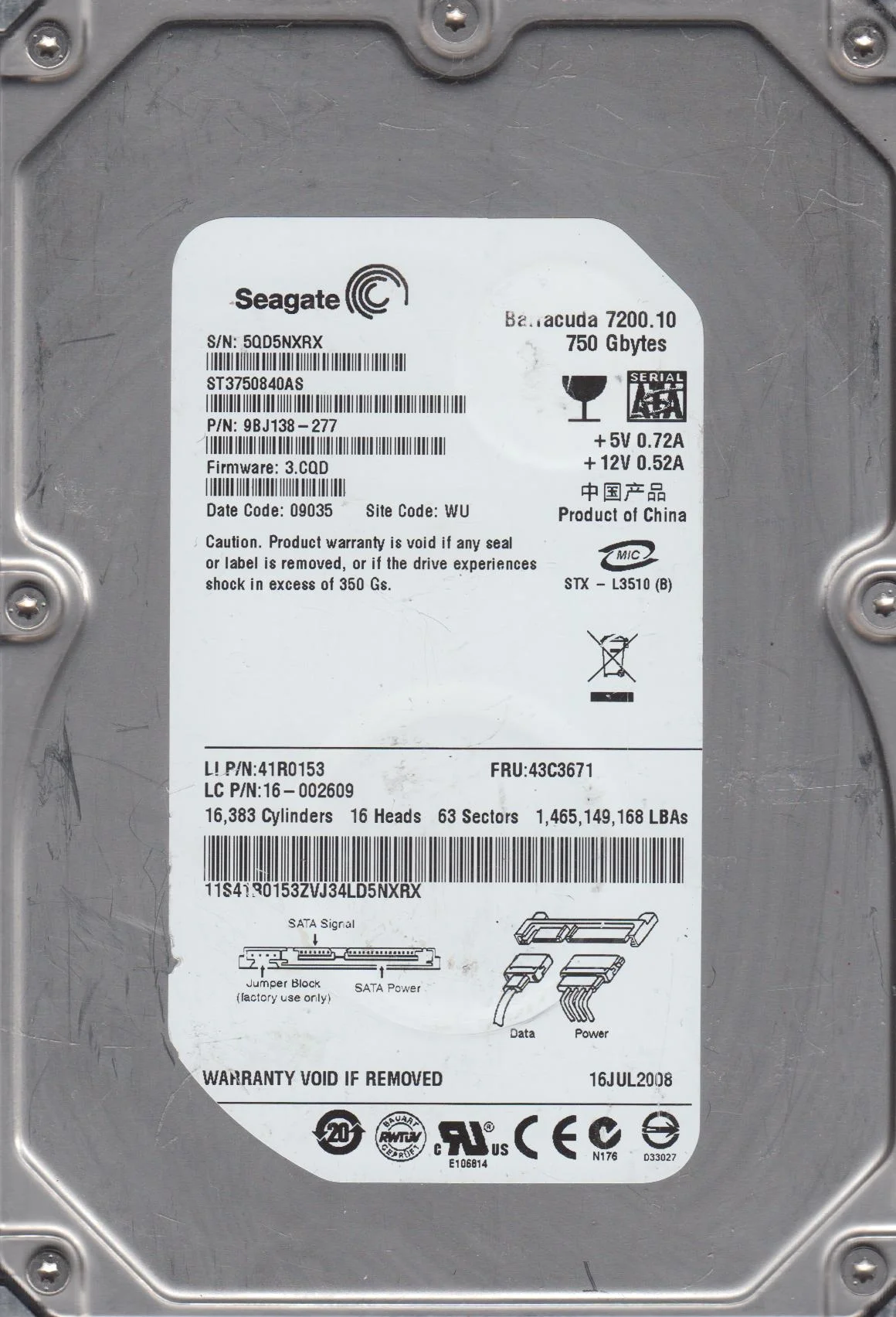 ST3750840AS, 5QD, WU, PN 9BJ138-277, FW 3.CQD, Seagate 750GB SATA 3.5 Hard Drive