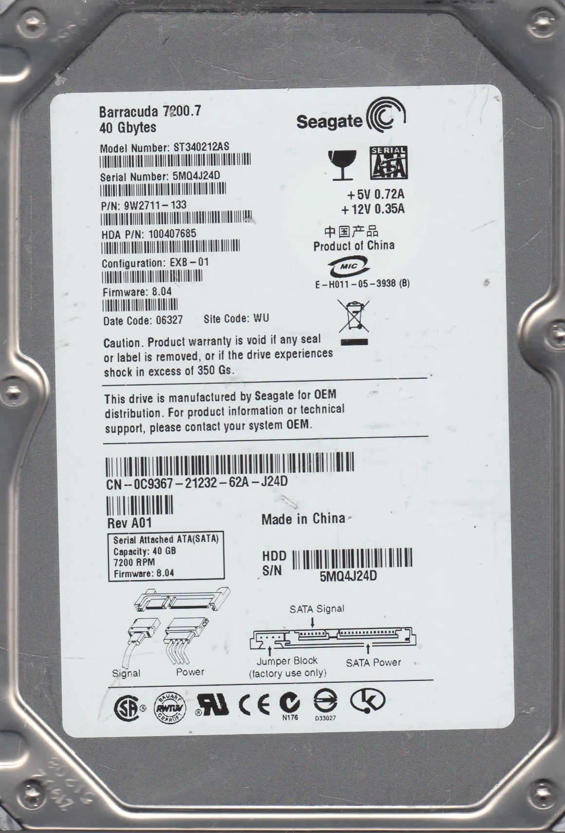 ST340212AS, 5MQ, WU, PN 9W2711-133, FW 8.04, Seagate 40GB SATA 3.5 Hard Drive