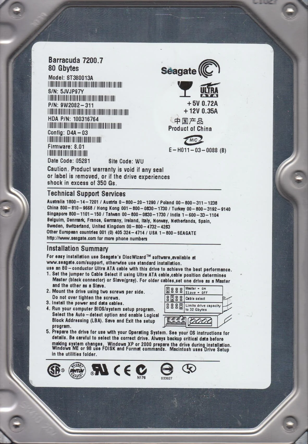 ST380013A, 5JV, WU, PN 9W2082-311, FW 8.01, Seagate 80GB IDE 3.5 Hard Drive