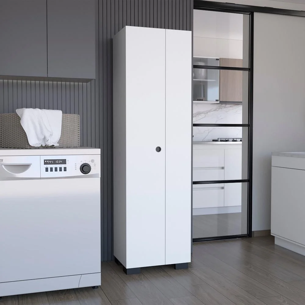 Depot E-Shop Broom Cabinet Double-Door Design with Inner Shelves and Side Hangers, White