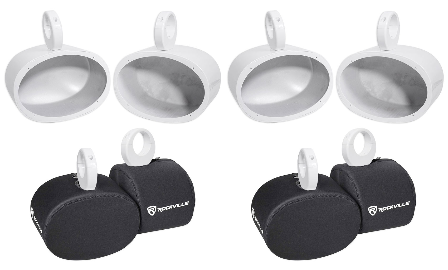 (4) Rockville MAC69W 6x9" White Aluminum Wakeboard Tower Speaker Pods+Covers