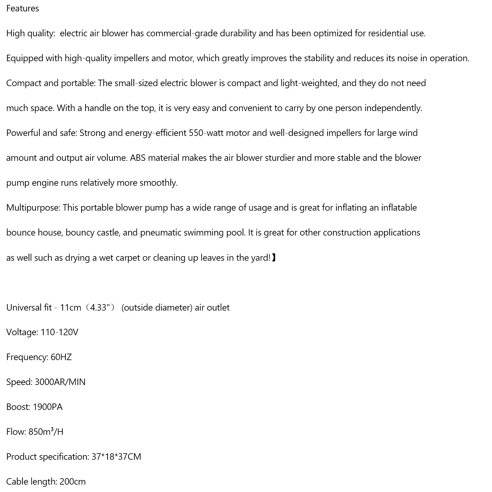 550 Watt Inflatable Bounce House Water slide Air Pump Blower Fan Inflatable castle
