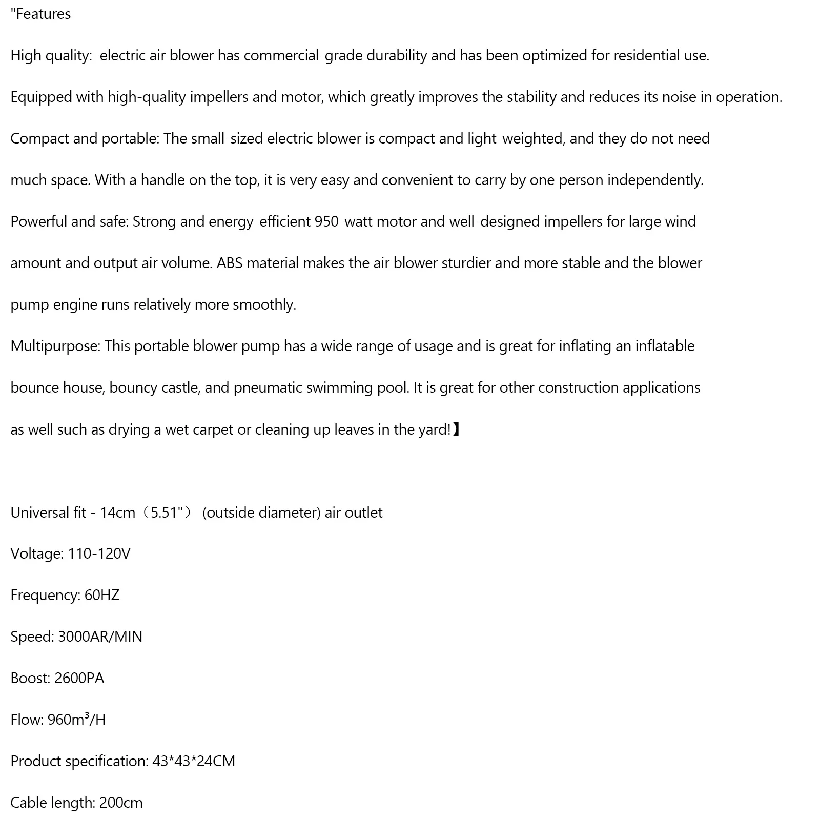 950 Watt Inflatable Bounce House Water slide Air Pump Blower Fan Inflatable castle