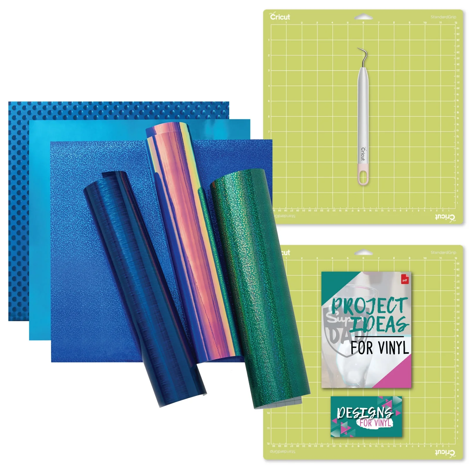 Cricut Holographic Blue Permanent Vinyl 6ct with Standard Grip Mat and Weeder Tool Bundle