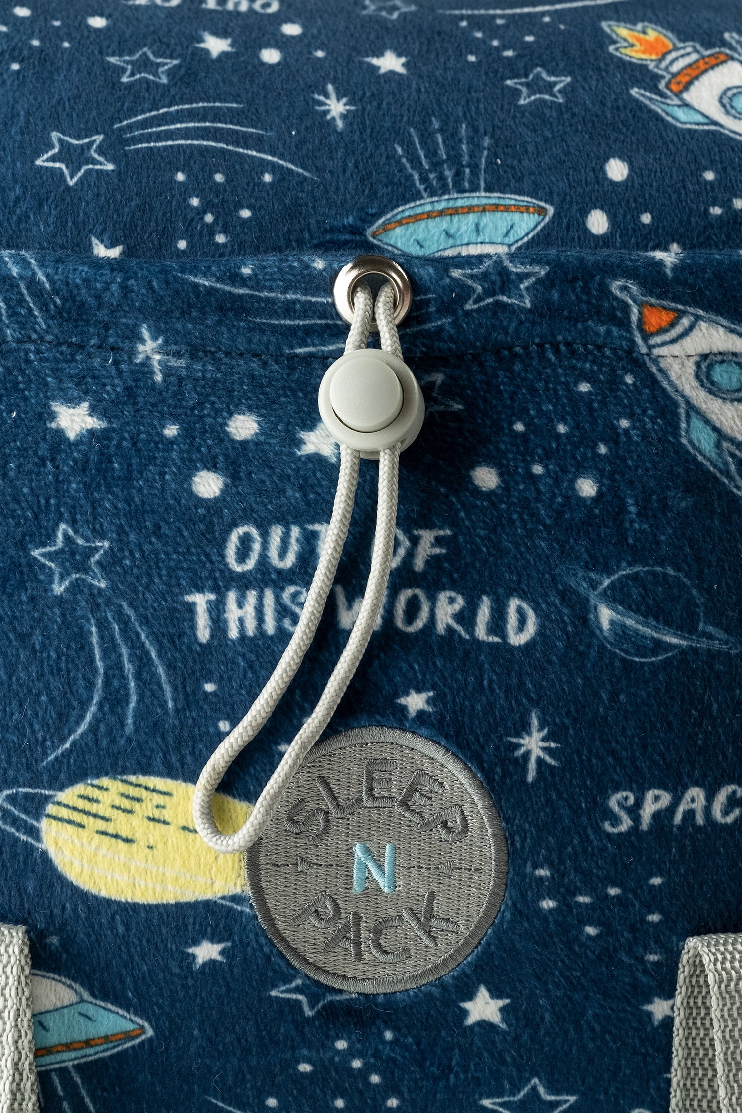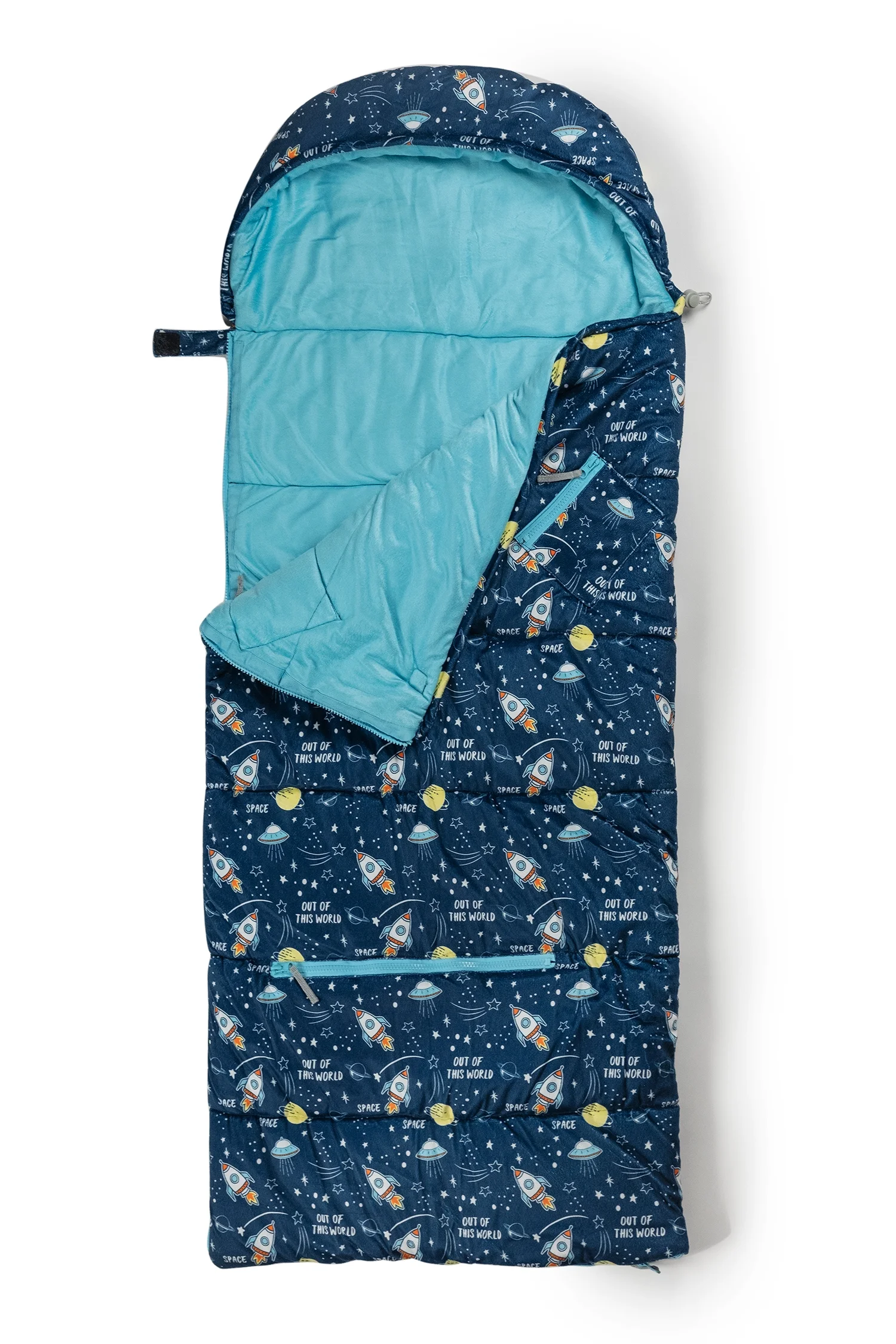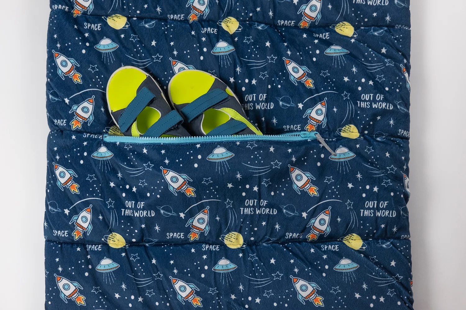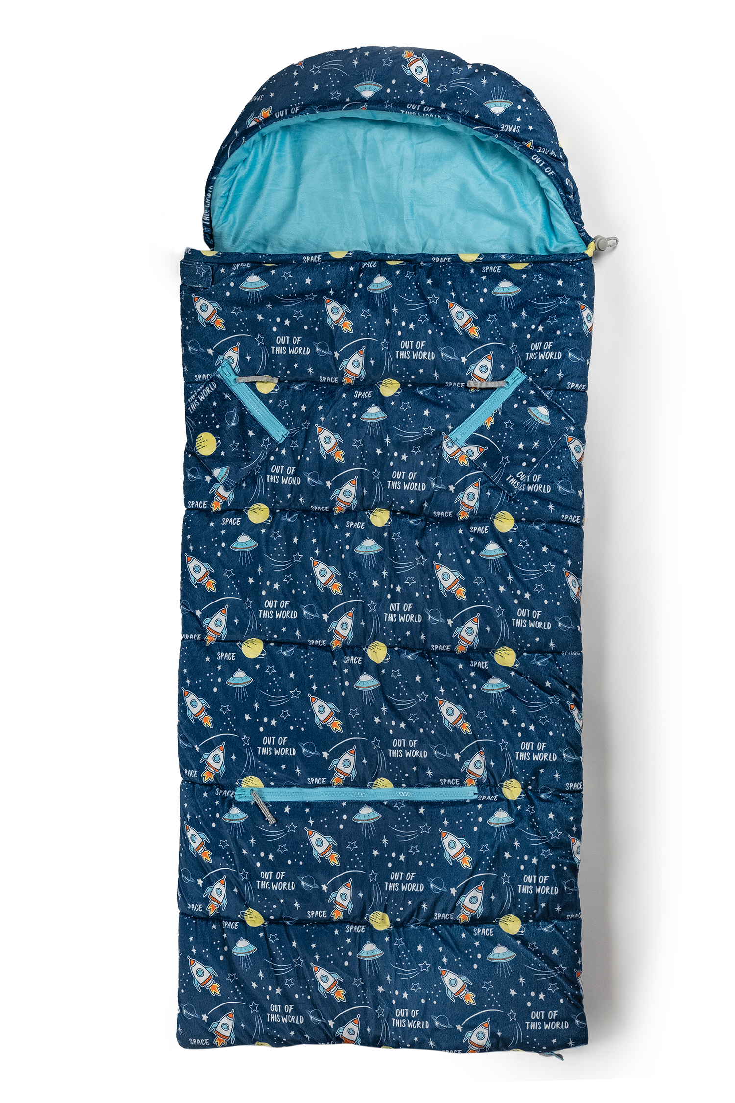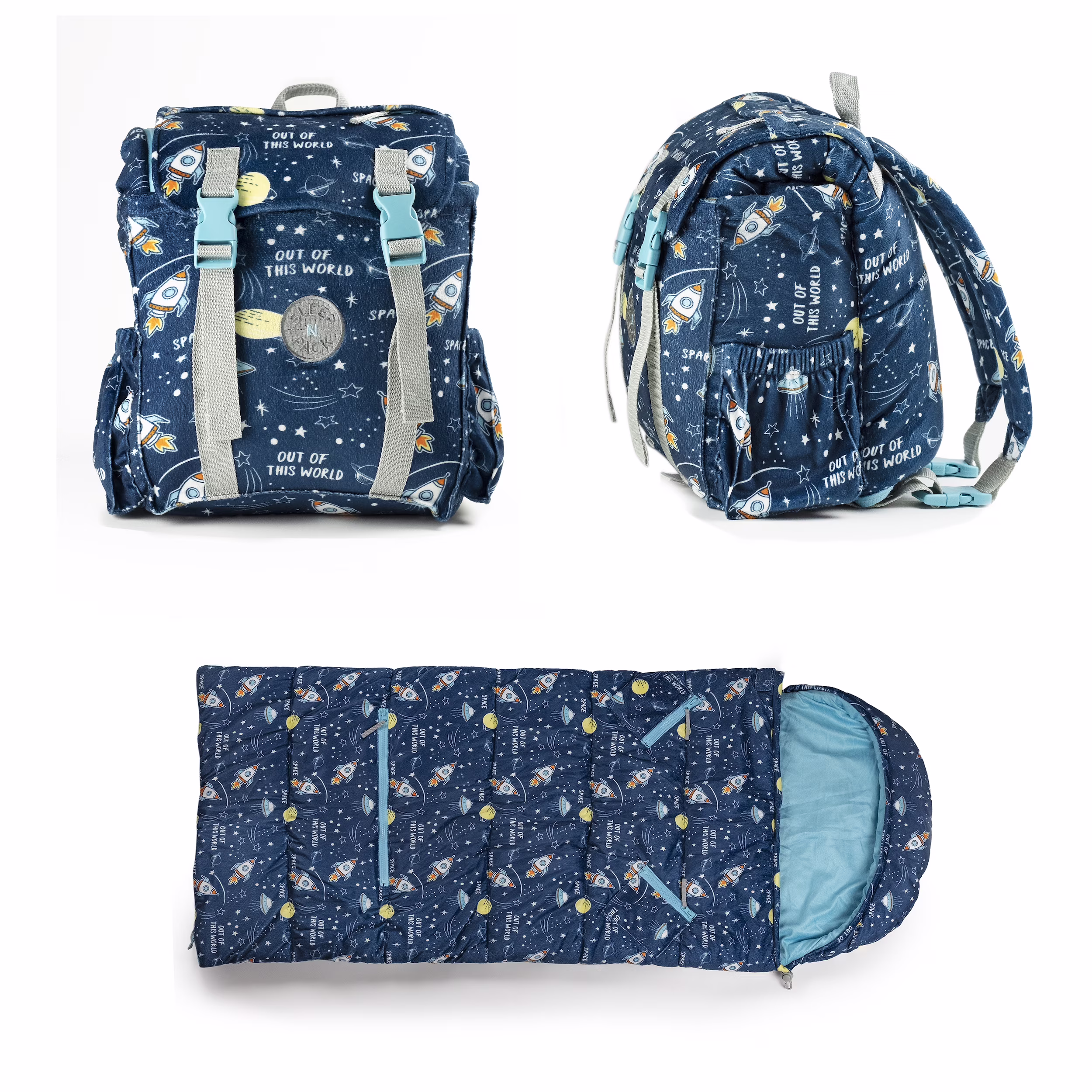 Mimish Sleep-N-Pack, 50 F Packable Kid's Sleeping Bag & Backpack, Space & Rockets Print