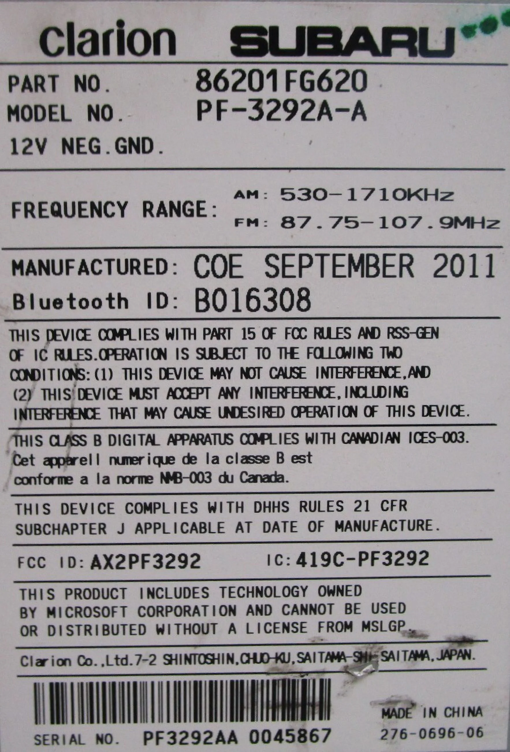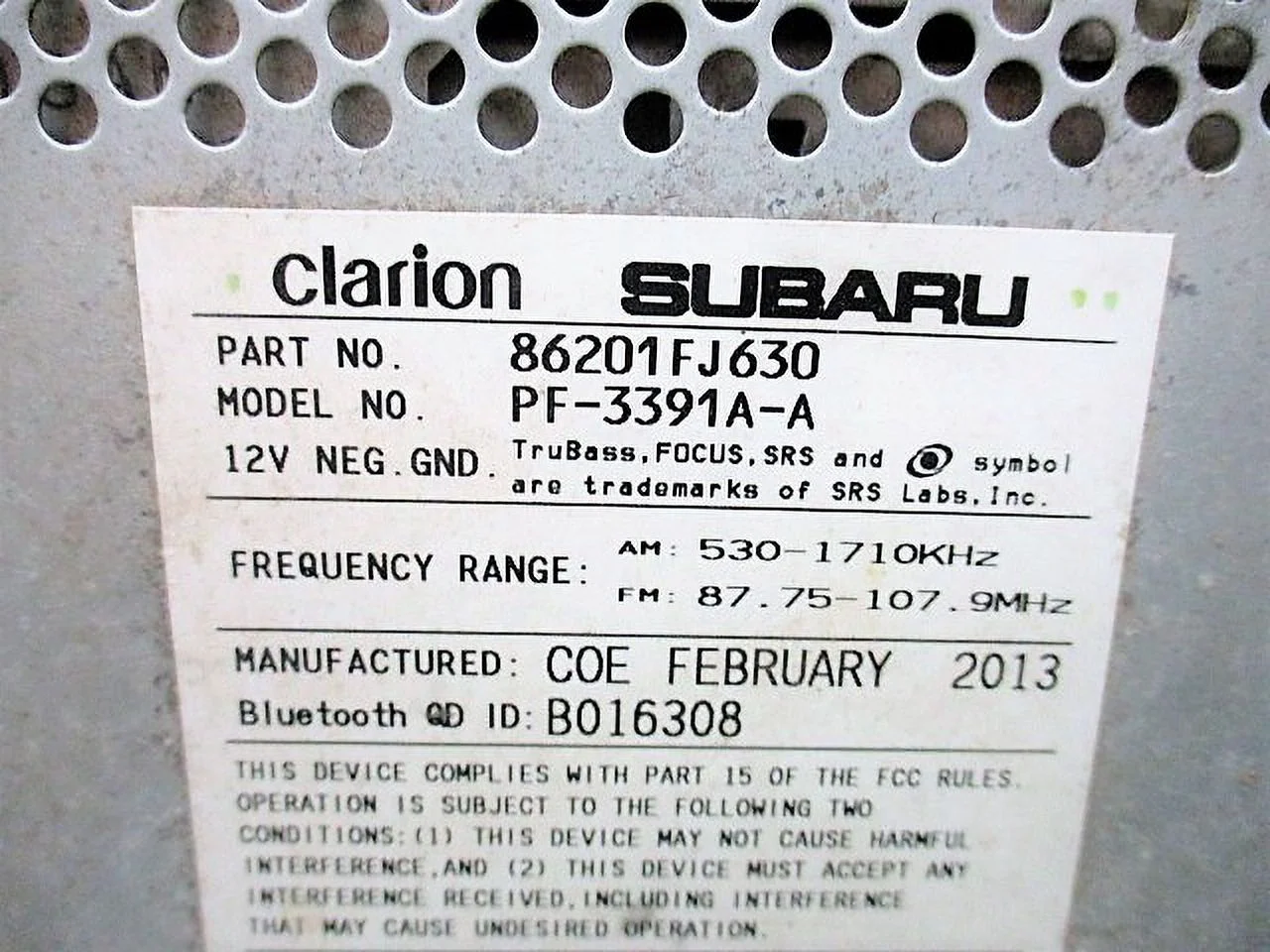 Pre-Owned 12 13 14 Subaru Impreza MP3 CD High Definition Radio Receiver ID 86201FJ630 OEM (Good)