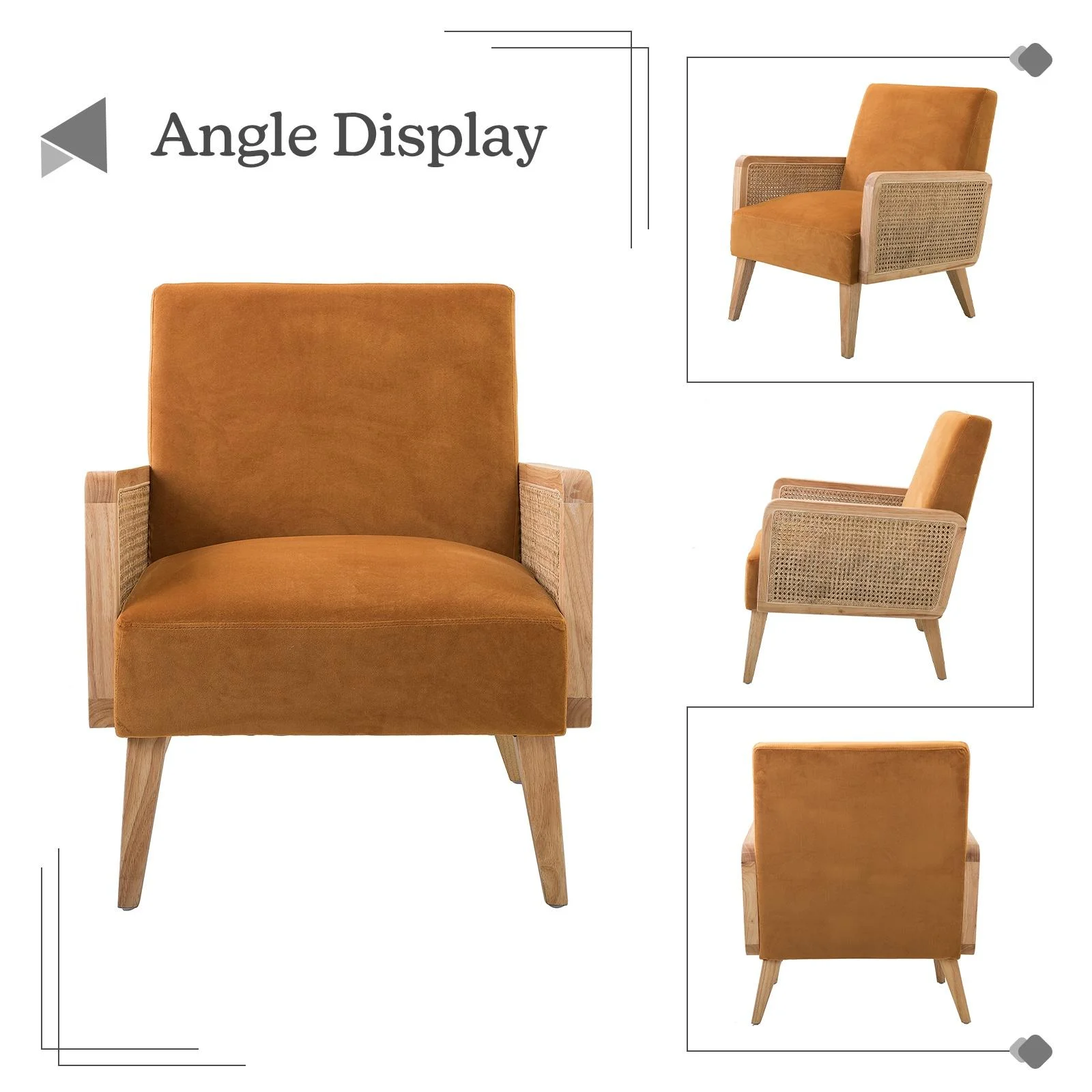 Midcentury Accent Chair Rattan Armrests Fabric Upholstered Wooden Reading Armchair Living Bedroom Yellow