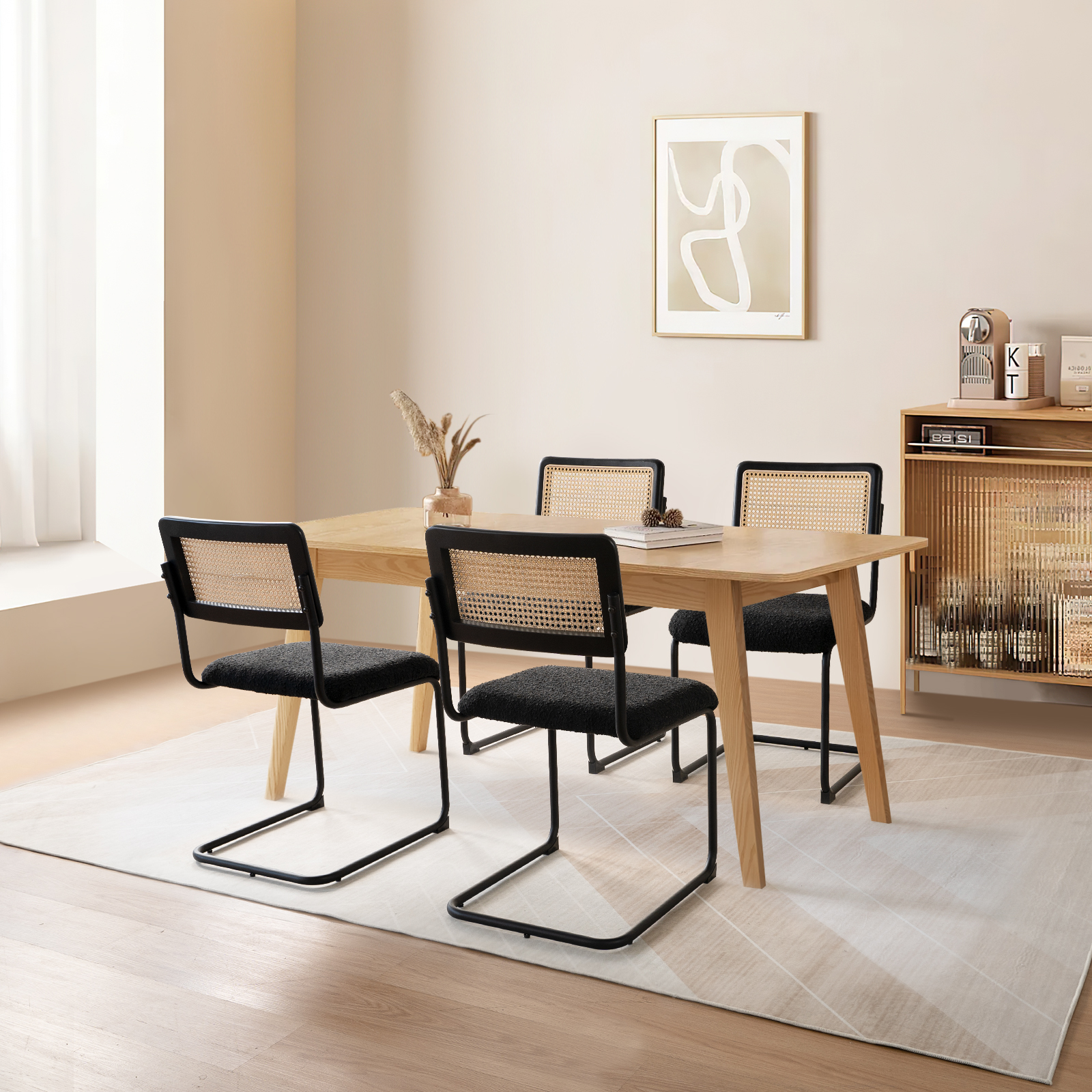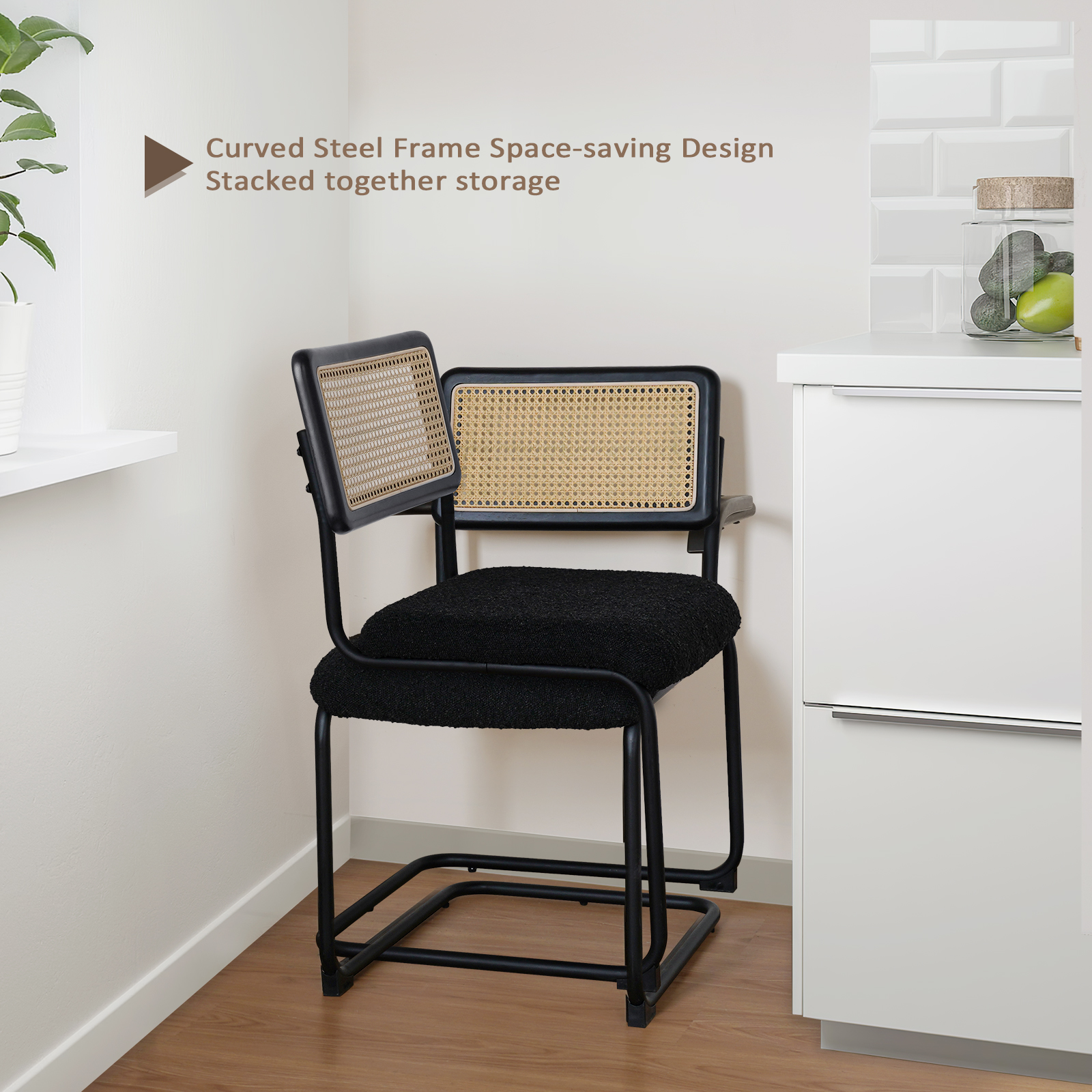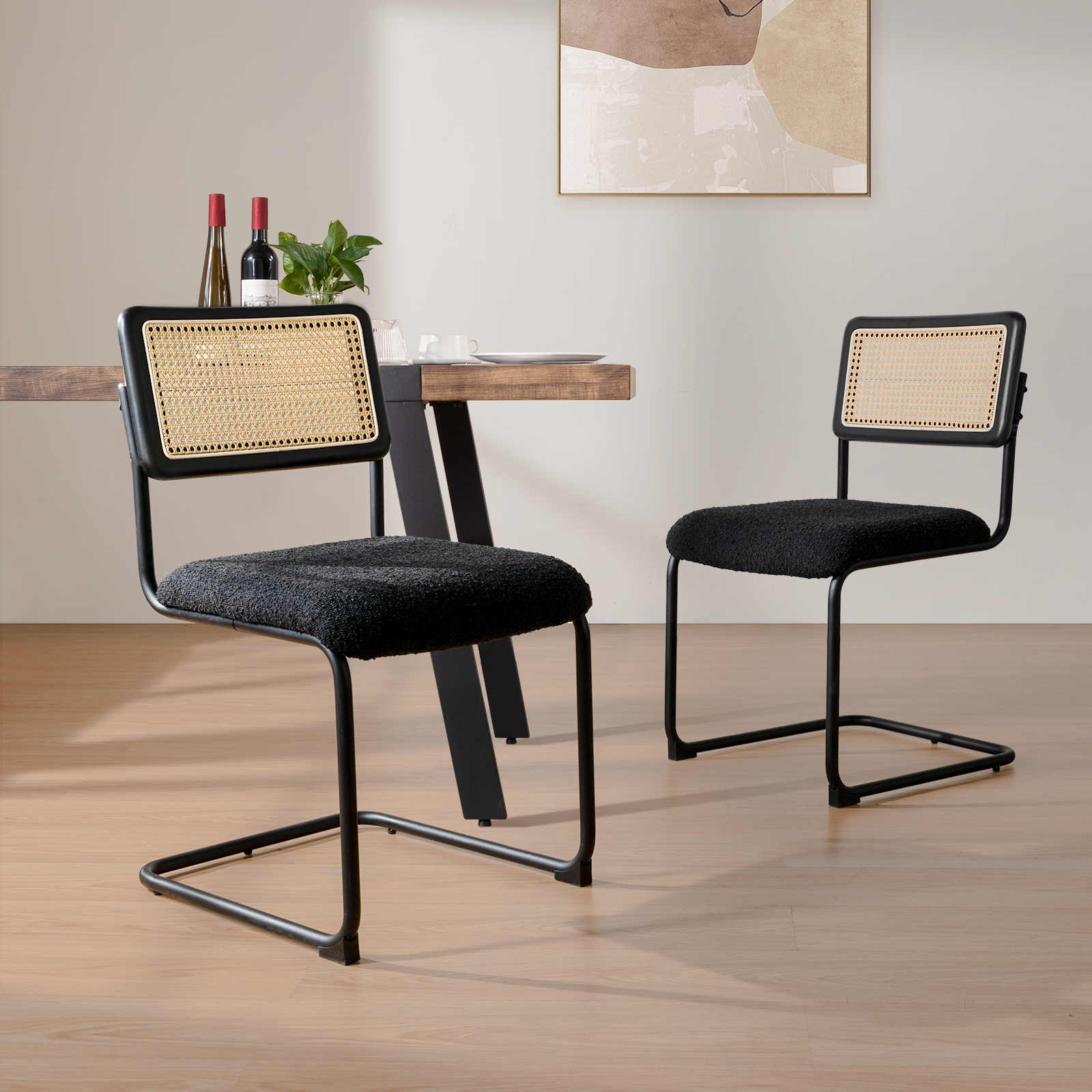 Kithkasa Rattan Boucle Dining Chairs for Dining Room,Metal Legs,Set of 2,Black