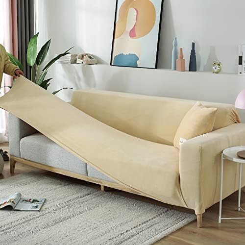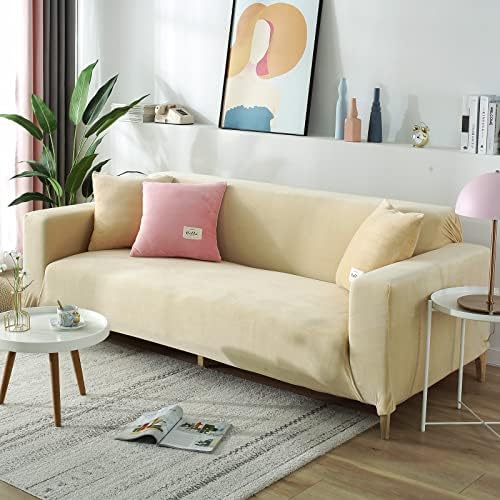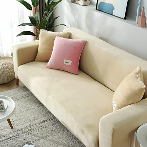 Thick Velvet Sofa Cover,Stretch Sofa Covers Slipcovers With Non Slip Elastic Straps Furniture or Cover, Cch Slipcover For Living Room Dogs Cat Pet (Beige, 2 Seater)