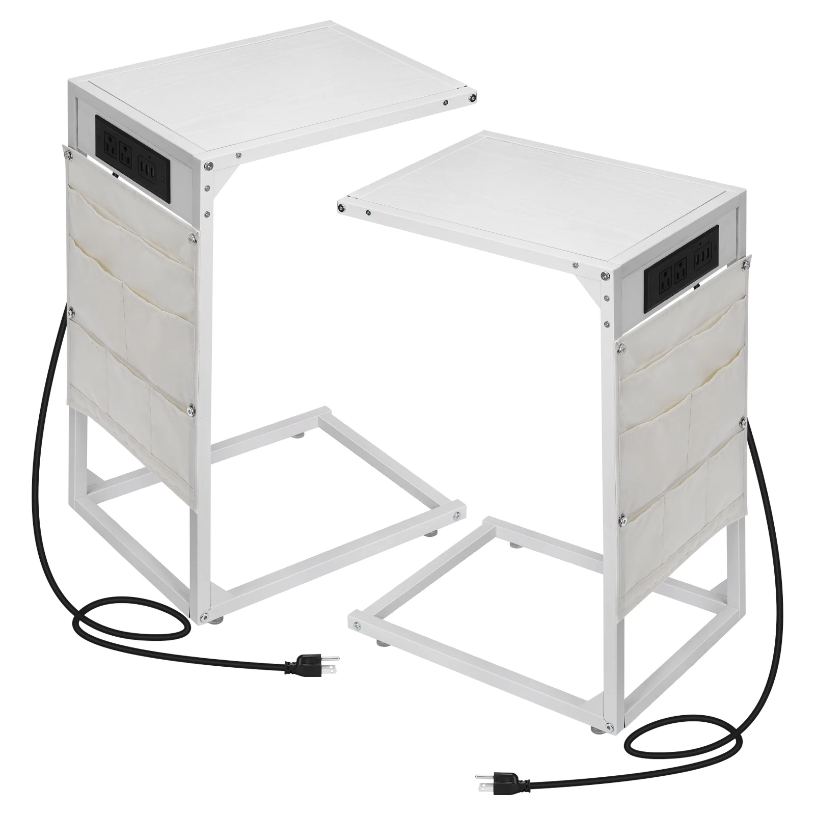 Set of 2 C Shaped Side Tables with Charging Station, Snack Side Table, Sofa C Table, Slide Under Sofa Table, for Living Room, Bedroom, White