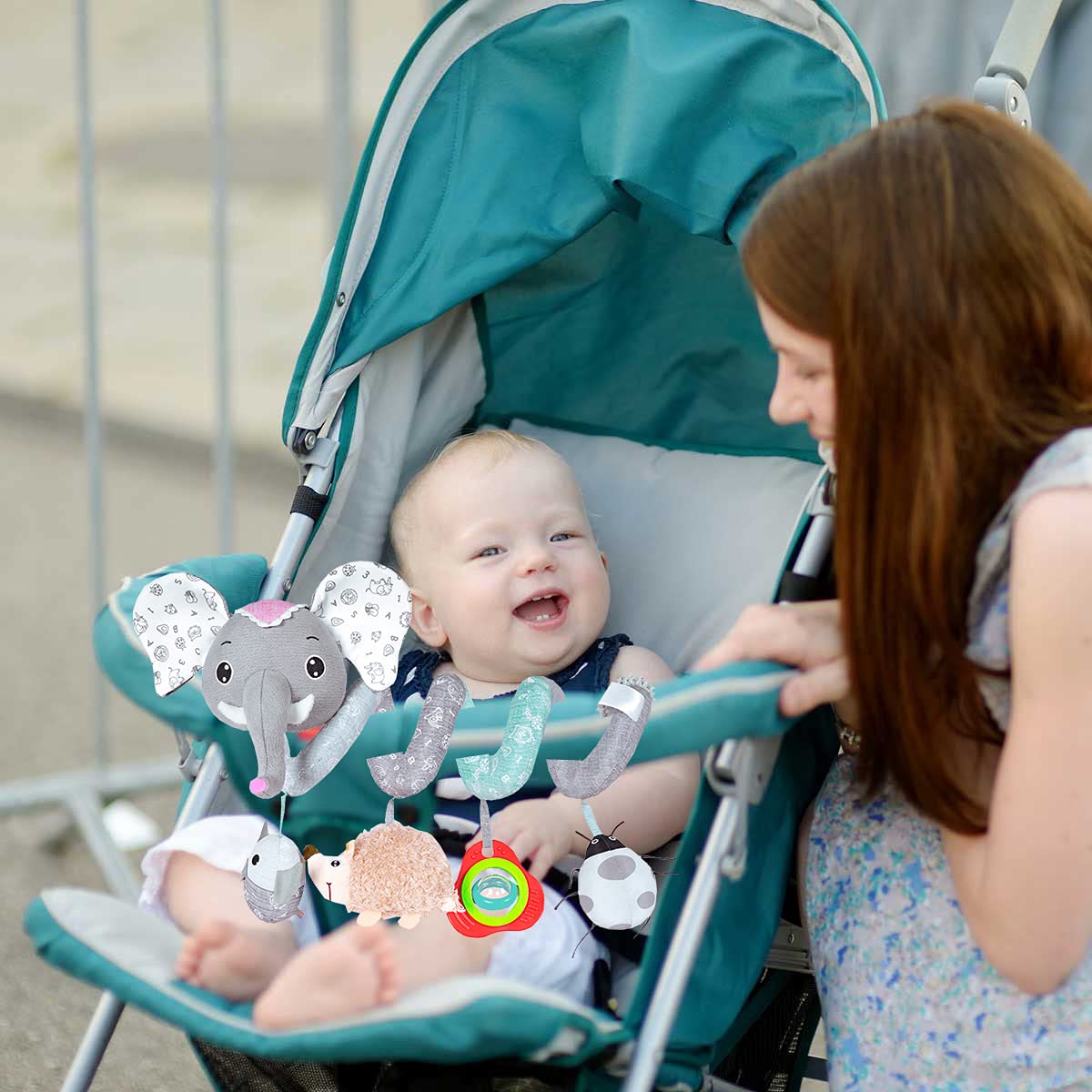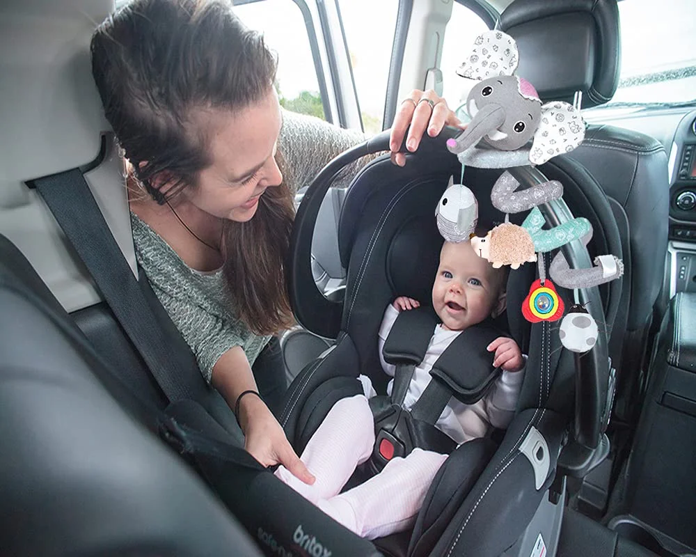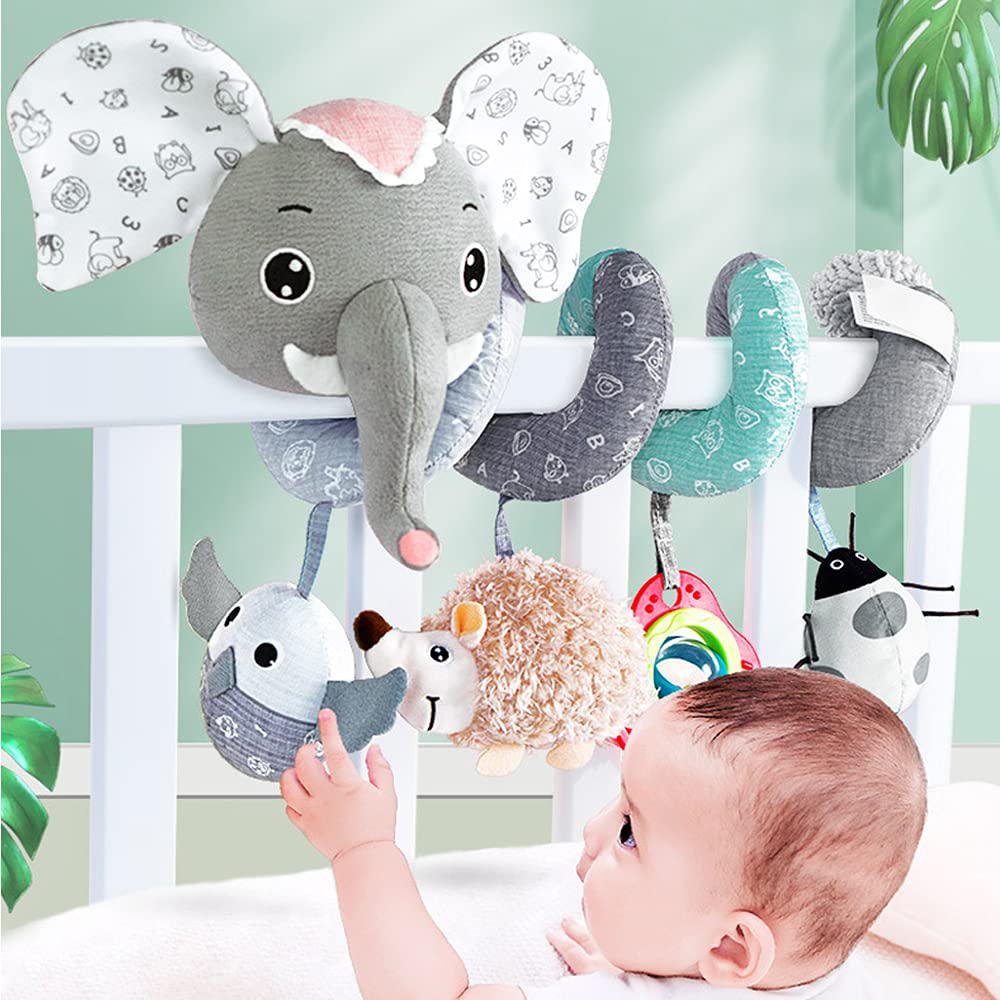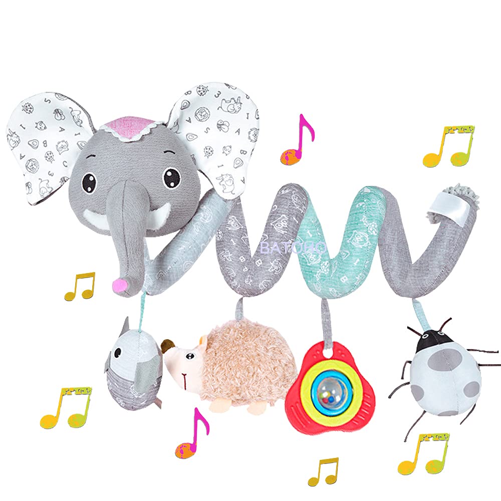 Baby Car Seat Toys, Infant Activity Spiral Plush Toys Hanging Stroller Toys for Baby with Musical Owl Rattles Hedgehog Beep Ladybird Squeaker - Gray Elephant