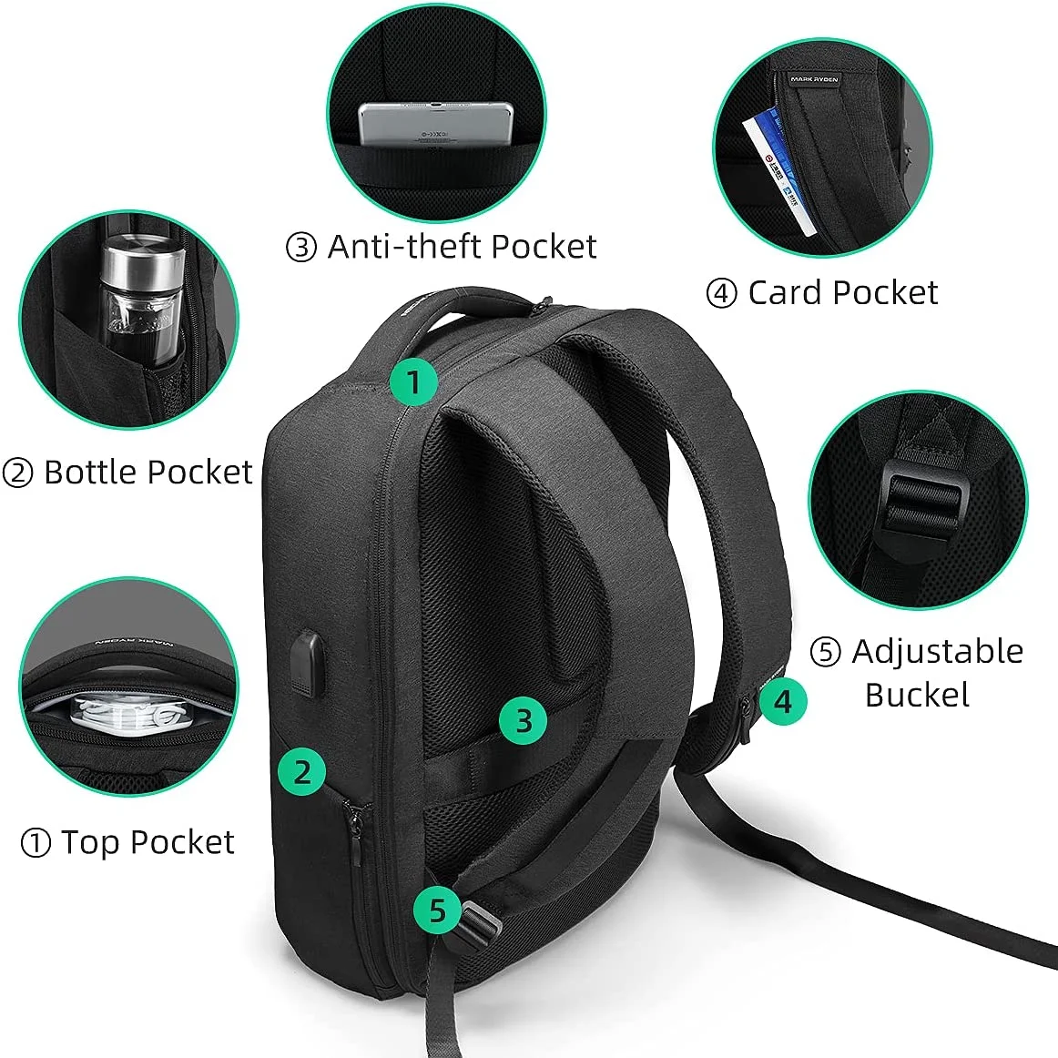 MARK RYDEN Anti Theft Backpack with TSA Approved Lock and Scratch Resistant Shell, Waterproof Travel Backpack, USB Laptop Backpack for Men and Women Fits 15.6 Inch Notebook
