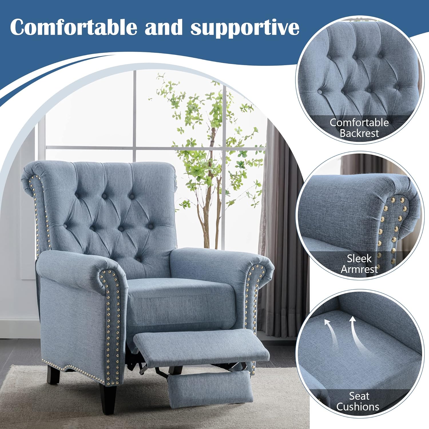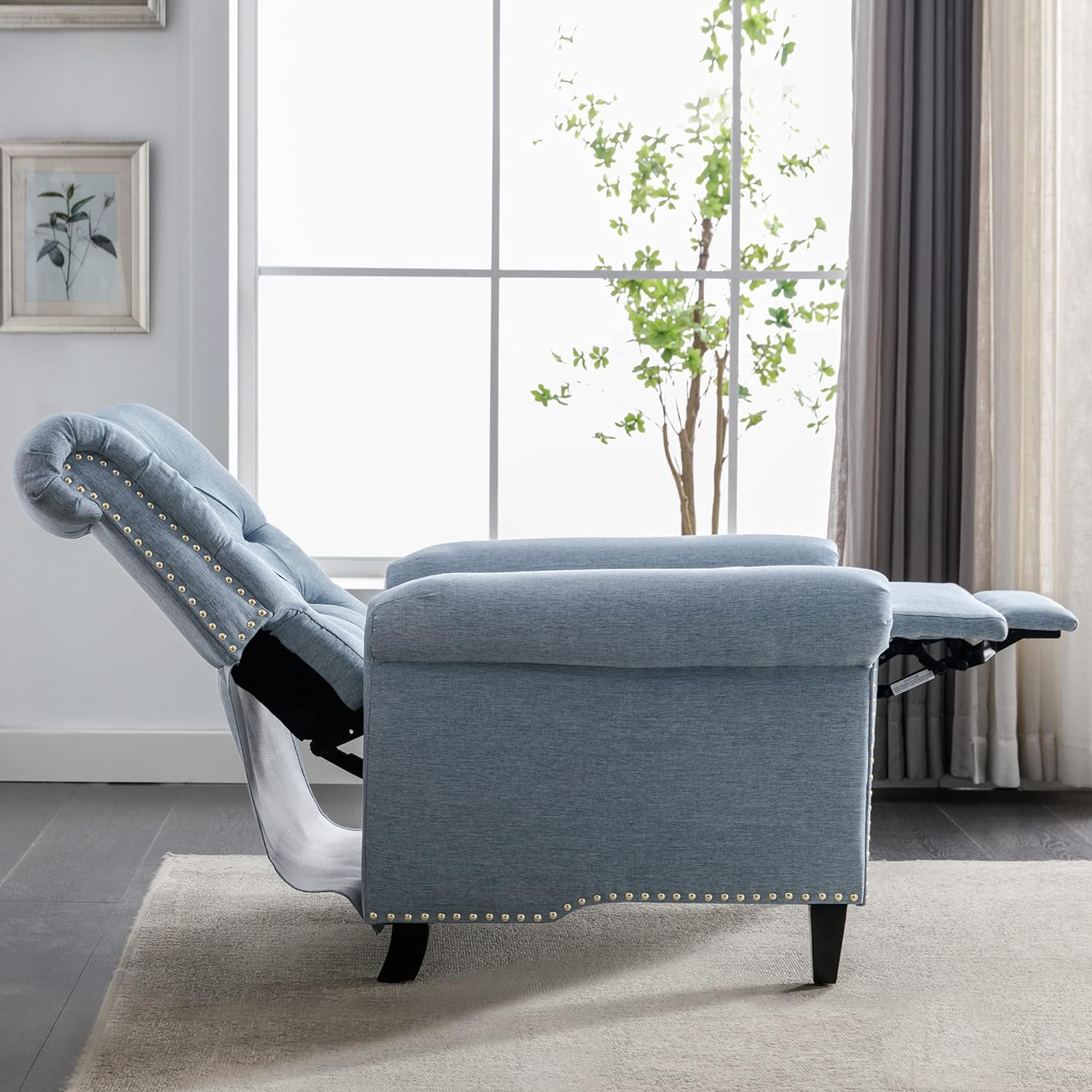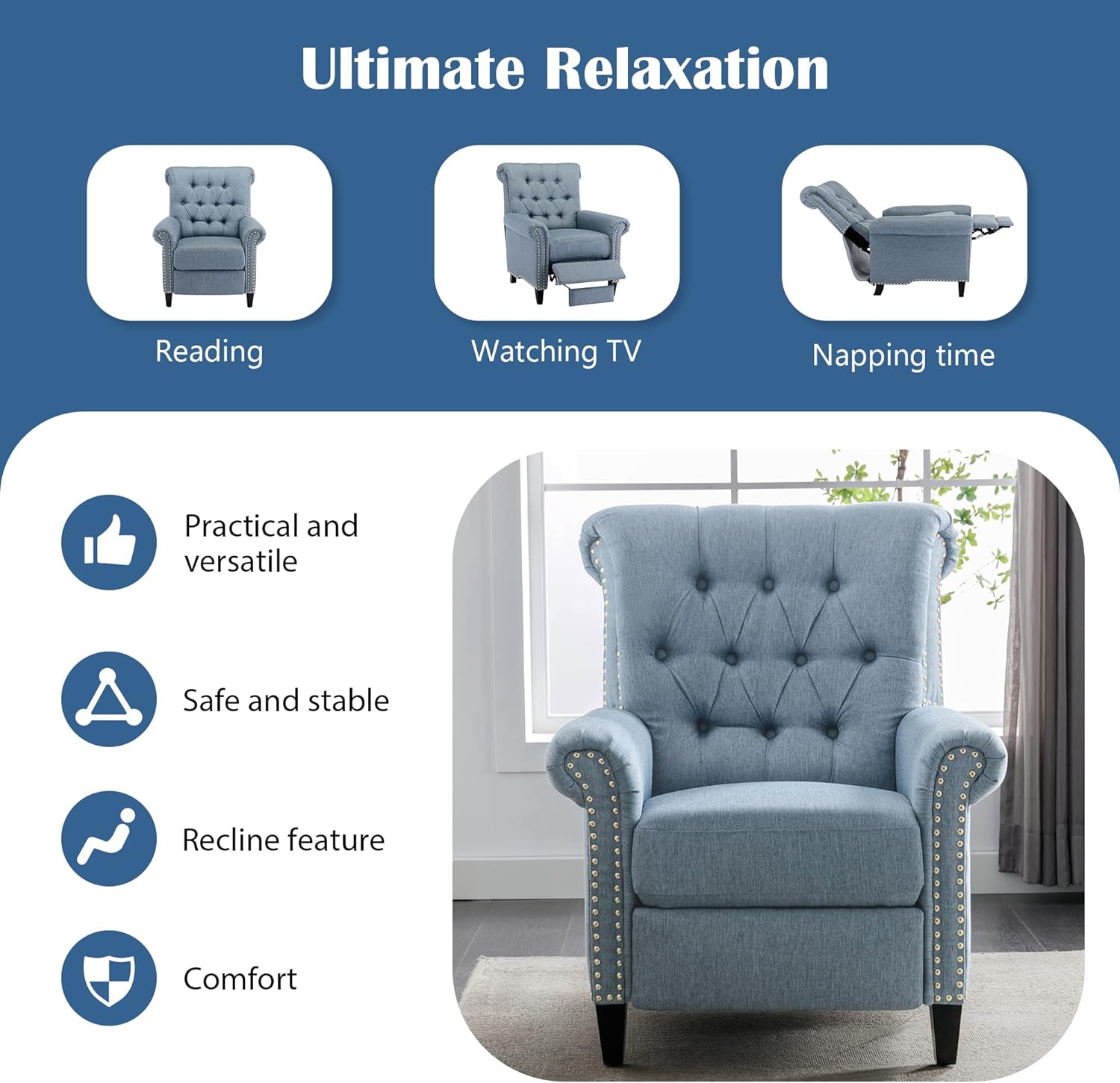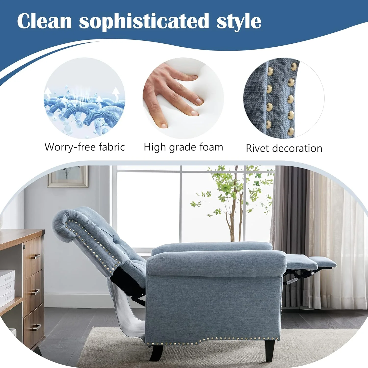 Pushback Linen Tufted Recliner Single Sofa With Nailheads Roll Arm For Living Room, Bedroom, Office, Blue