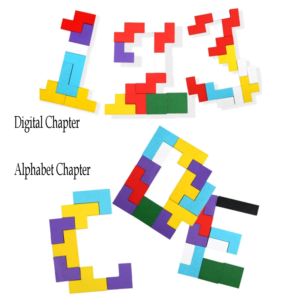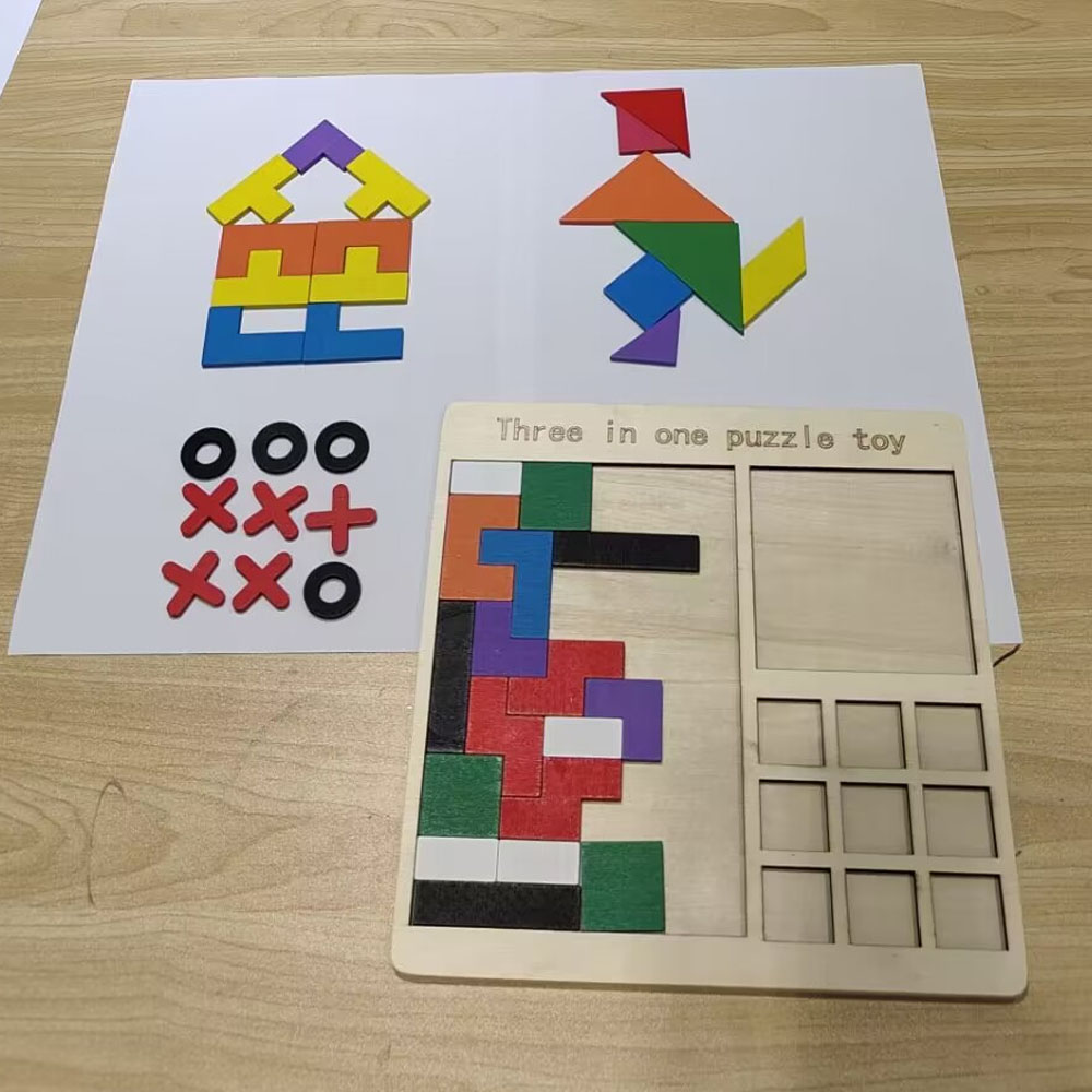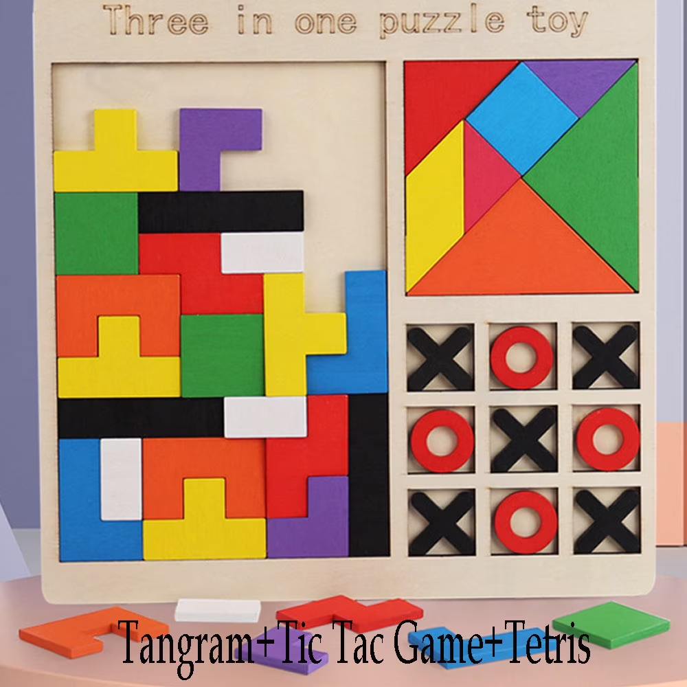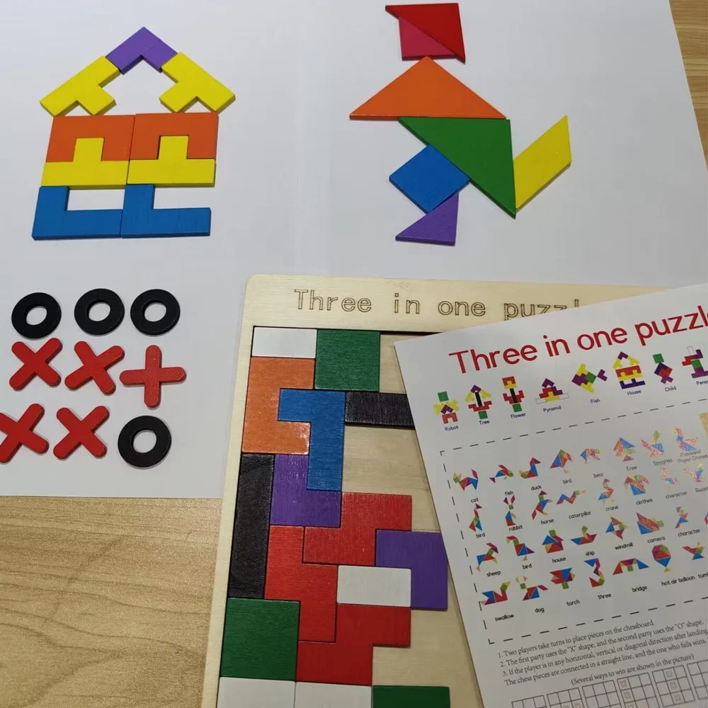 Wooden Blocks Puzzle Brain Teasers Toy for Kids, Tic Tac Toe Board Game Toy XOXO Board Game Tangram Puzzle Toy