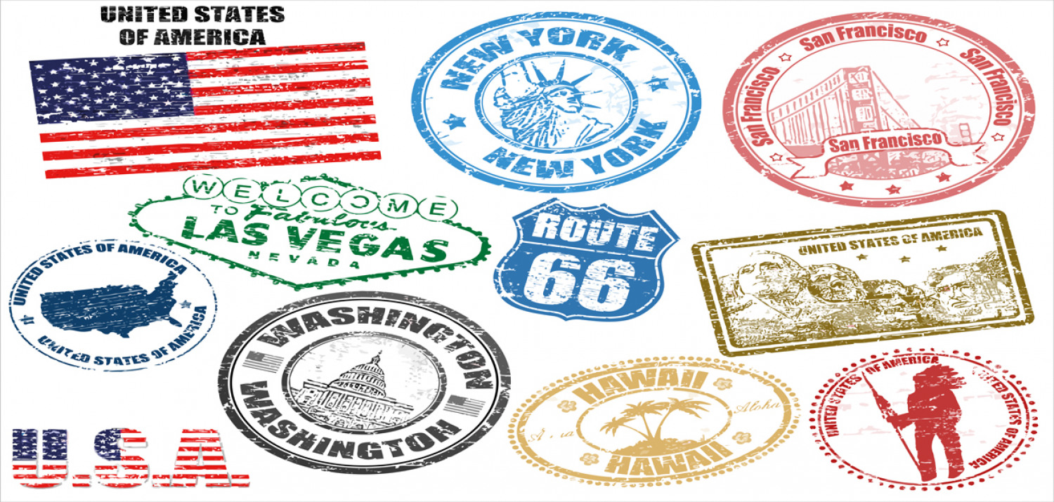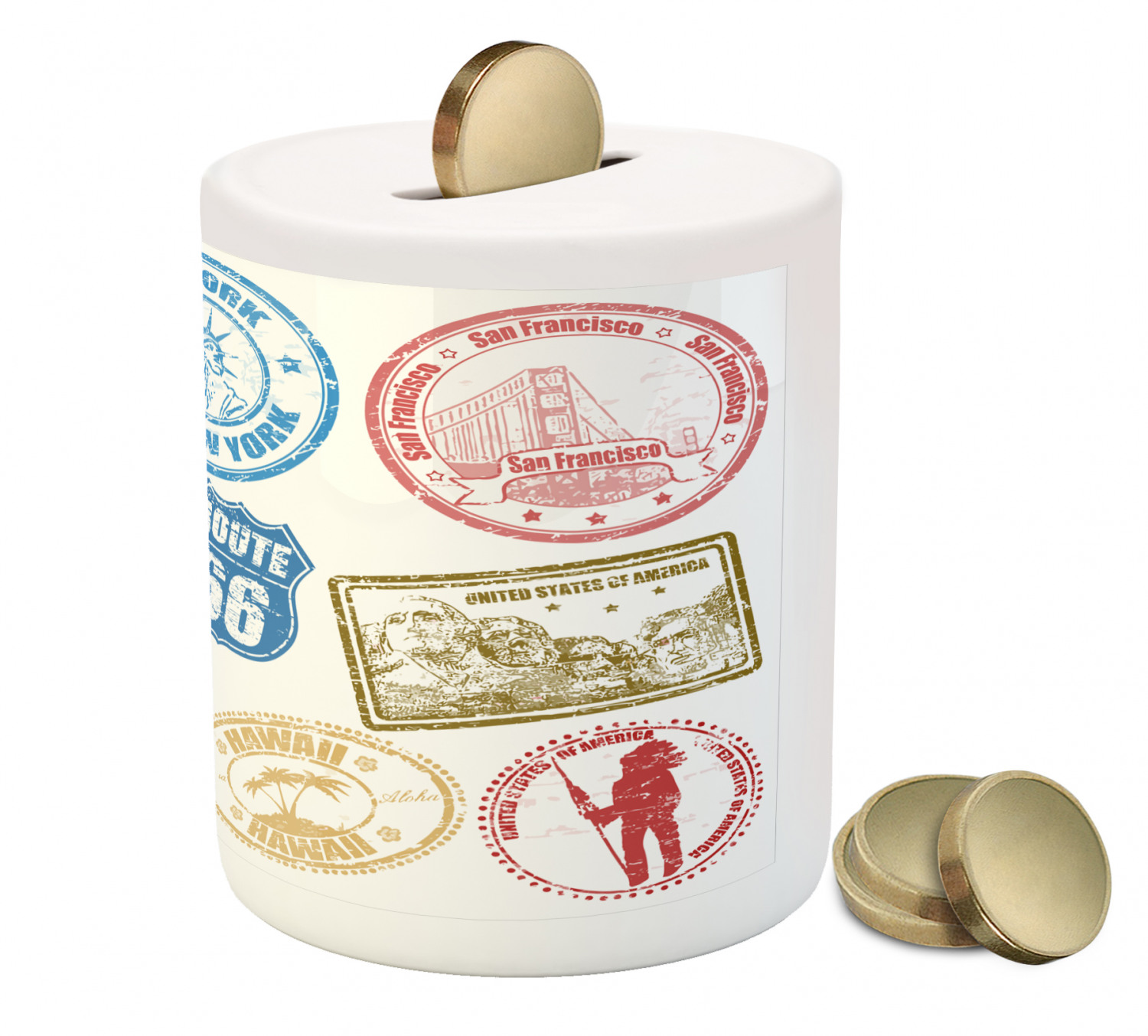 United States Piggy Bank, Grunge Stamps of America Las Vegas New York San Francisco Hawaii Illustration, Ceramic Coin Bank Money Box for Cash Saving, 3.6" X 3.2", Multicolor, by Ambesonne