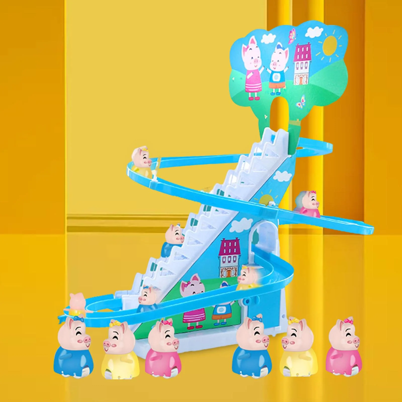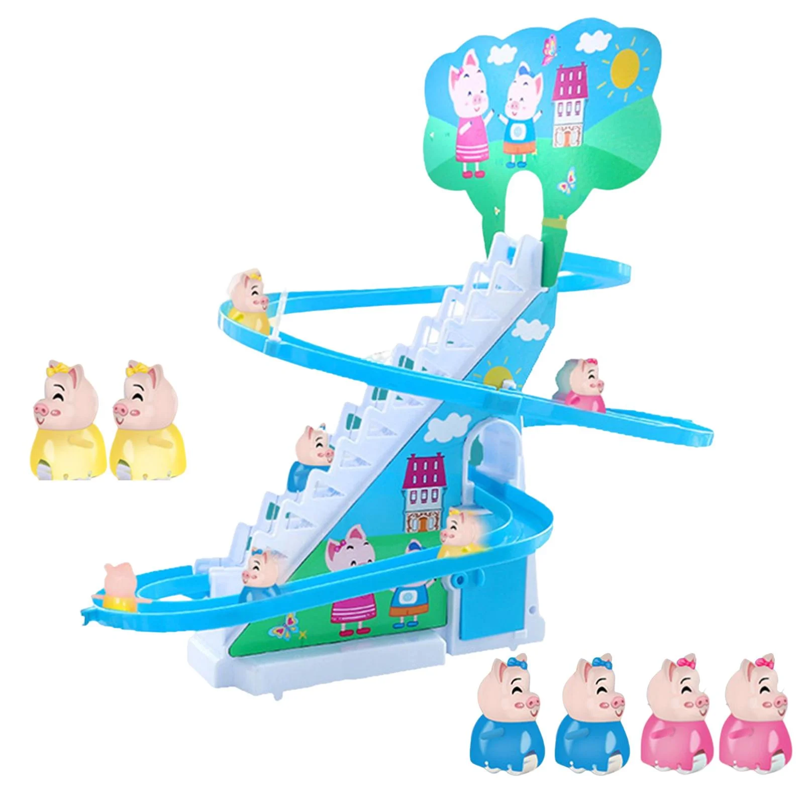 Electric Pig Climbing Stair Toy with LED Flashing Lights Children's Roller Coaster Toy Set Small Toy , 6 Pigs