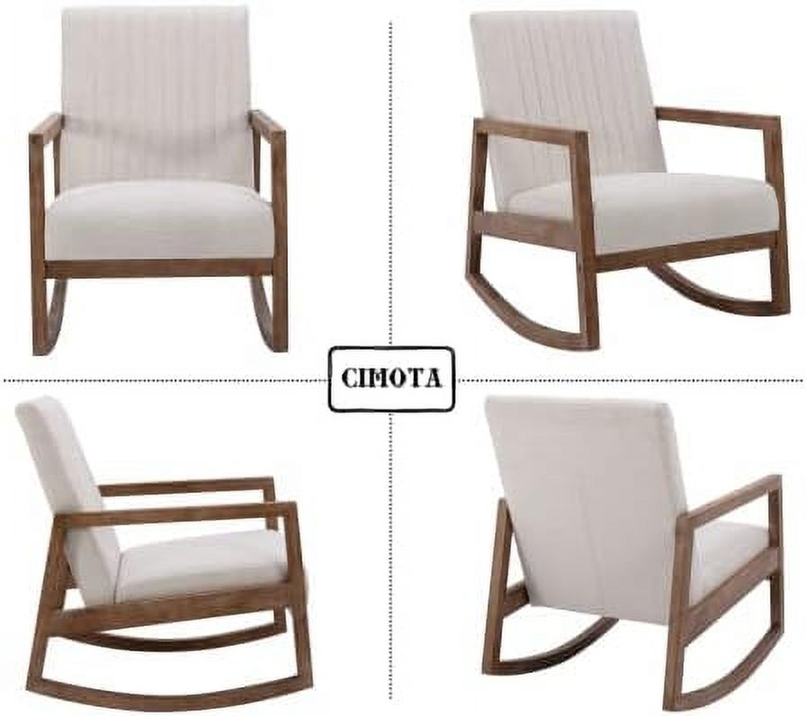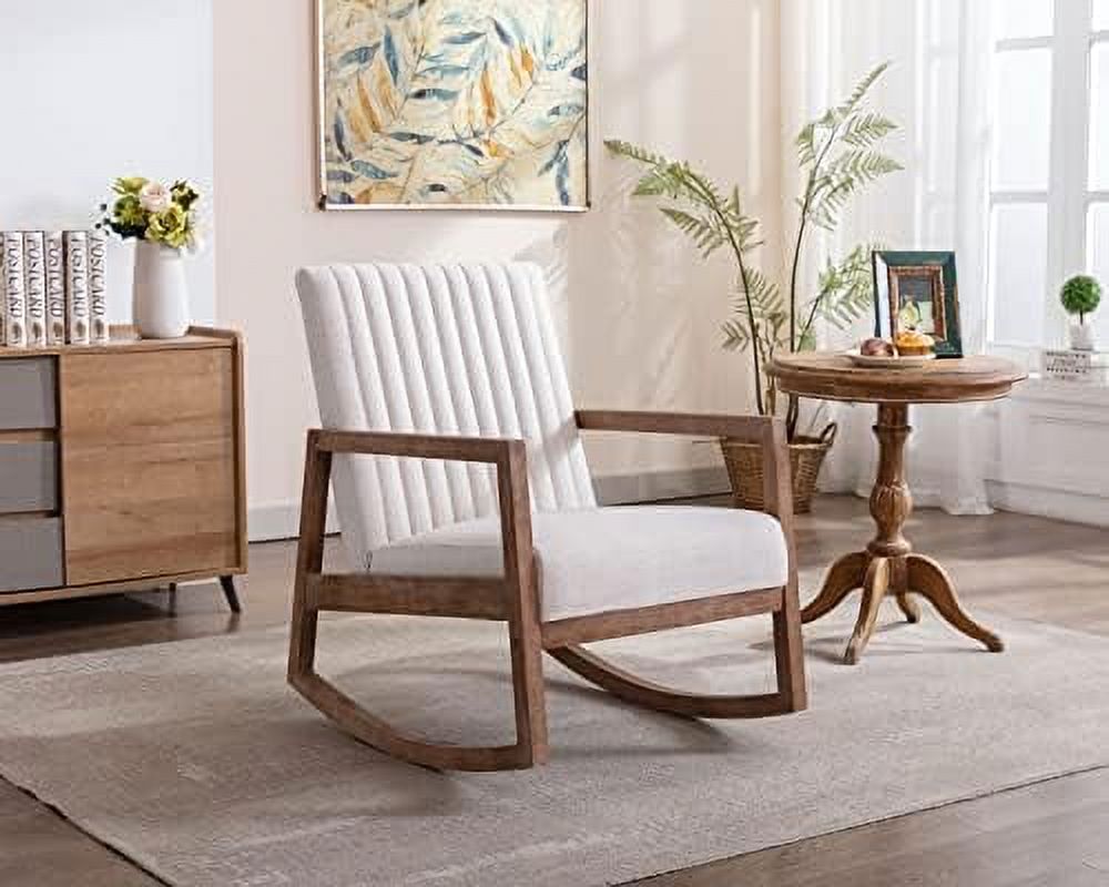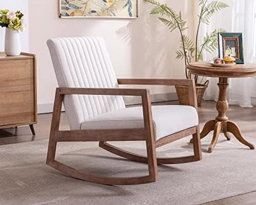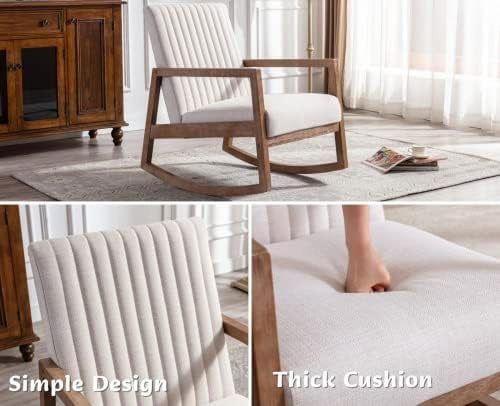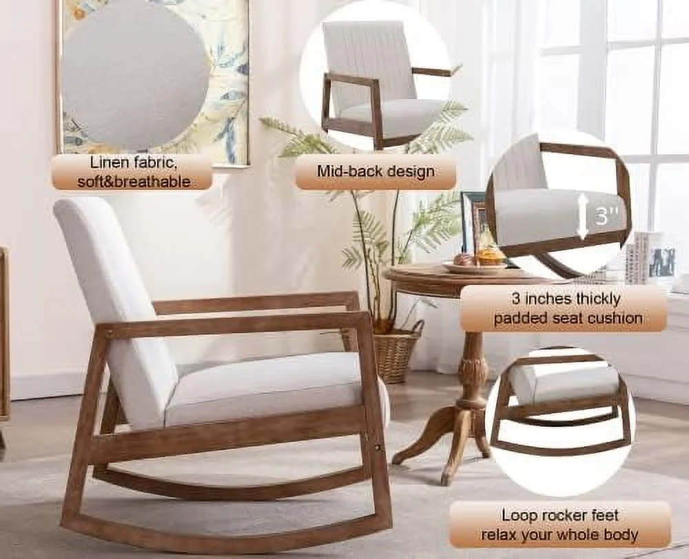 TJUNBOLIFE Mid Century Rocking Chair Modern Linen Armchair Upholstered Arm Chair with Padded Seat/Wood Frame Comfy Rocker for Living Room/Bedroom/Nursery Linen/Beige