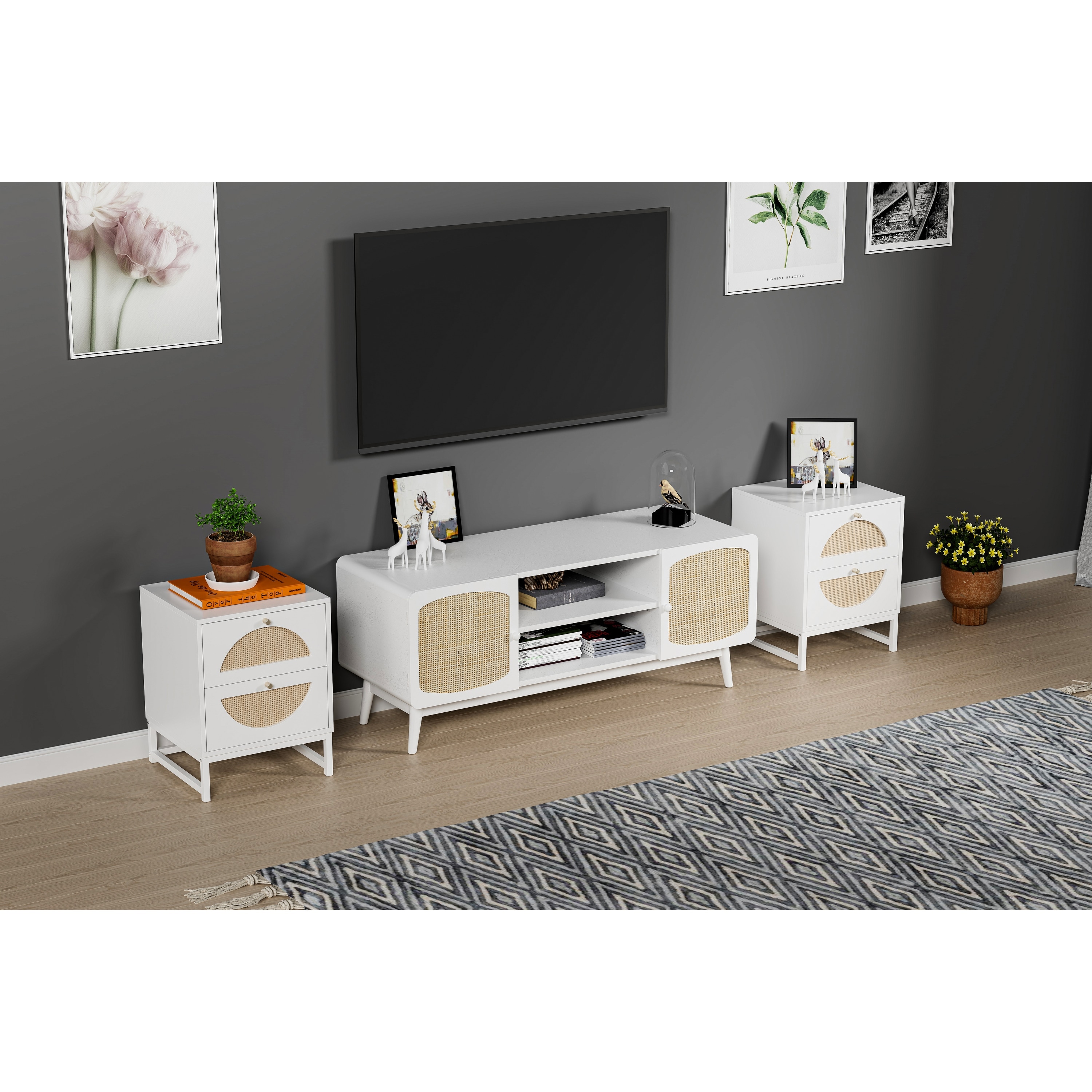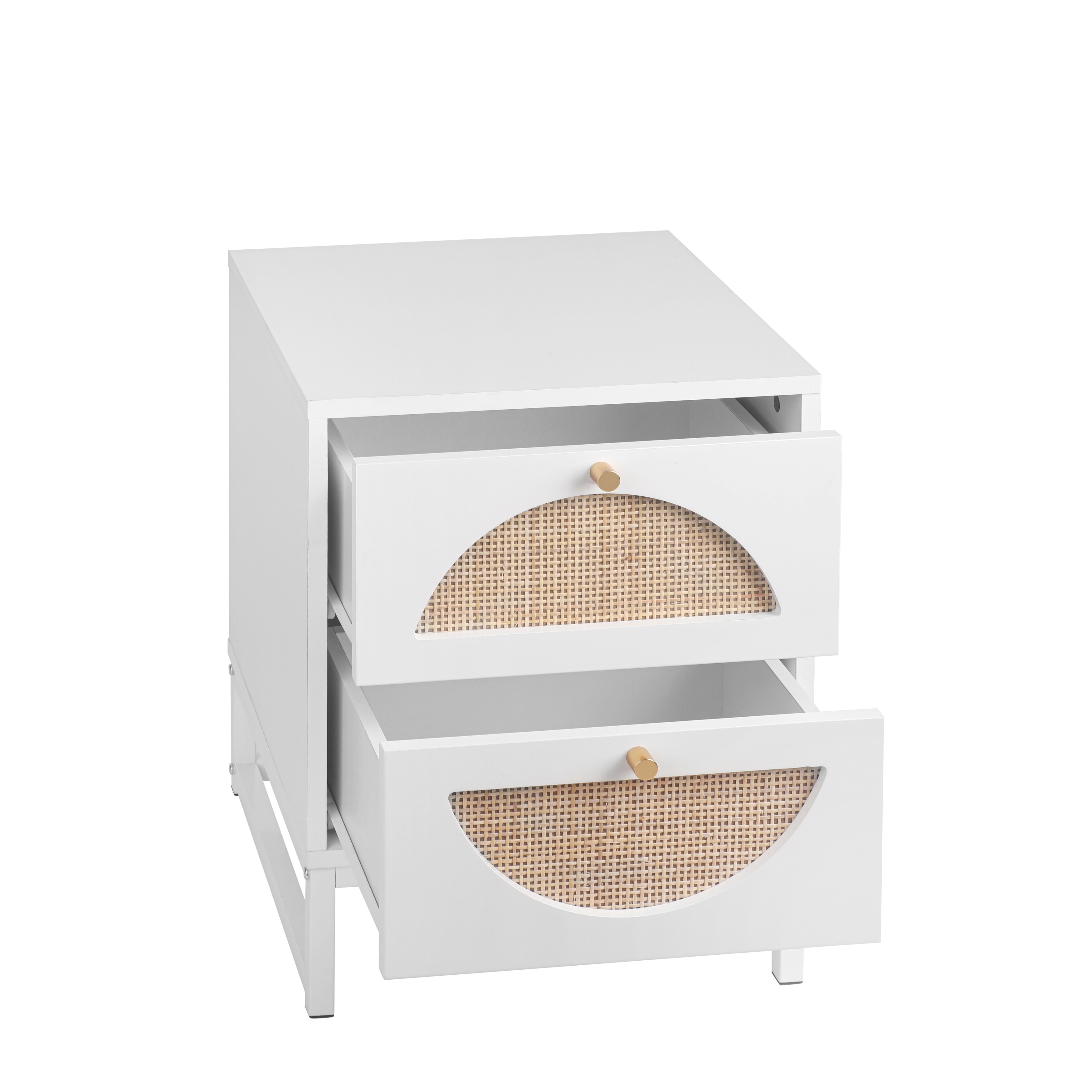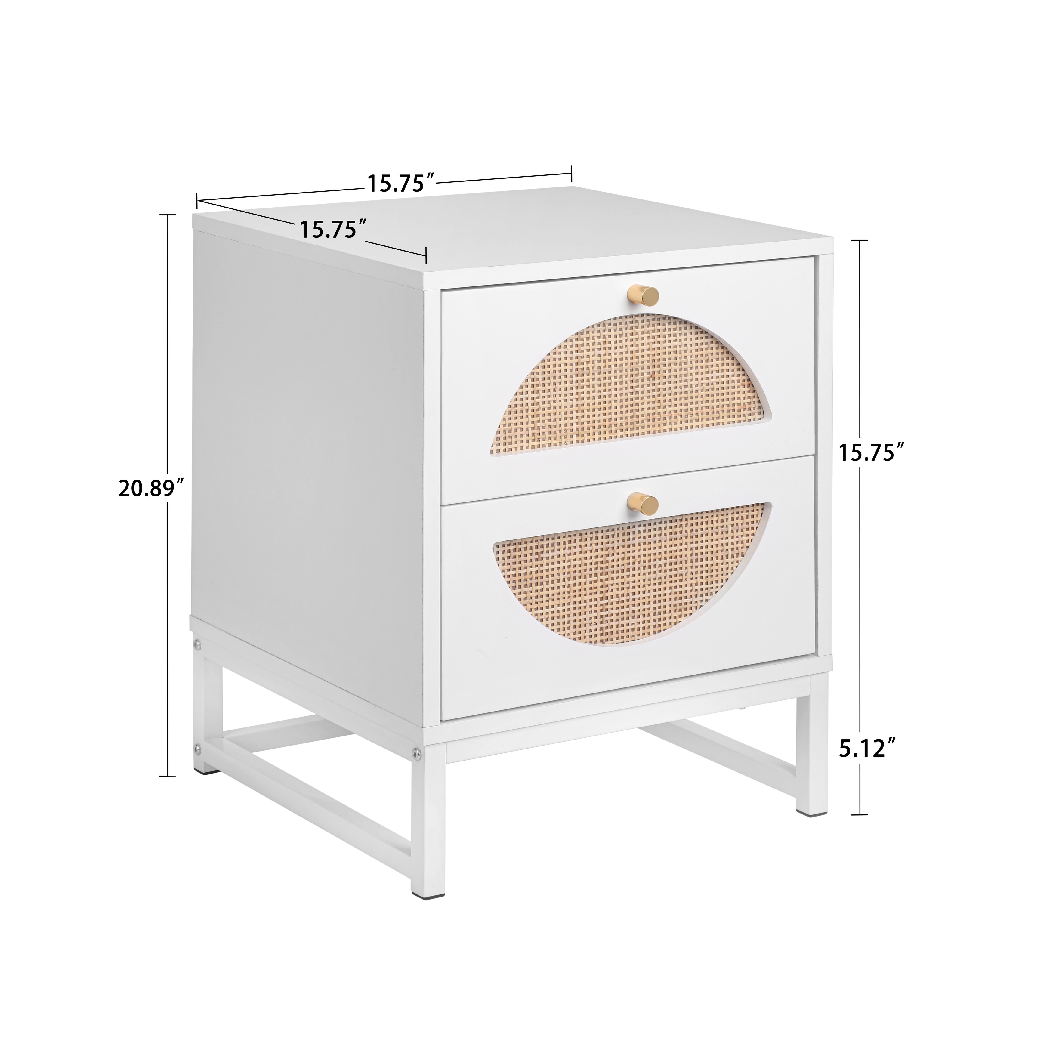 Nightstand Set of 2, Rattan Semicircular Pattern Drawer Display Rack for Bedroom Metal Base Sofa Side Table, Walnut
