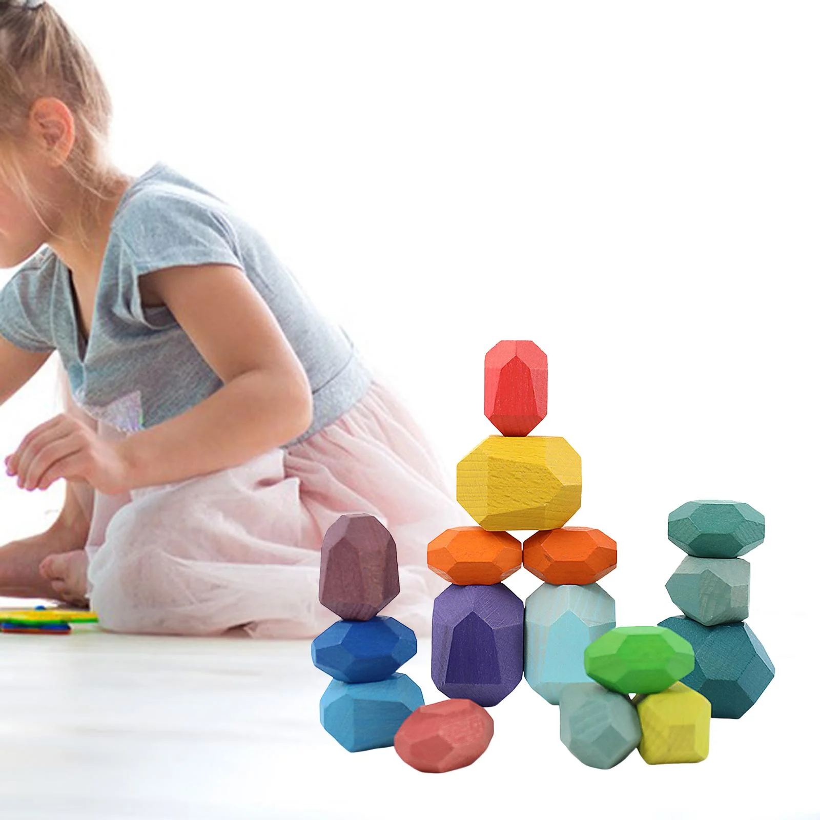 36Pcs Stacking Balancing Stone Colorful Wooden Building Blocks Balancing Stone Toys Wood Stone Building Rock Blocks Wooden Stones Stacking Game Early Educational Puzzle Toy for Kids Boys and Girls