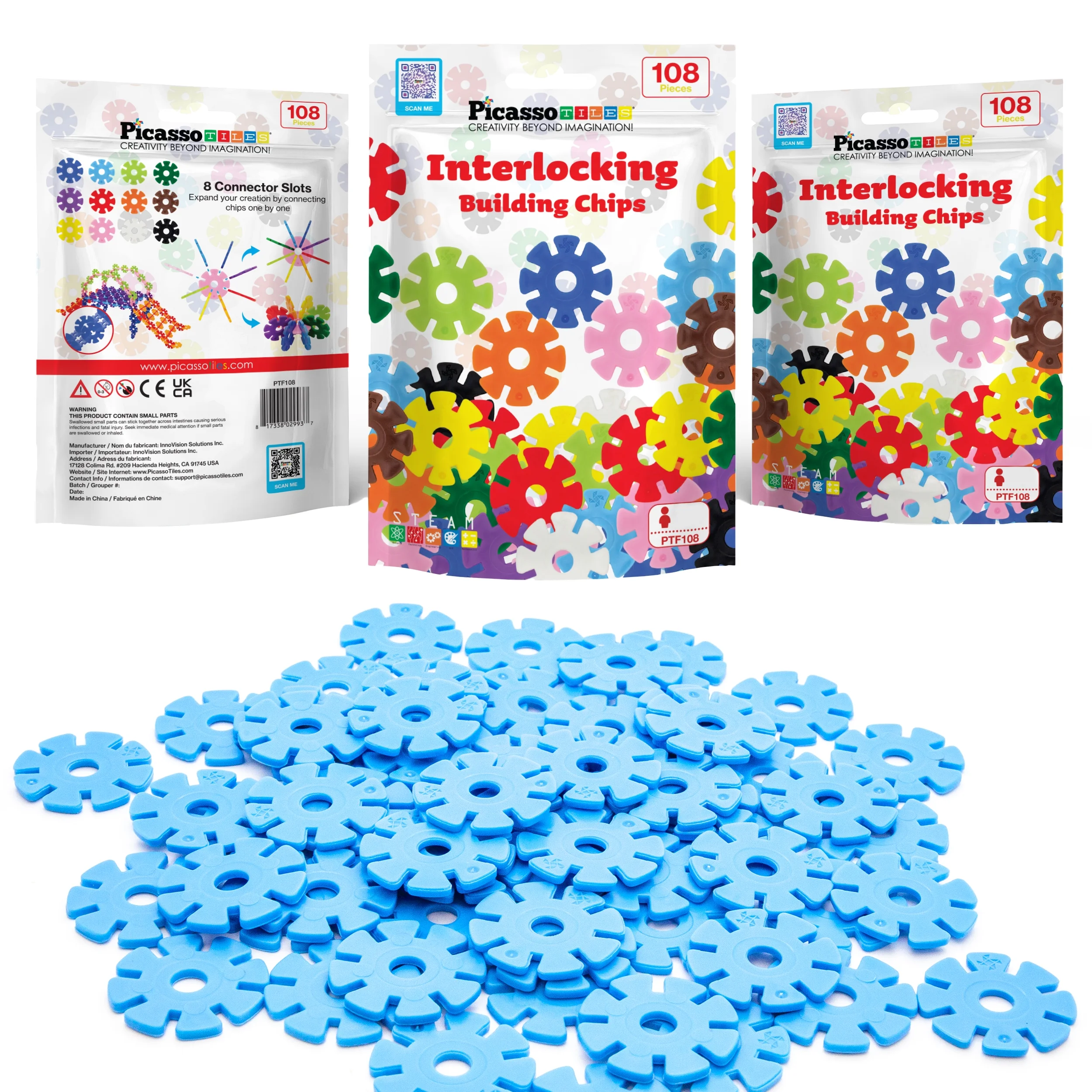 PicassoTiles 108 Pcs Building Chip Interlocking Disc Construction Blocks in Light Blue, Age 3+