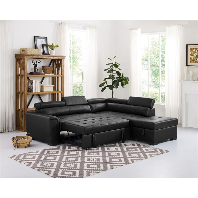 Infini Right Sided Faux Leather Sleeper Sofa with Storage Ottoman in Black