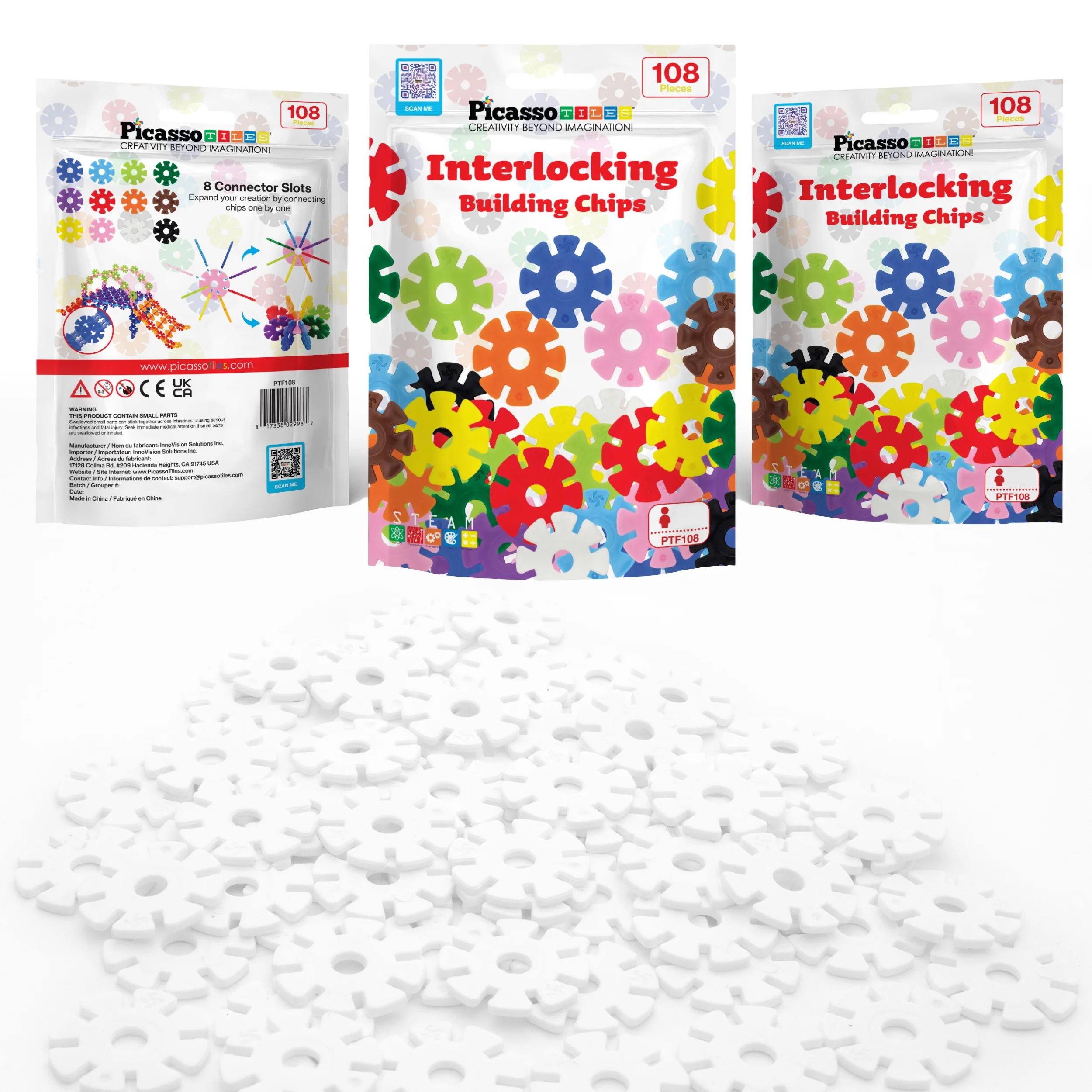 PicassoTiles 108 Pcs Building Chip Interlocking Disc Construction Blocks in White, Age 3+ PTF108-WHT
