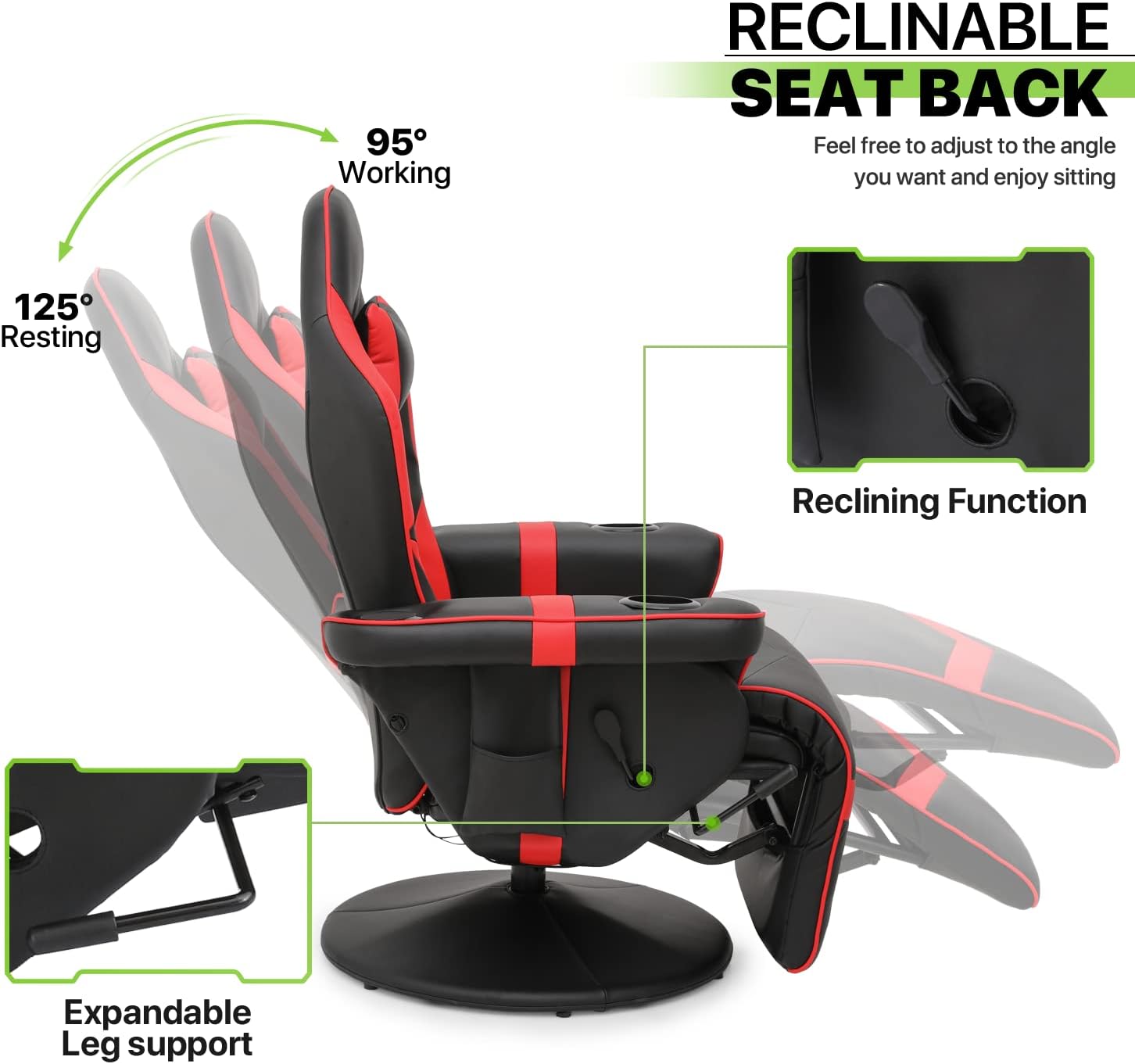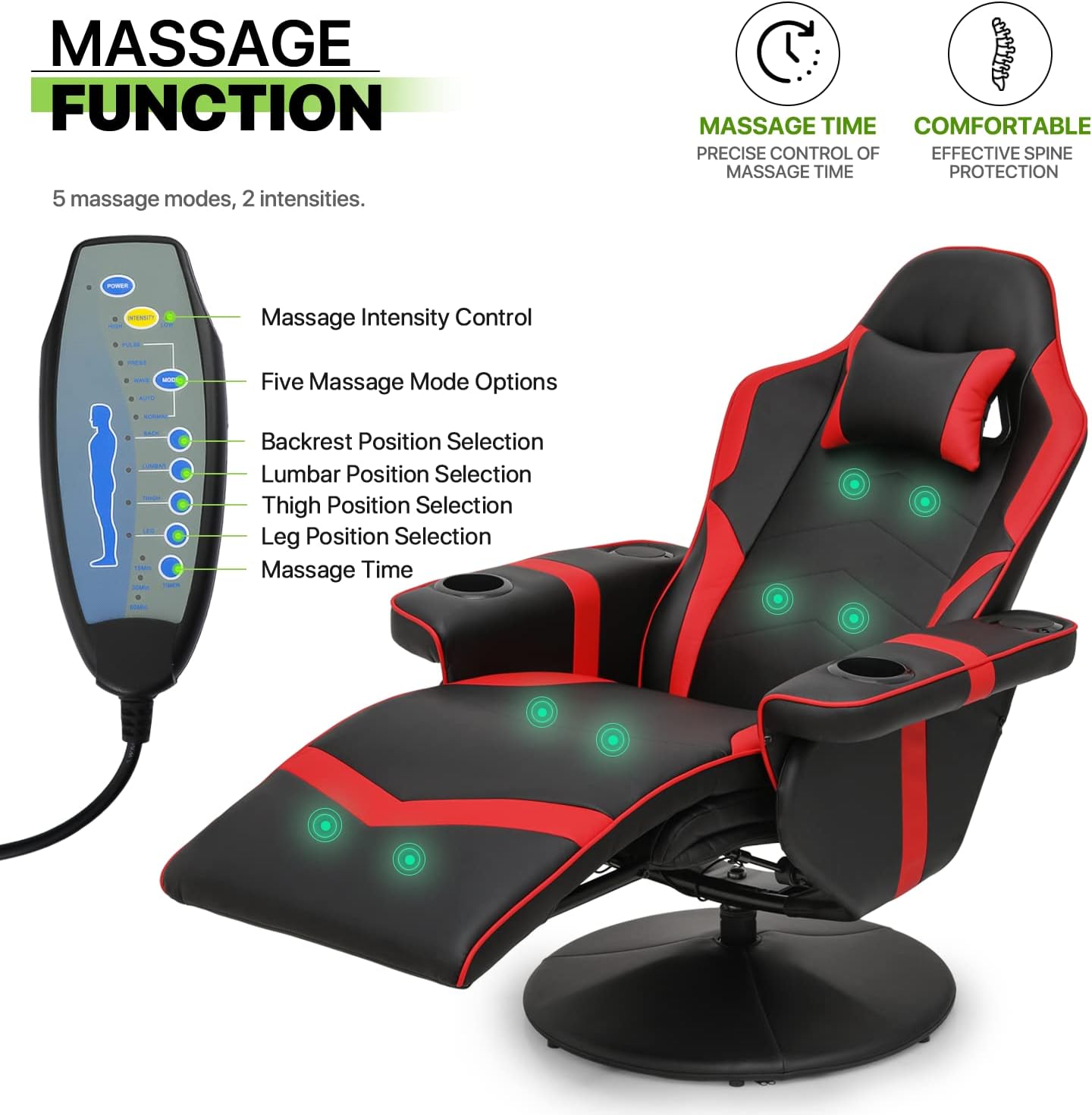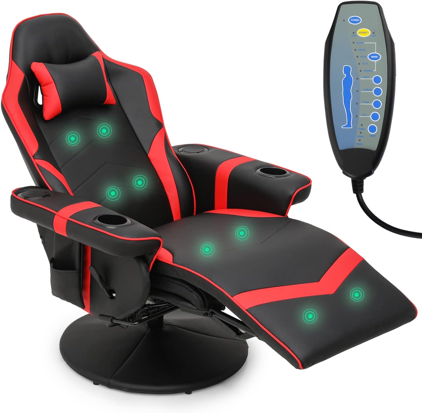 Recliner Massage Chair Comfortable High Back PU Leather Video Gamer Lounge Chair Home Bedroom Theater Seat 360° Swivel Computer Game Chair With Neck Support, Footrest, Cup Holders, Red