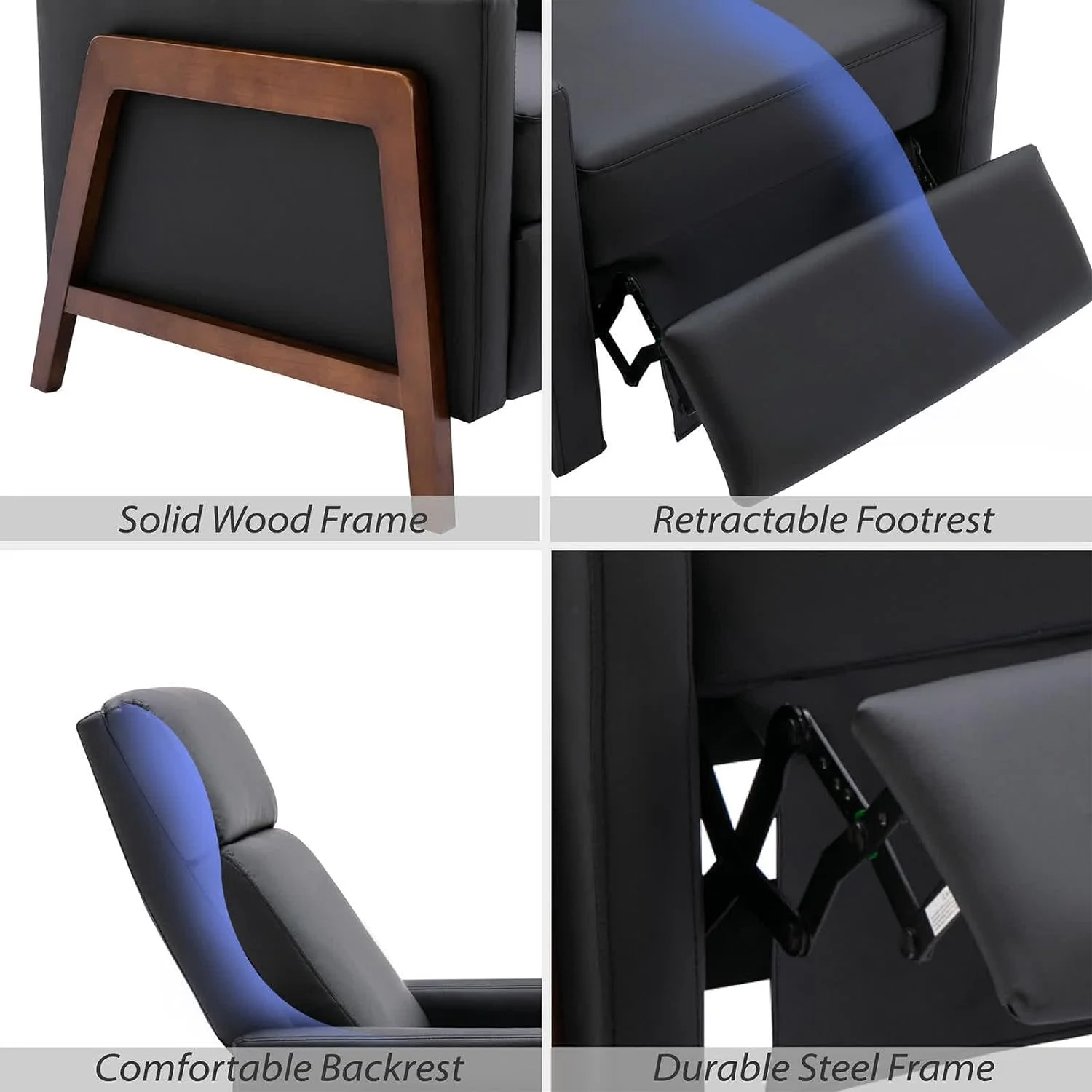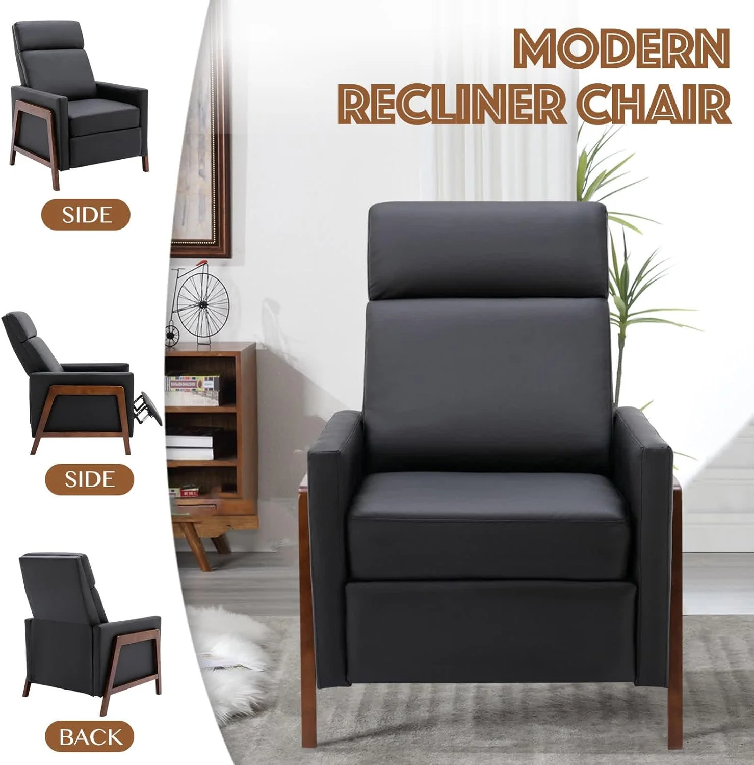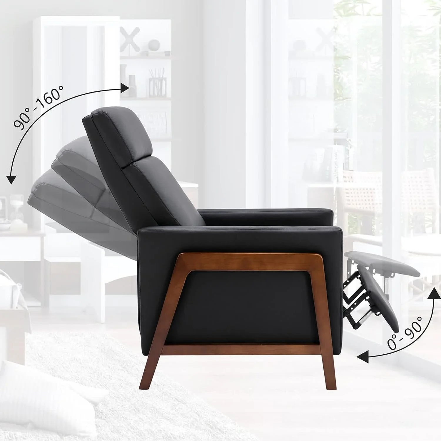 Wood Recliner Chair, Modern PU Leather Accent Chair, Adjustable High Backrest, Home Theater Seating with Thick Cushion, Upholstered Lounge Chair for Living Room, Bedroom, Office, Hotel, Black