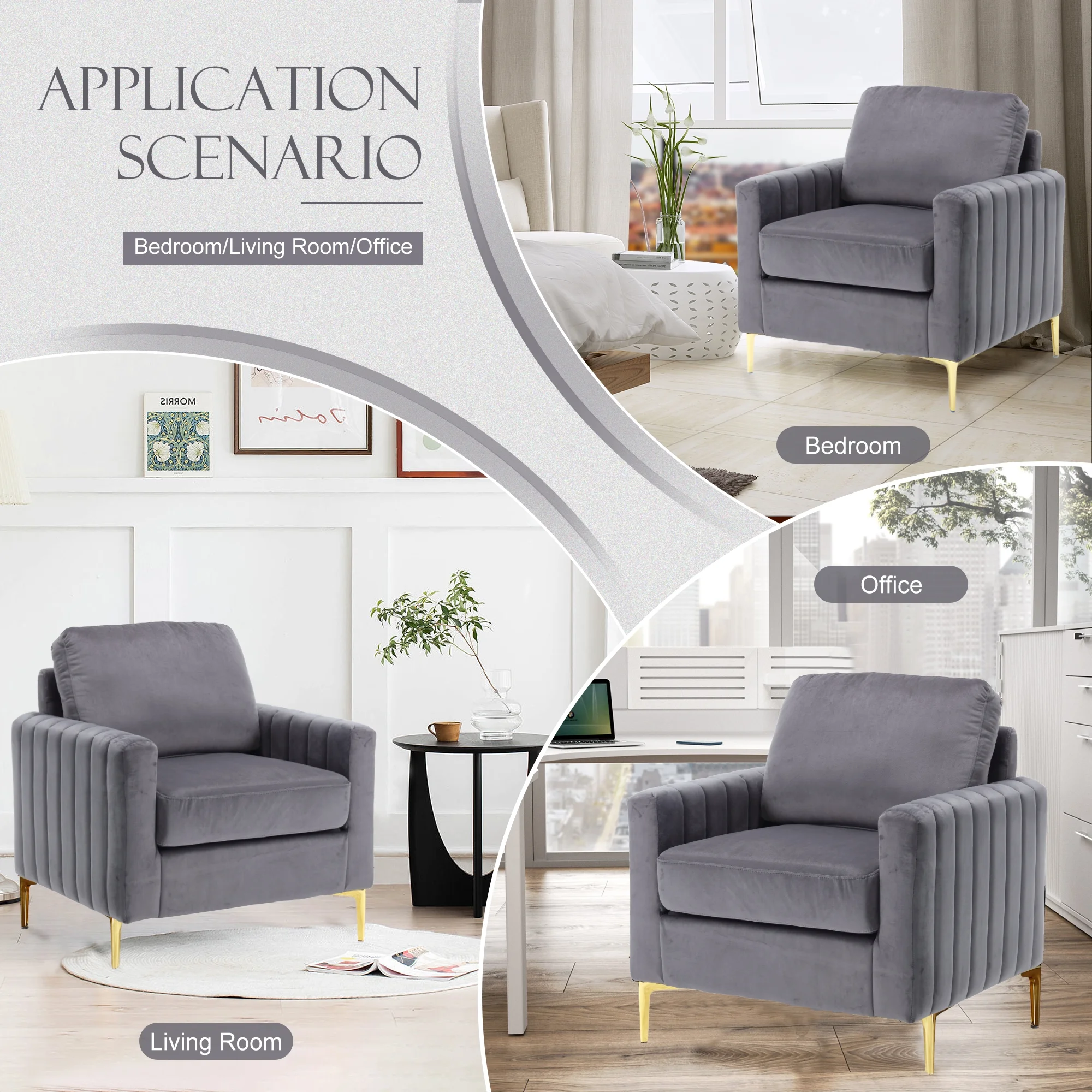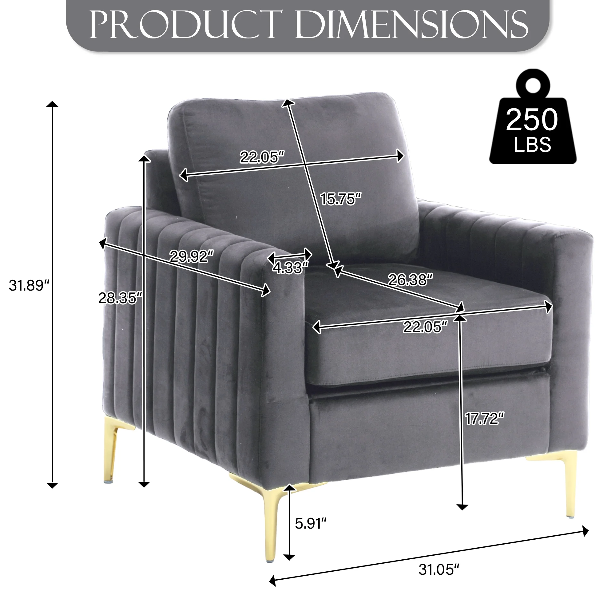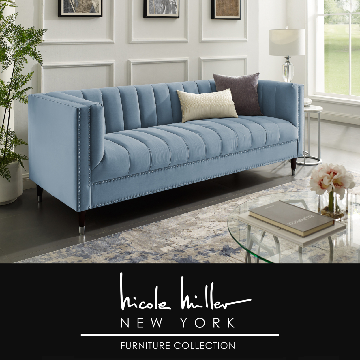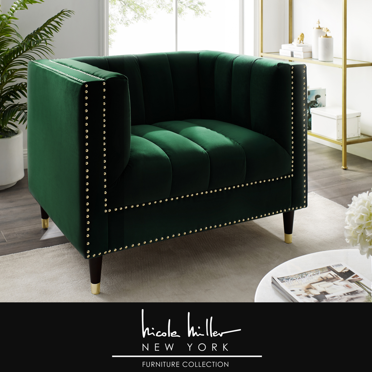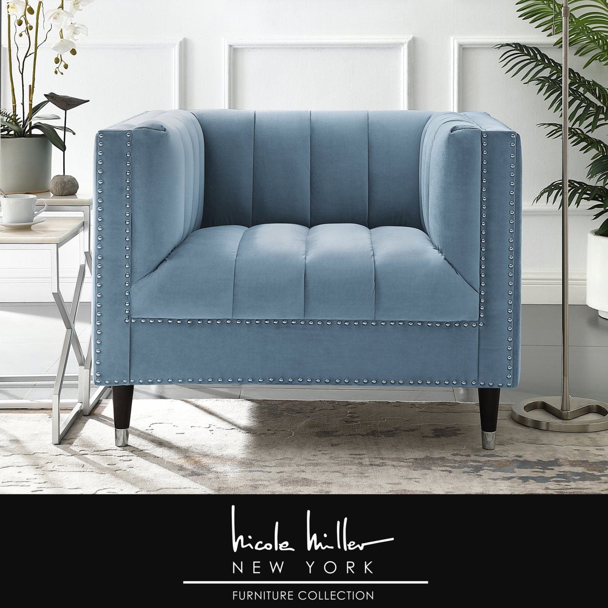 Geoffey Velvet Club Chair or Sofa-Channel Tufted-Nailhead Trim-Metal Tip Legs-By Nicole Miller