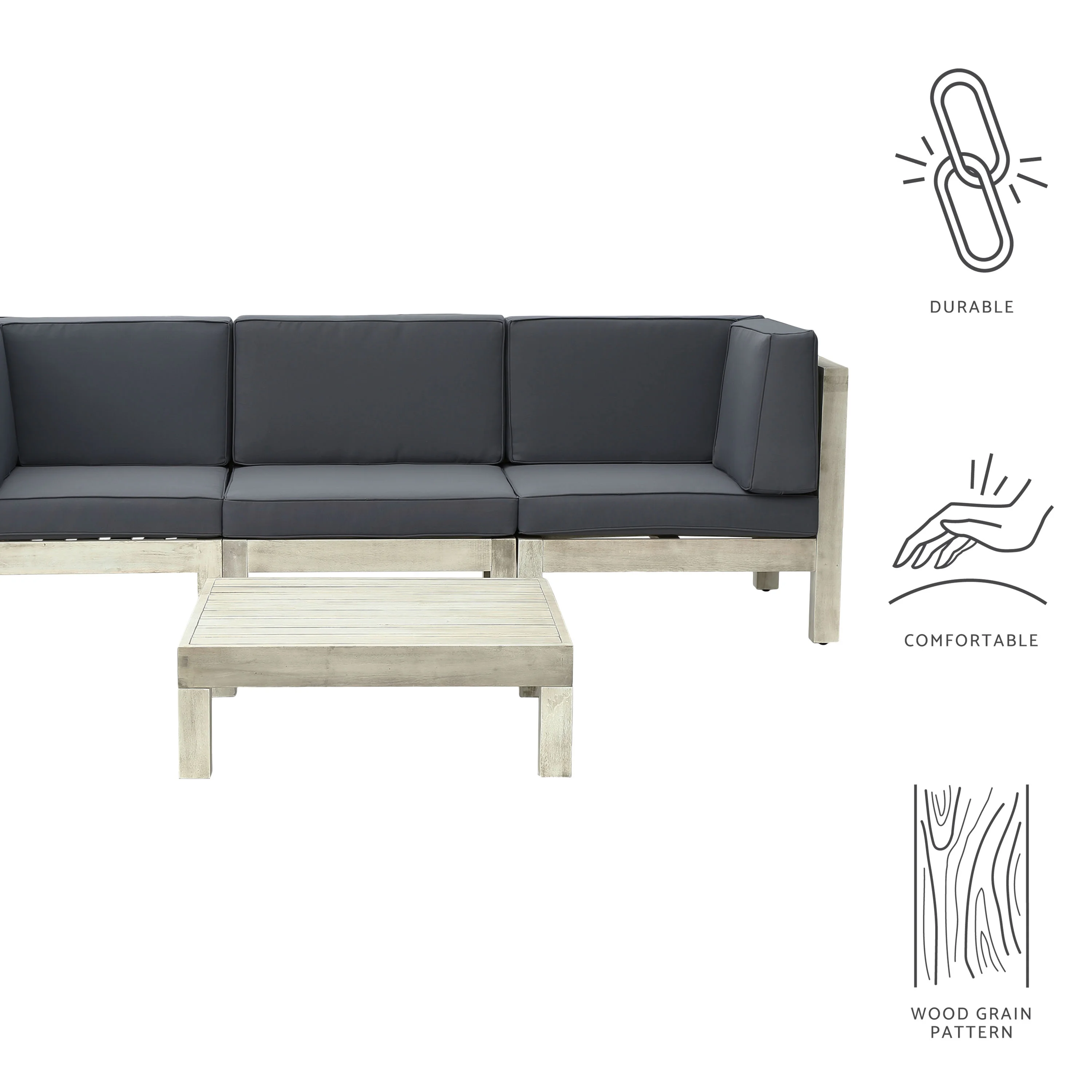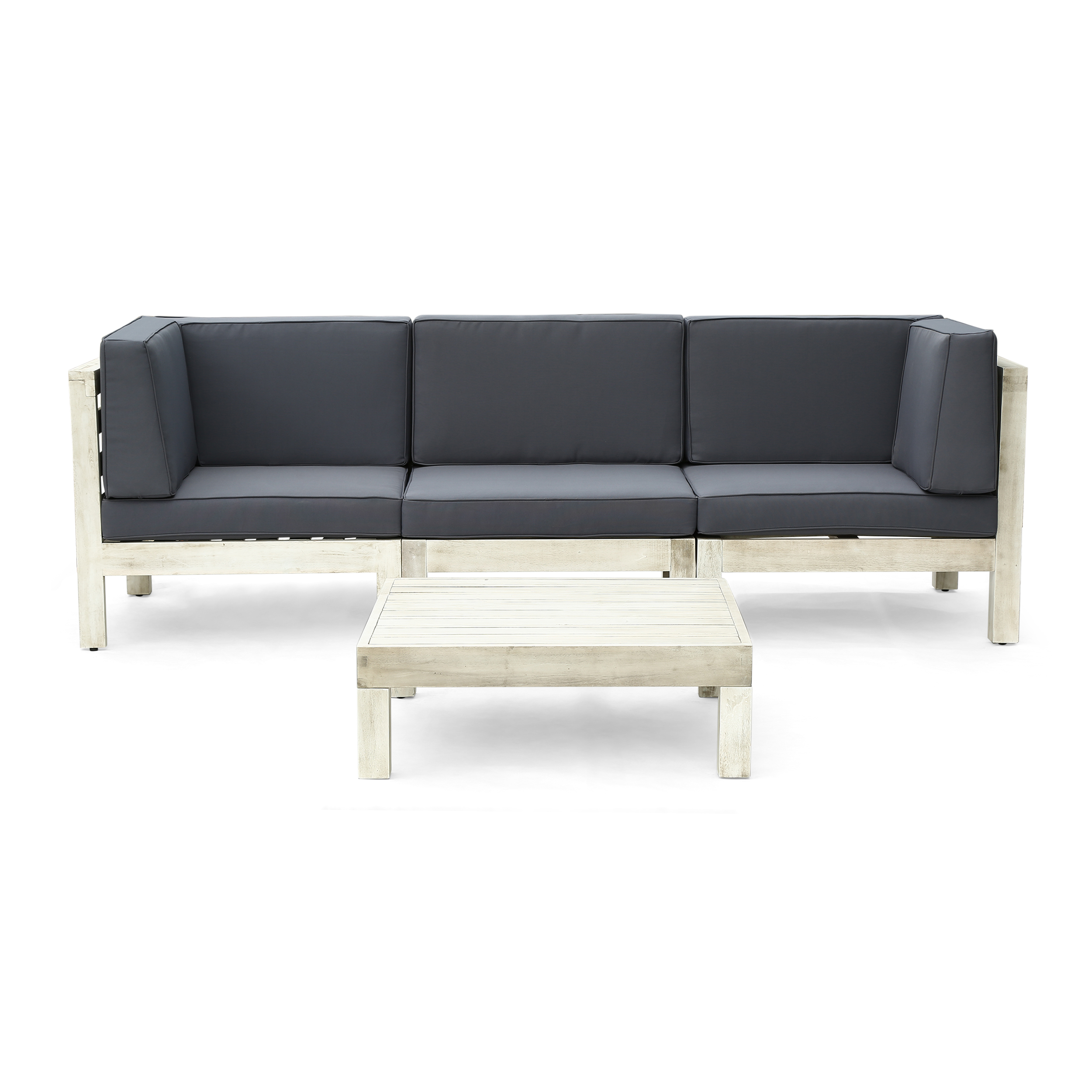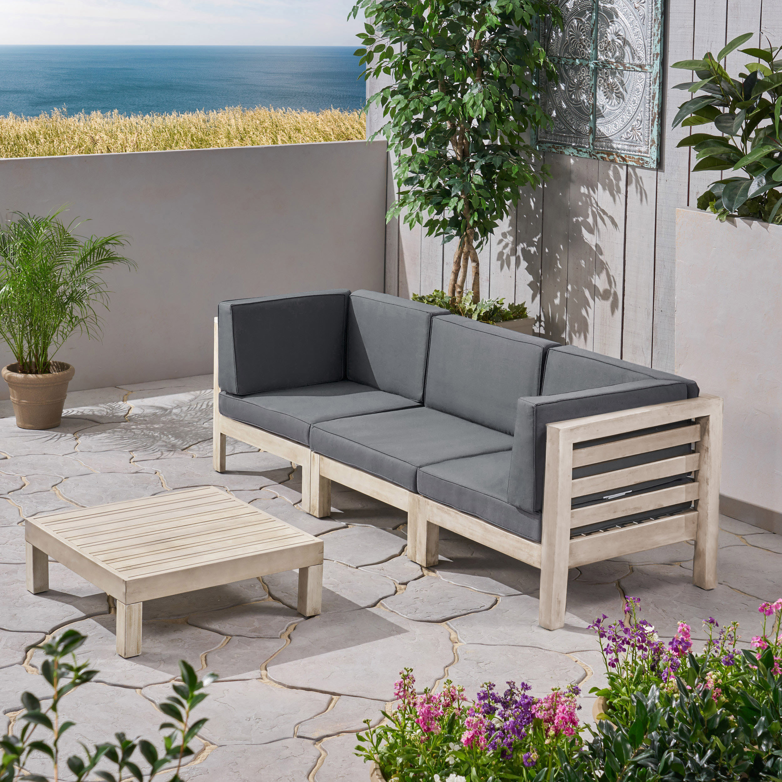 GDF Studio Dawson Outdoor Modular Acacia Wood Sofa and Table Set with Cushions, Gray