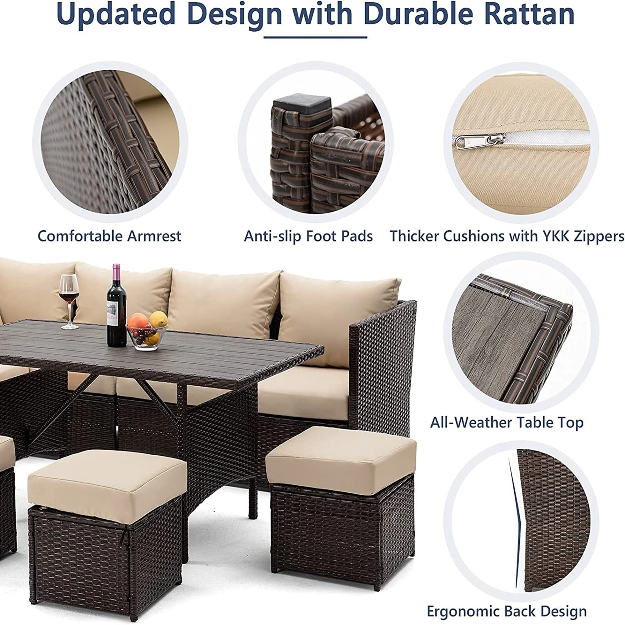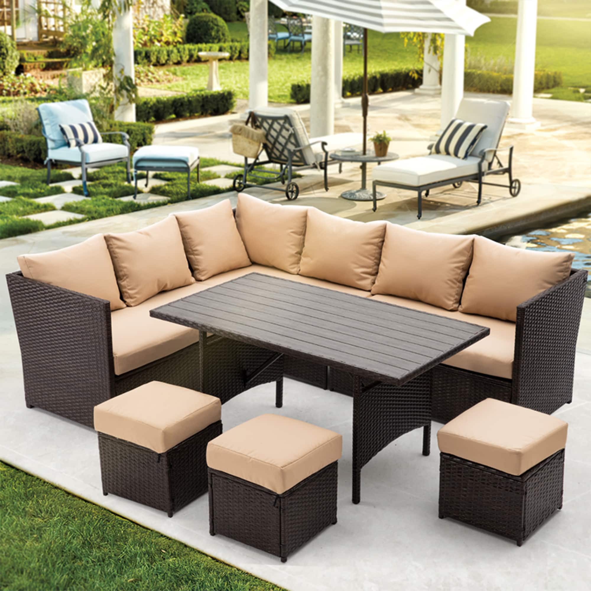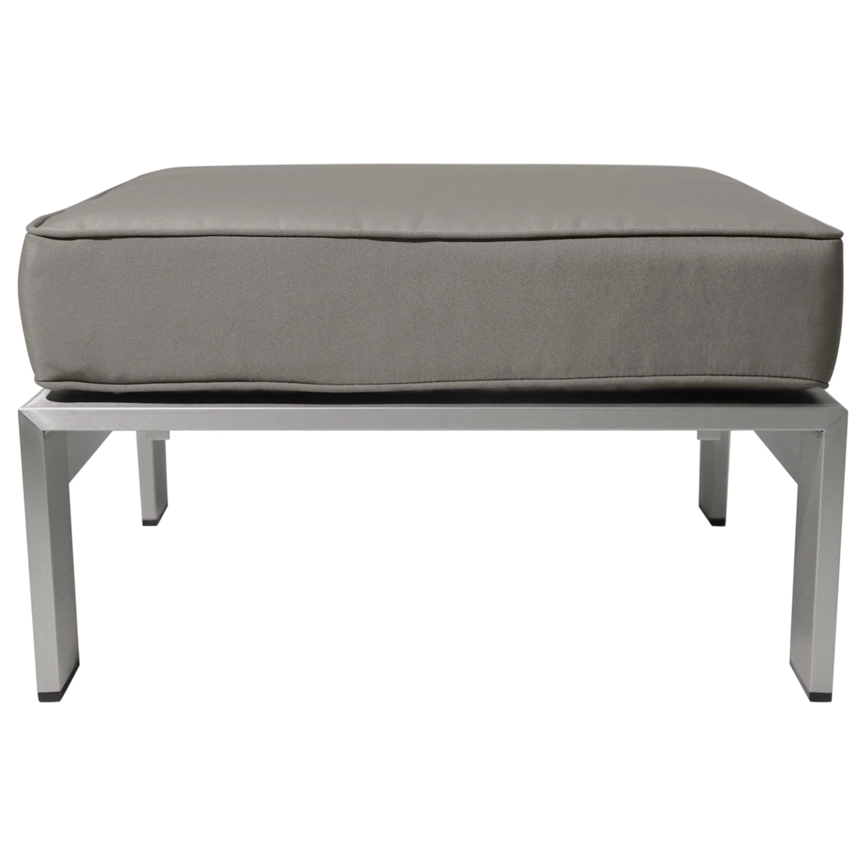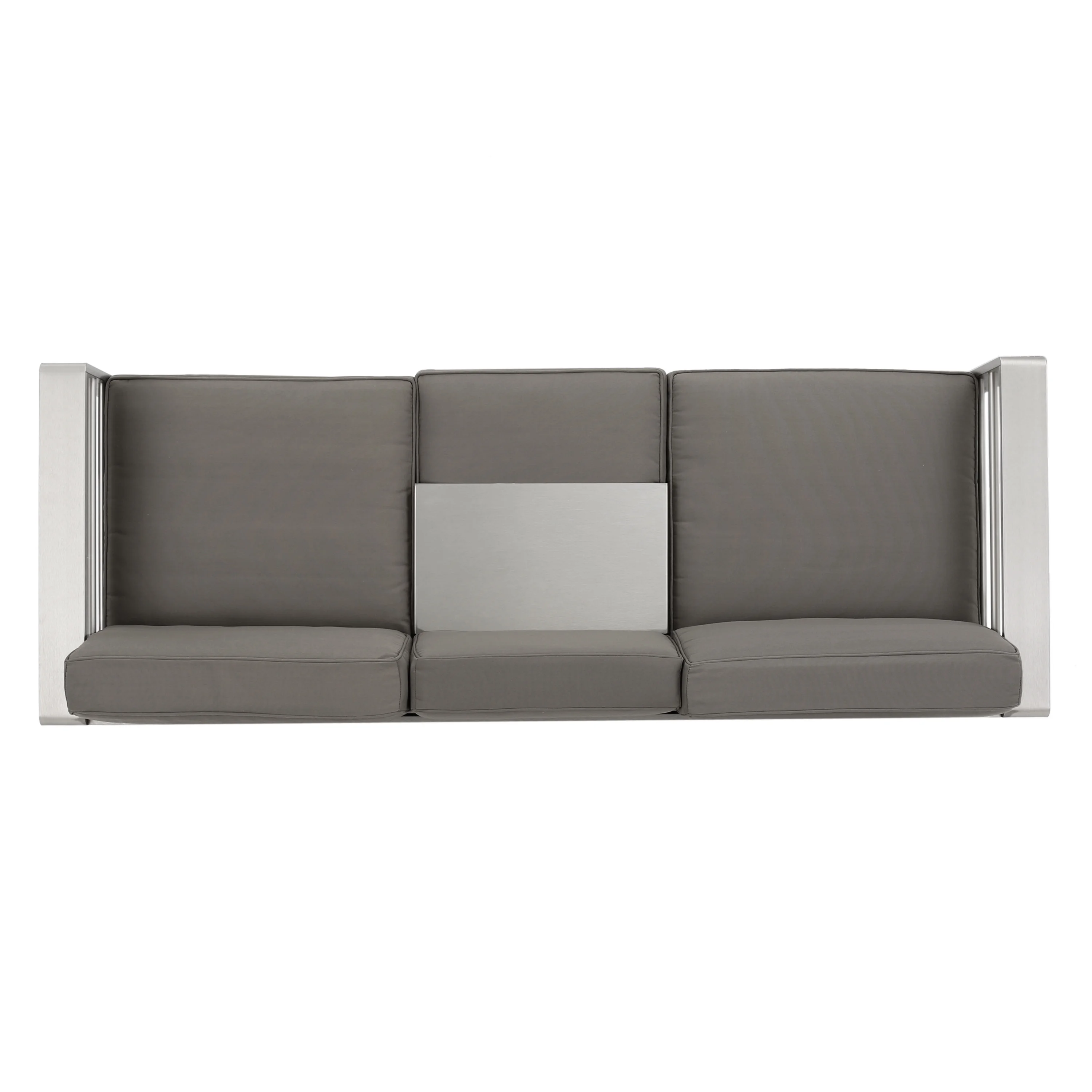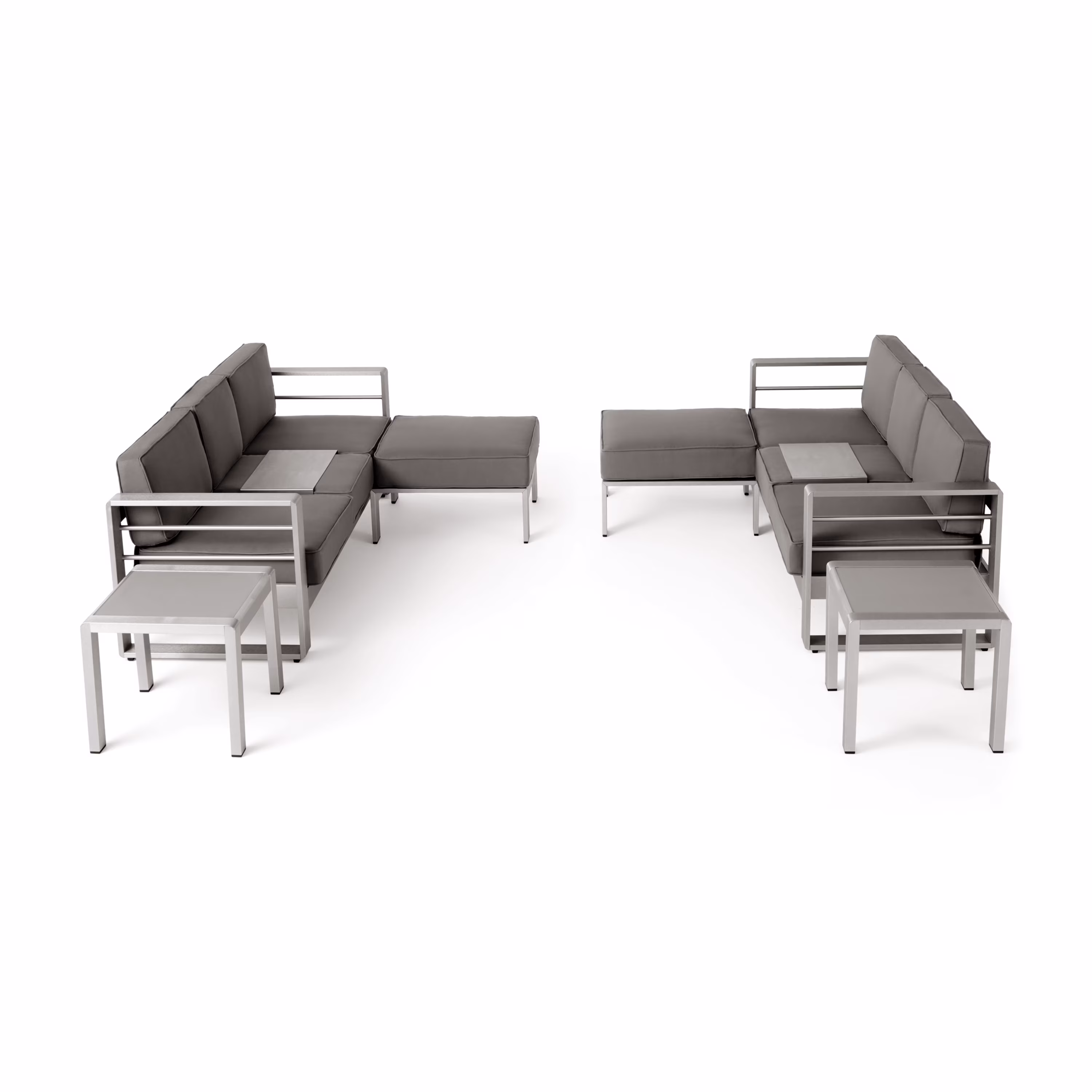 Bridget Outdoor 6 Seater Aluminum Sofa and Ottoman Set with Side Tables, Silver and Khaki