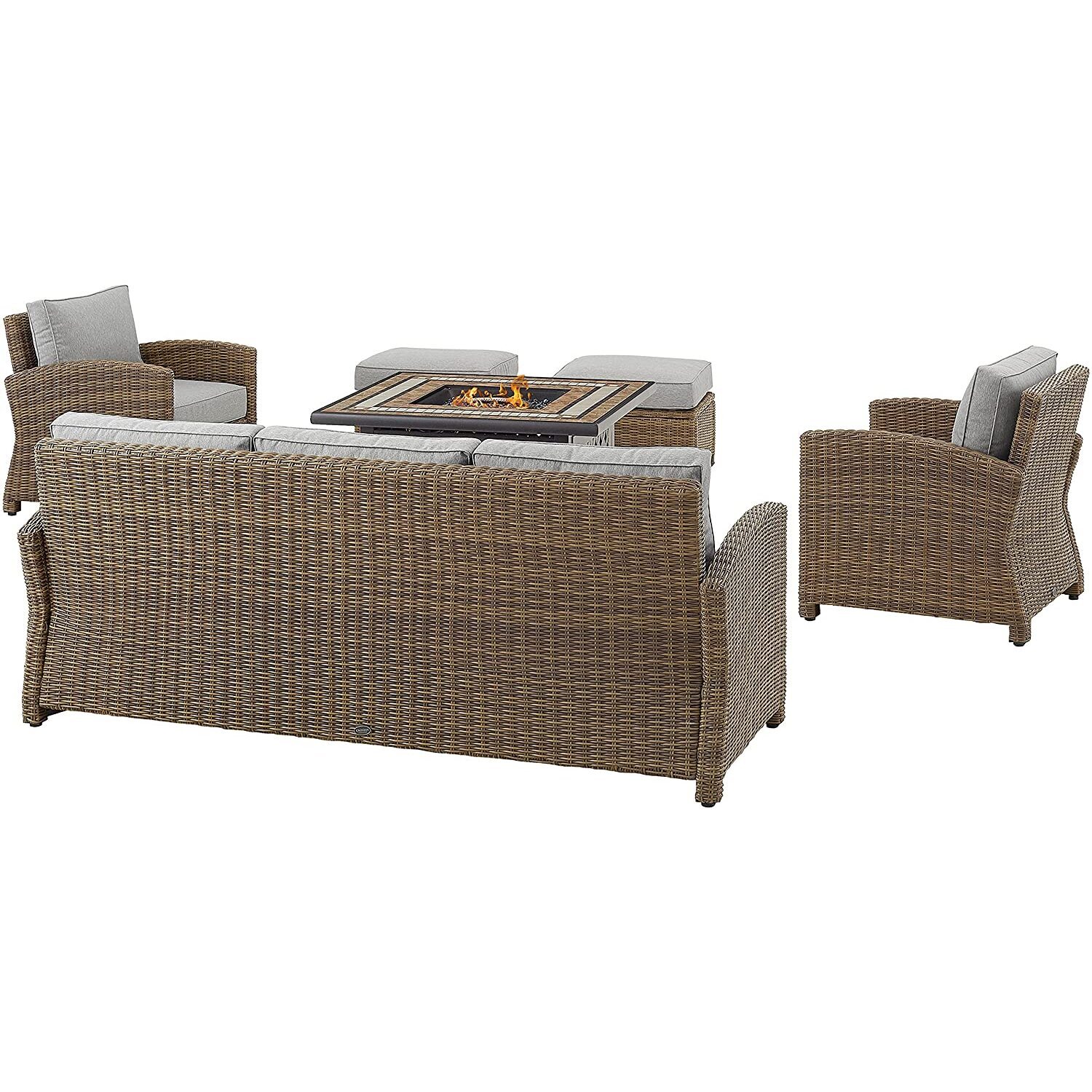 HomeStock Victorian Virtue 6Pc Outdoor Wicker Sofa Set W/Fire Table Gray/Weathered Brown - Tucson Fire Table, Sofa, 2 Armchairs & 2 Ottomans