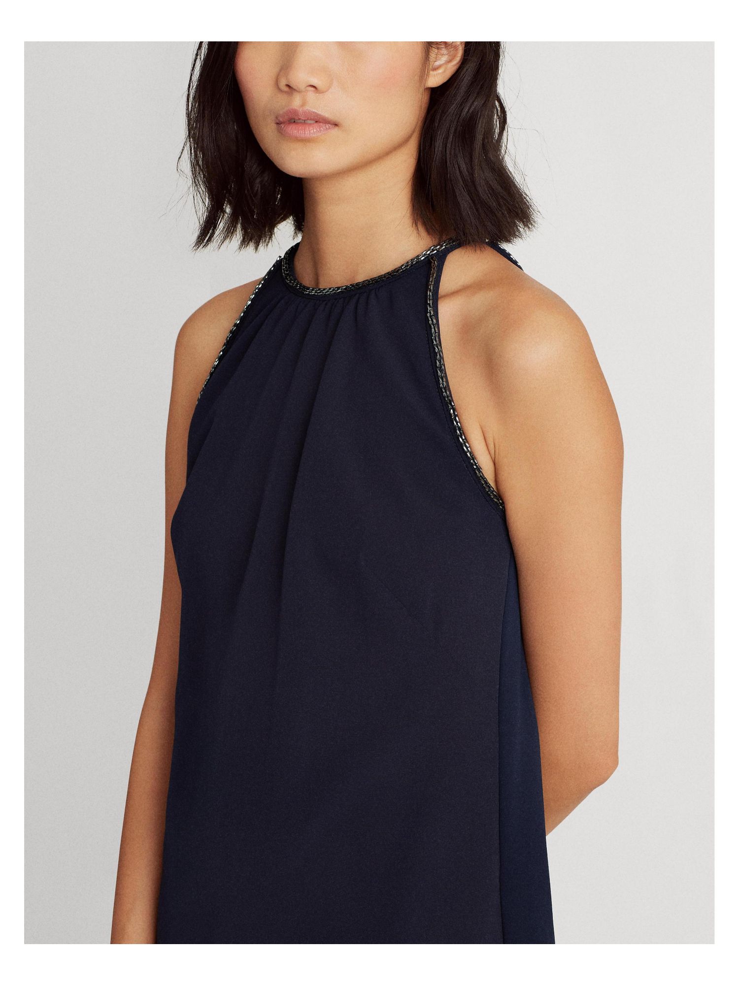 RALPH LAUREN Womens Navy Beaded Sheer Draped Side Sleeveless Crew Neck Knee Length Sheath Dress 2