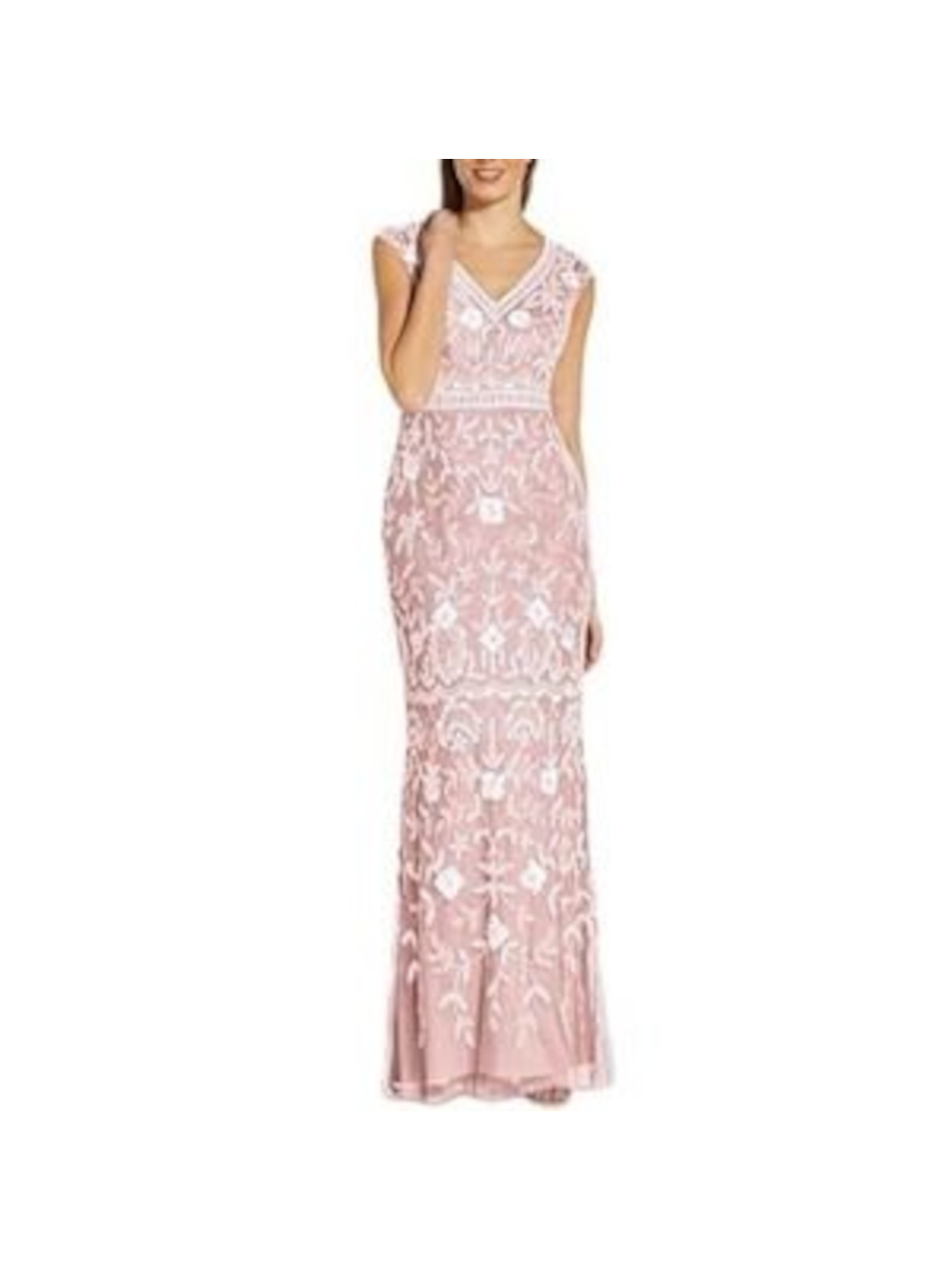 Aidan Mattox Illusion Crew Neck Cap Sleeve Zipper Back A-Line Beaded Mesh Dress-LIGHT GOLD / 10