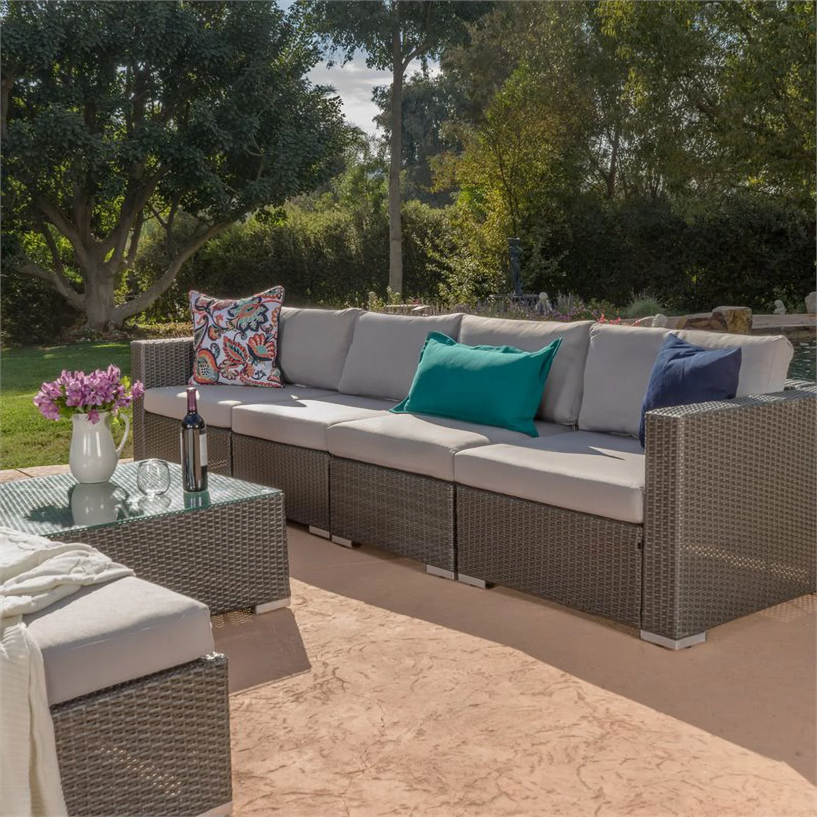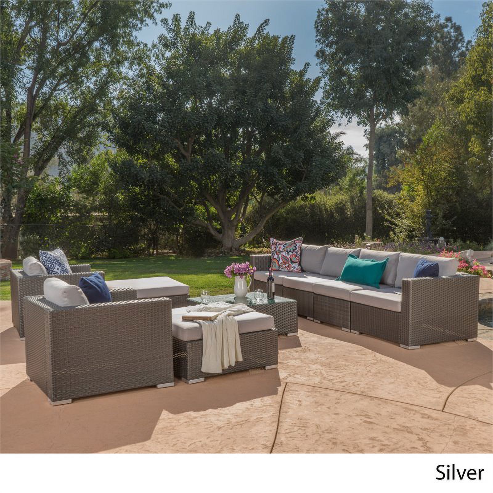 Santa Rosa 6 Seater Grey Wicker Sectional with Aluminum Frame/Silver Cushions