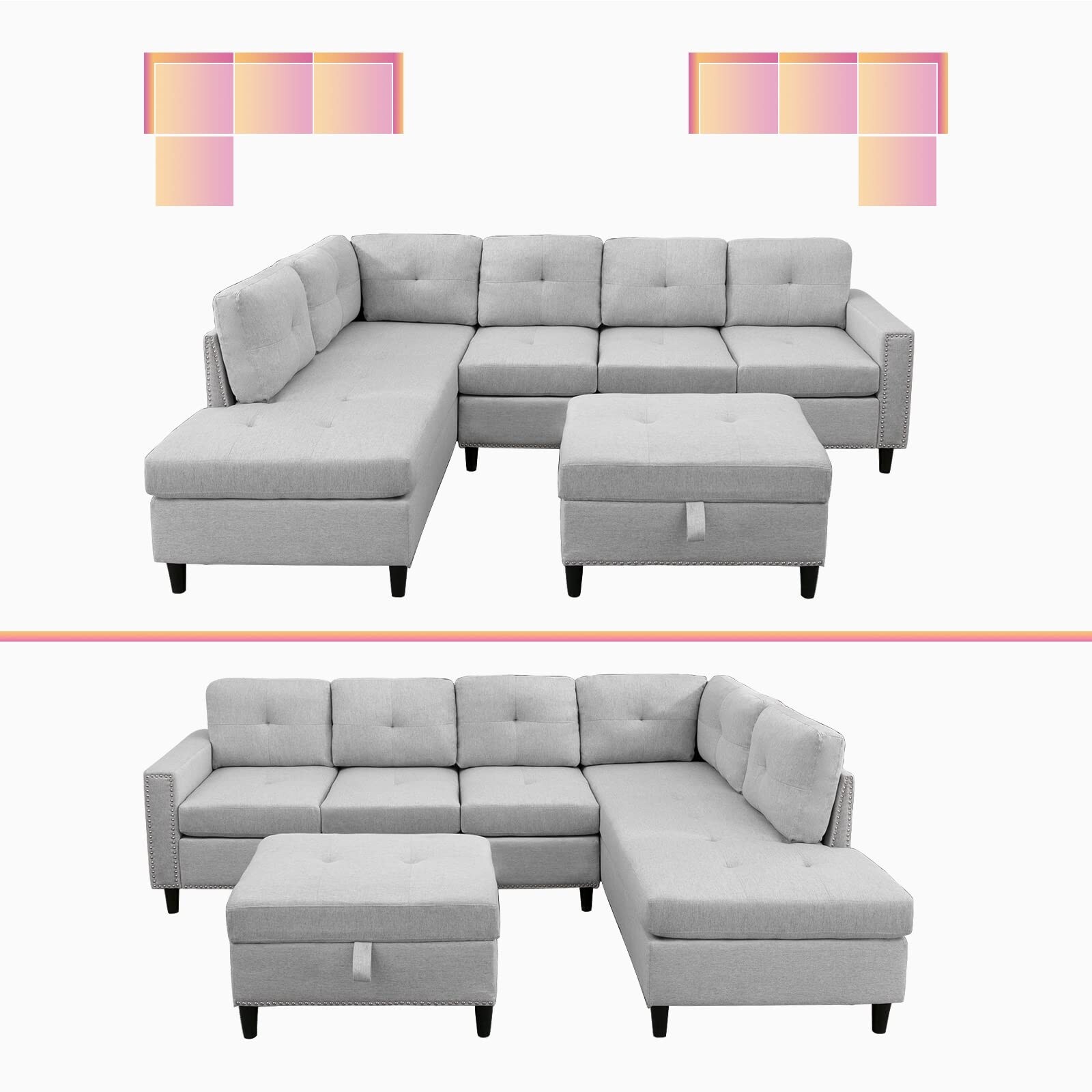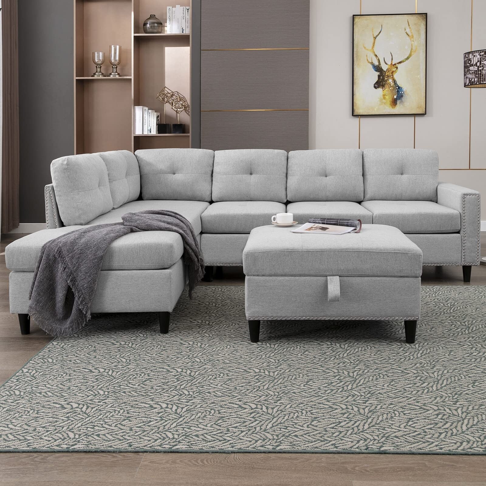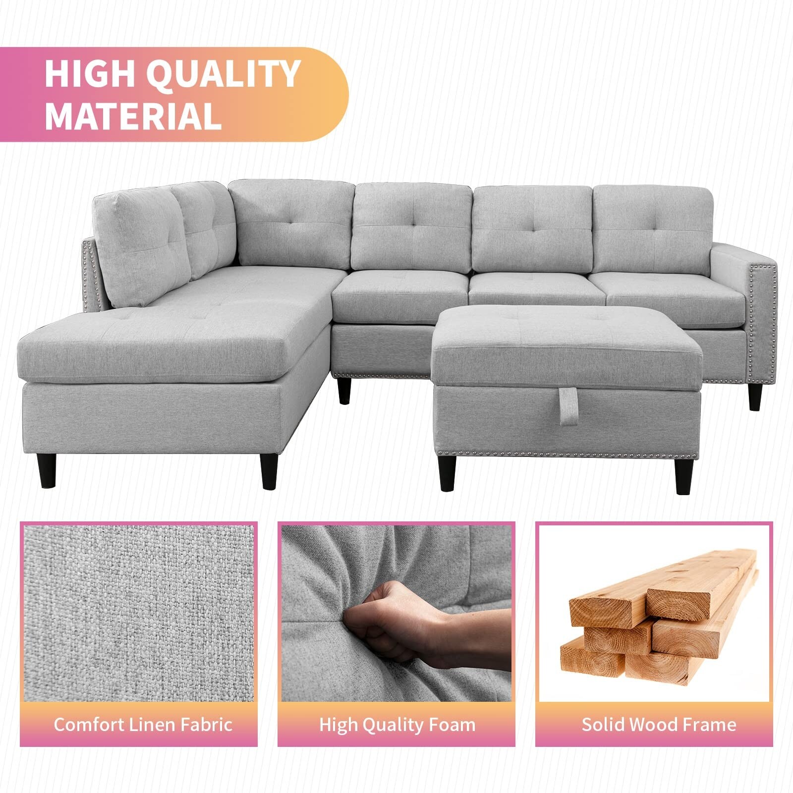 Mixoy L-Shaped Sectional Sofa with 2 Cup Holders,Storage Ottoman Light Grey